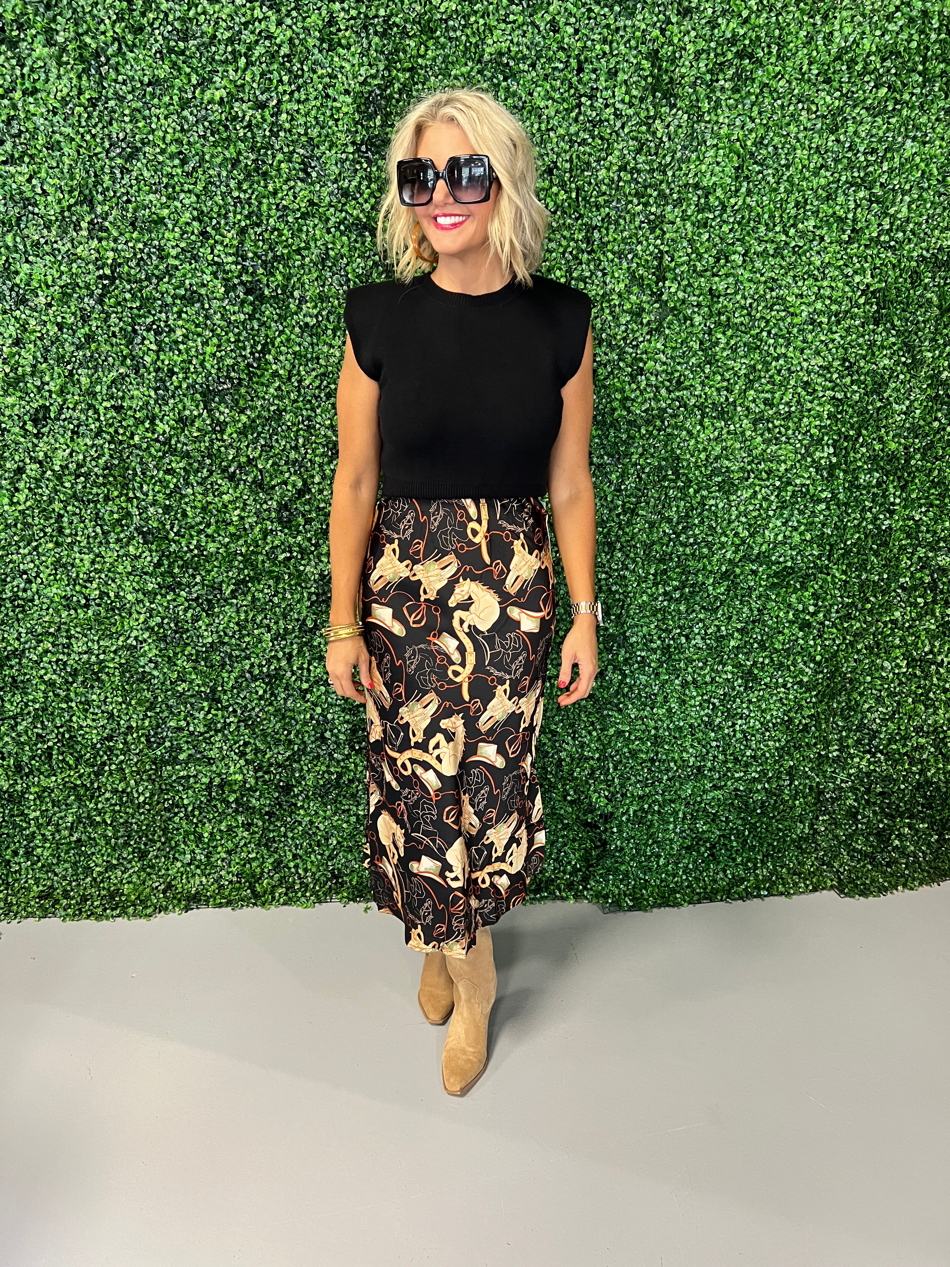 Elevate your wardrobe with the Western Print Satin Midi Slip Skirt, combining silky smooth satin with a bold, distinctive western-inspired pattern. Its flattering midi length and sleek slip design offer effortless elegance and comfort, perfect for both casual outings and special occasions. Embrace a stylish blend of classic and modern that moves with you, making every step a statement.