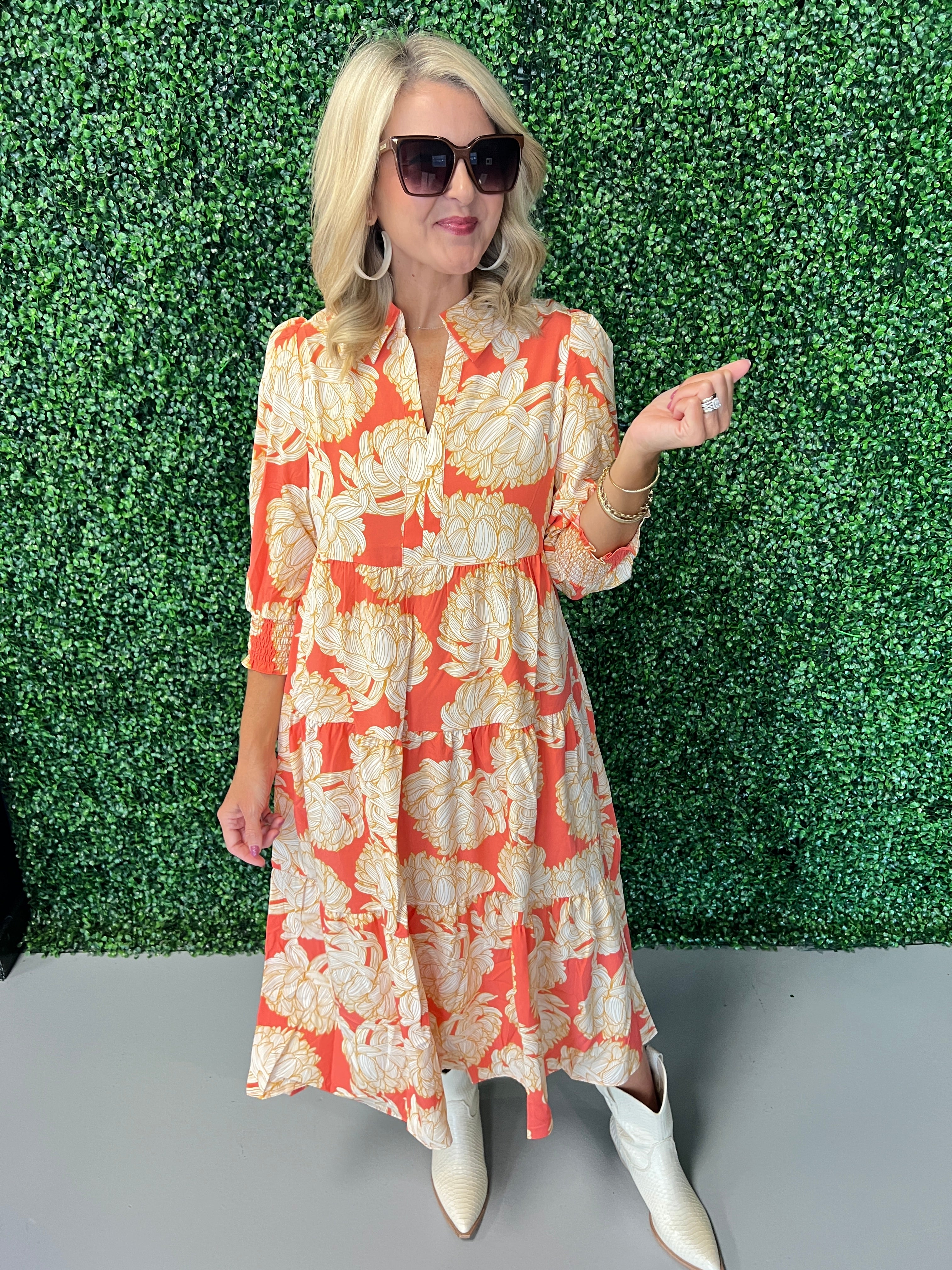 Embrace autumn elegance with the Eleanor Fall Floral Dress. Featuring a rich floral pattern inspired by fall’s vibrant hues, this dress blends comfort with style for effortless seasonal charm. Its flattering silhouette and soft fabric make it perfect for day-to-night wear, ensuring you feel confident and polished wherever you go. Add a touch of warmth and grace to your wardrobe with this timeless dress designed to celebrate the beauty of fall.