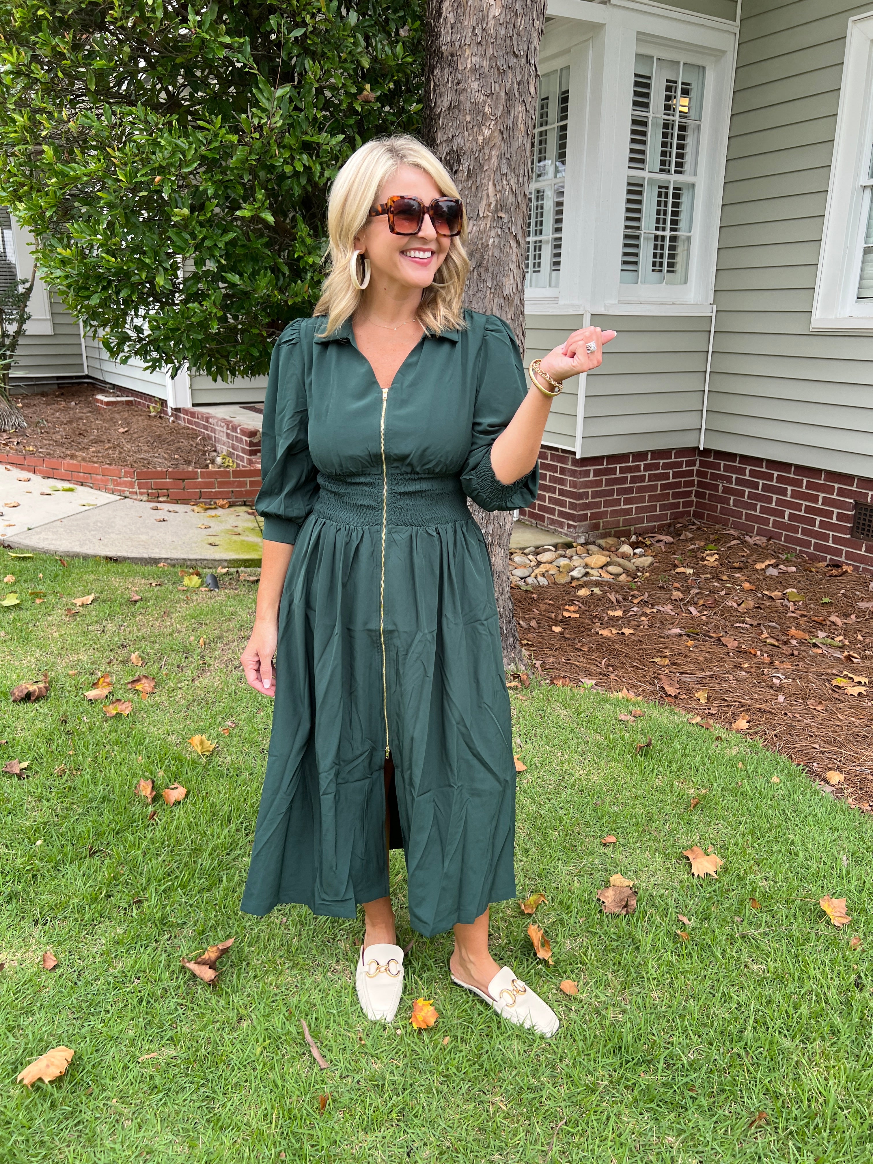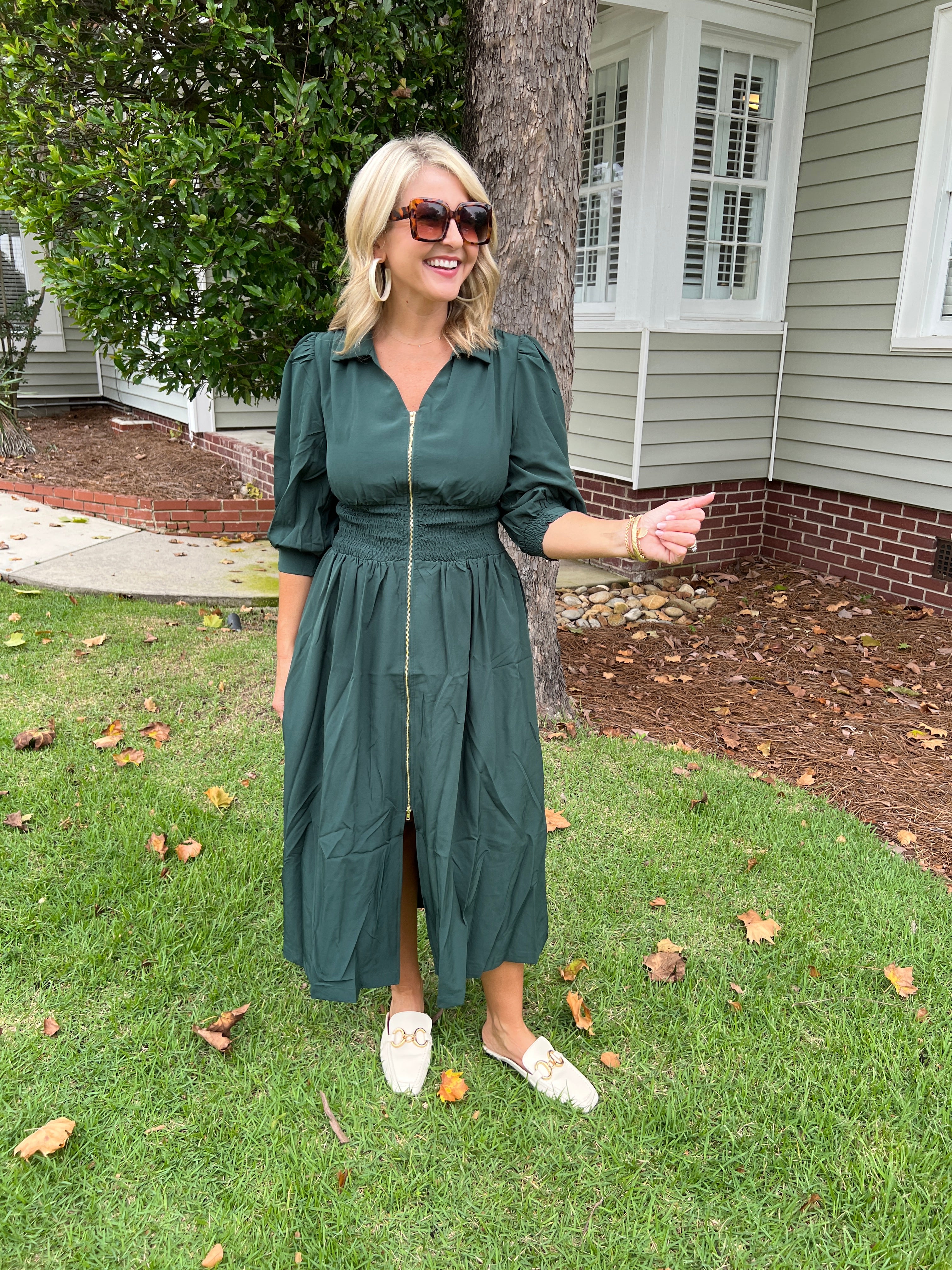 Elevate your wardrobe with this Smocked Waist Midi Dress featuring a sleek front zip for easy wear. The smocked waist enhances your silhouette, offering both comfort and style. Its midi length balances elegance and versatility, making it perfect for day-to-night occasions. Step out confidently in a dress designed to flatter and function effortlessly.