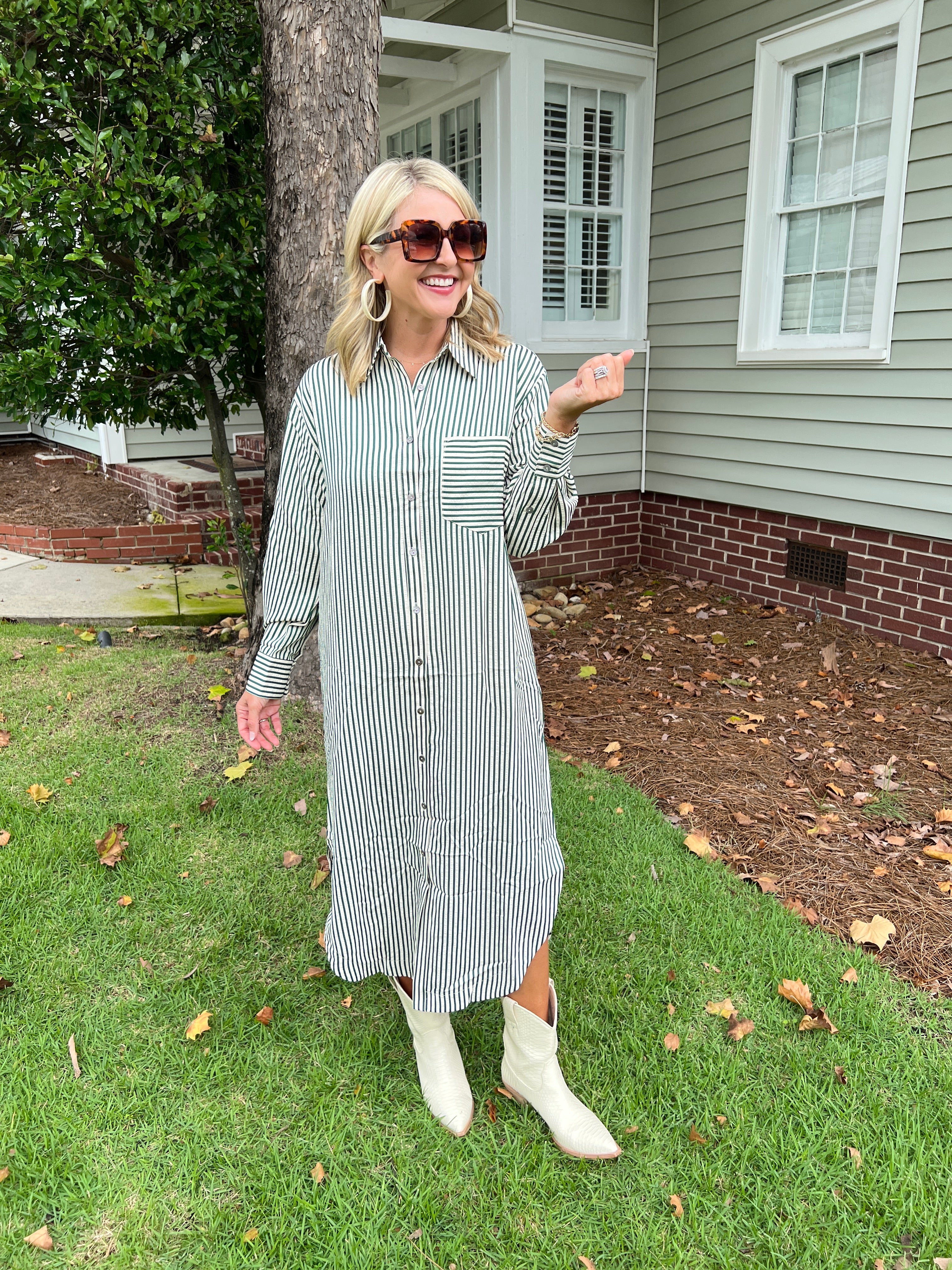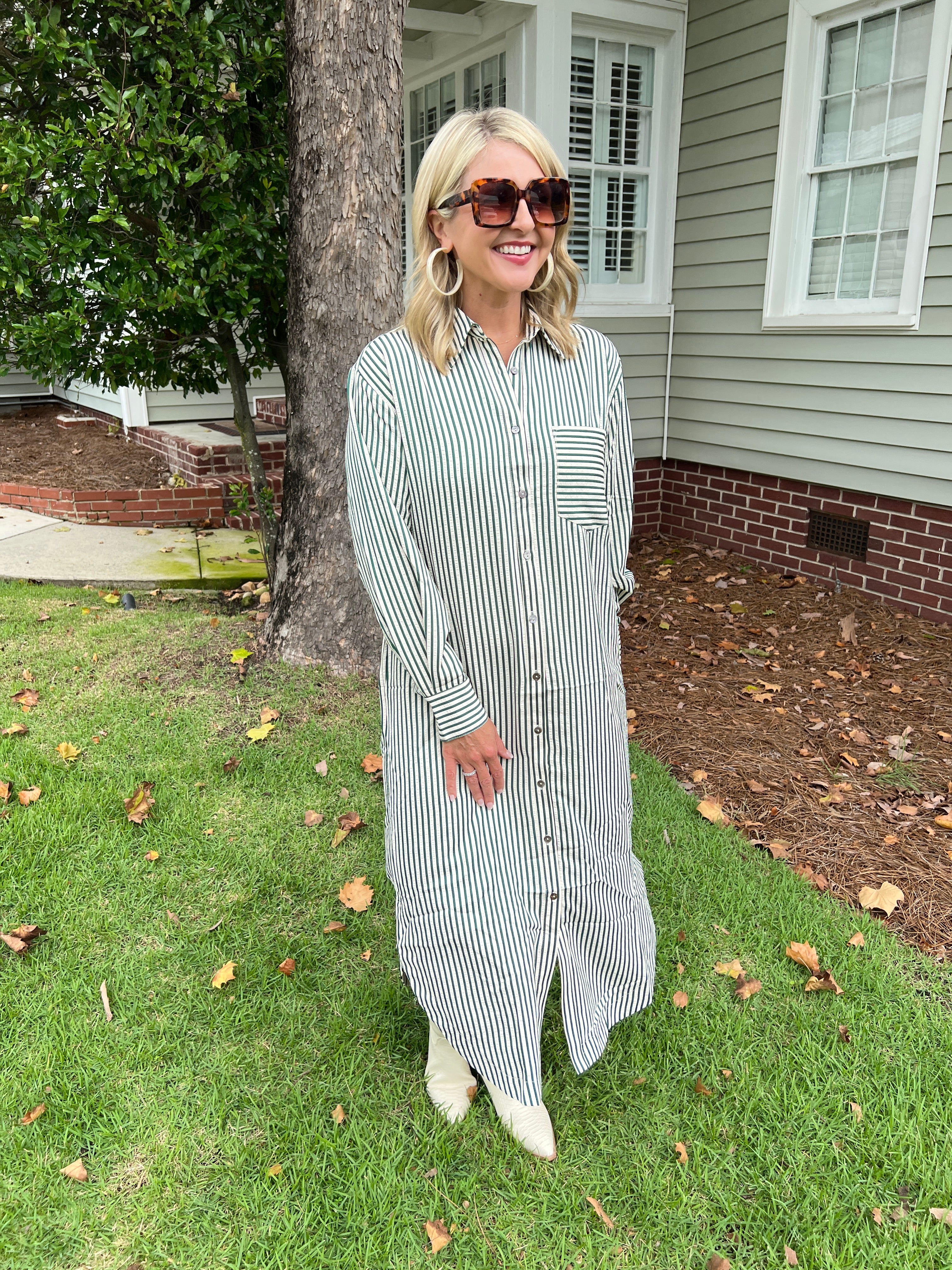 Elevate your wardrobe with the Textured Stripe Midi Shirt Dress, designed for effortless style and comfort. Its subtle textured stripes add depth and sophistication, while the midi length offers a flattering silhouette perfect for any occasion. Crafted for easy wear, this dress balances classic shirt details with modern flair, making it an ideal choice for day-to-night looks. Embrace confidence and timeless elegance with this versatile dress that moves seamlessly from office meetings to weekend outings.
