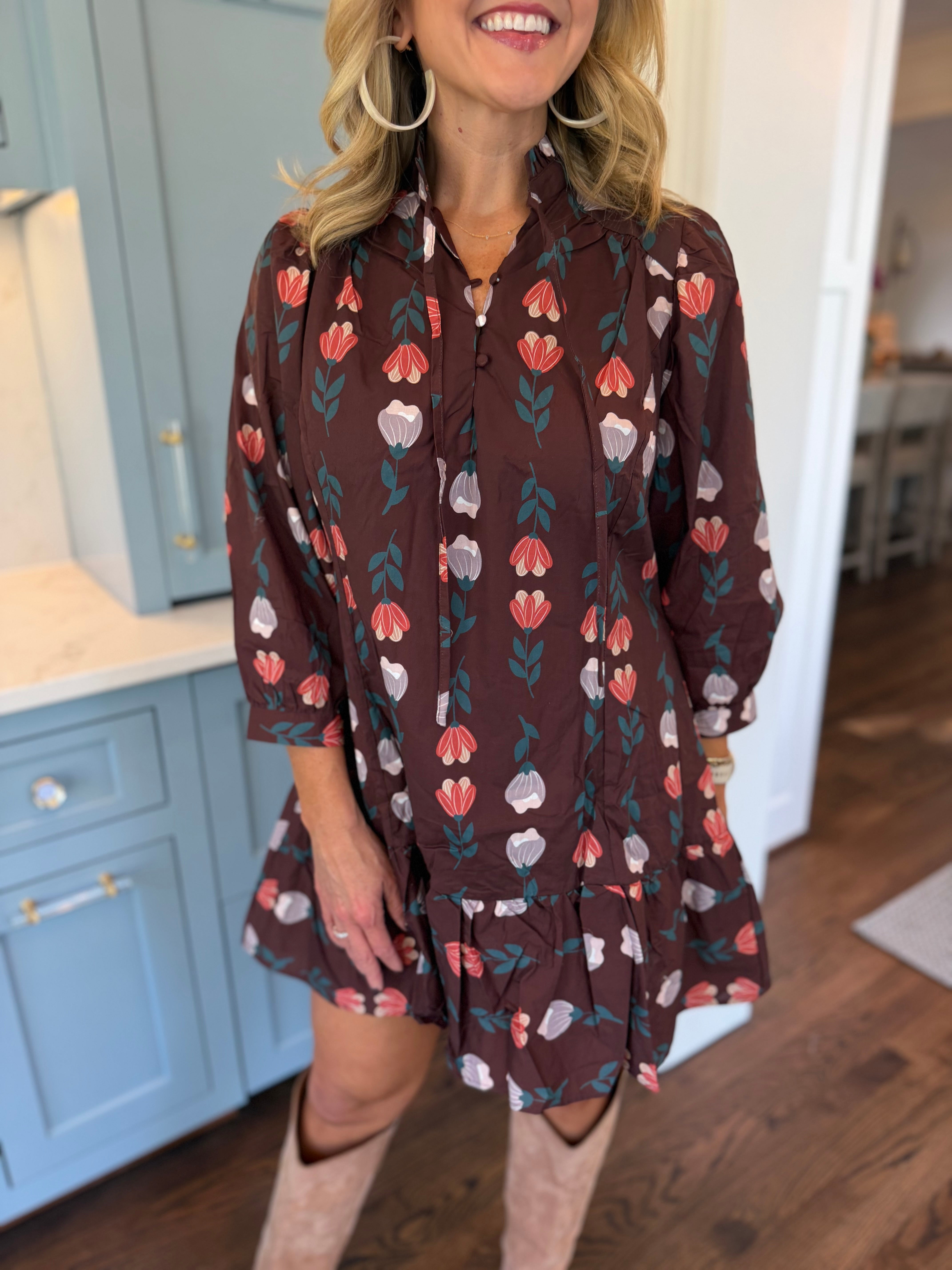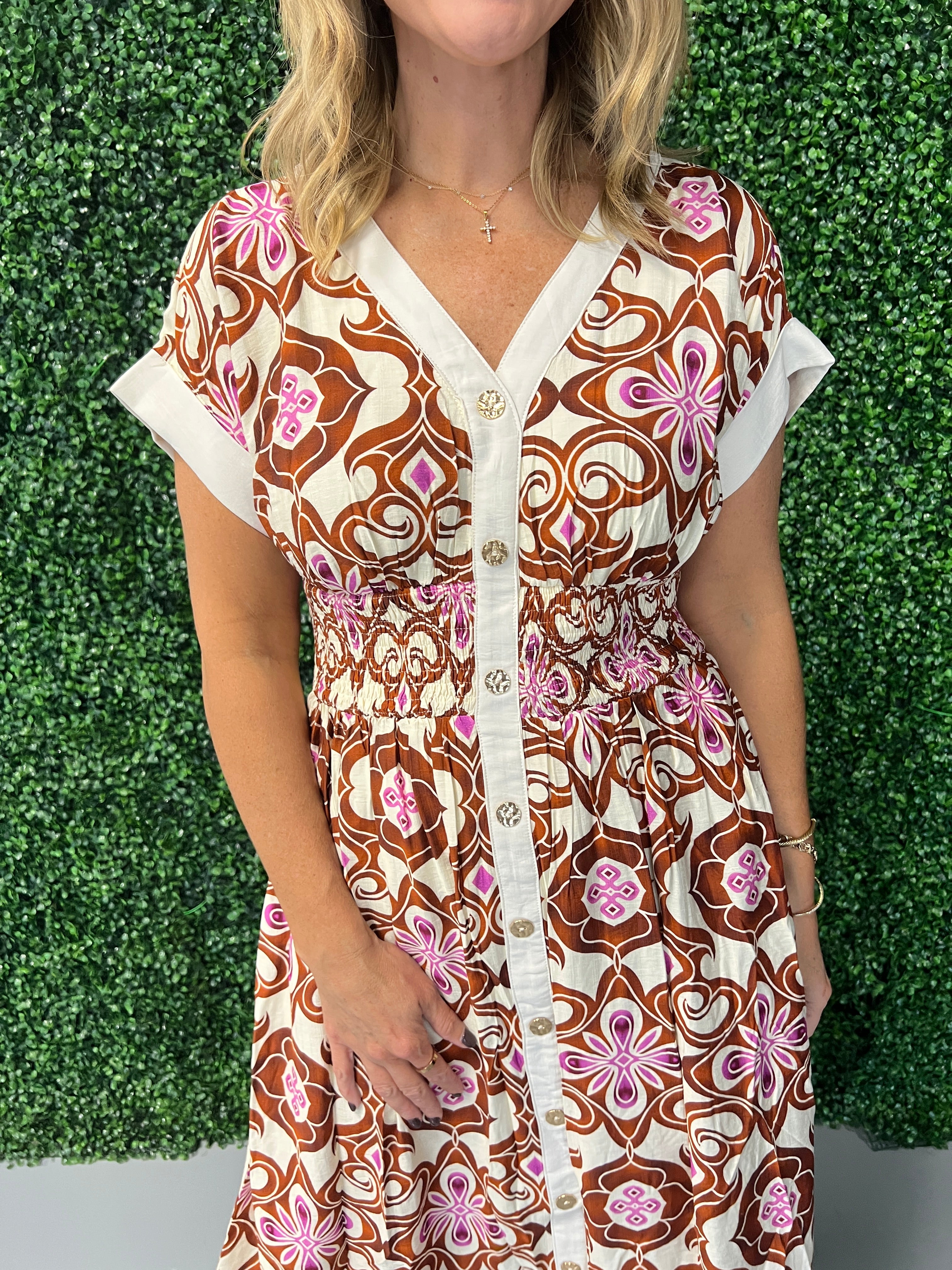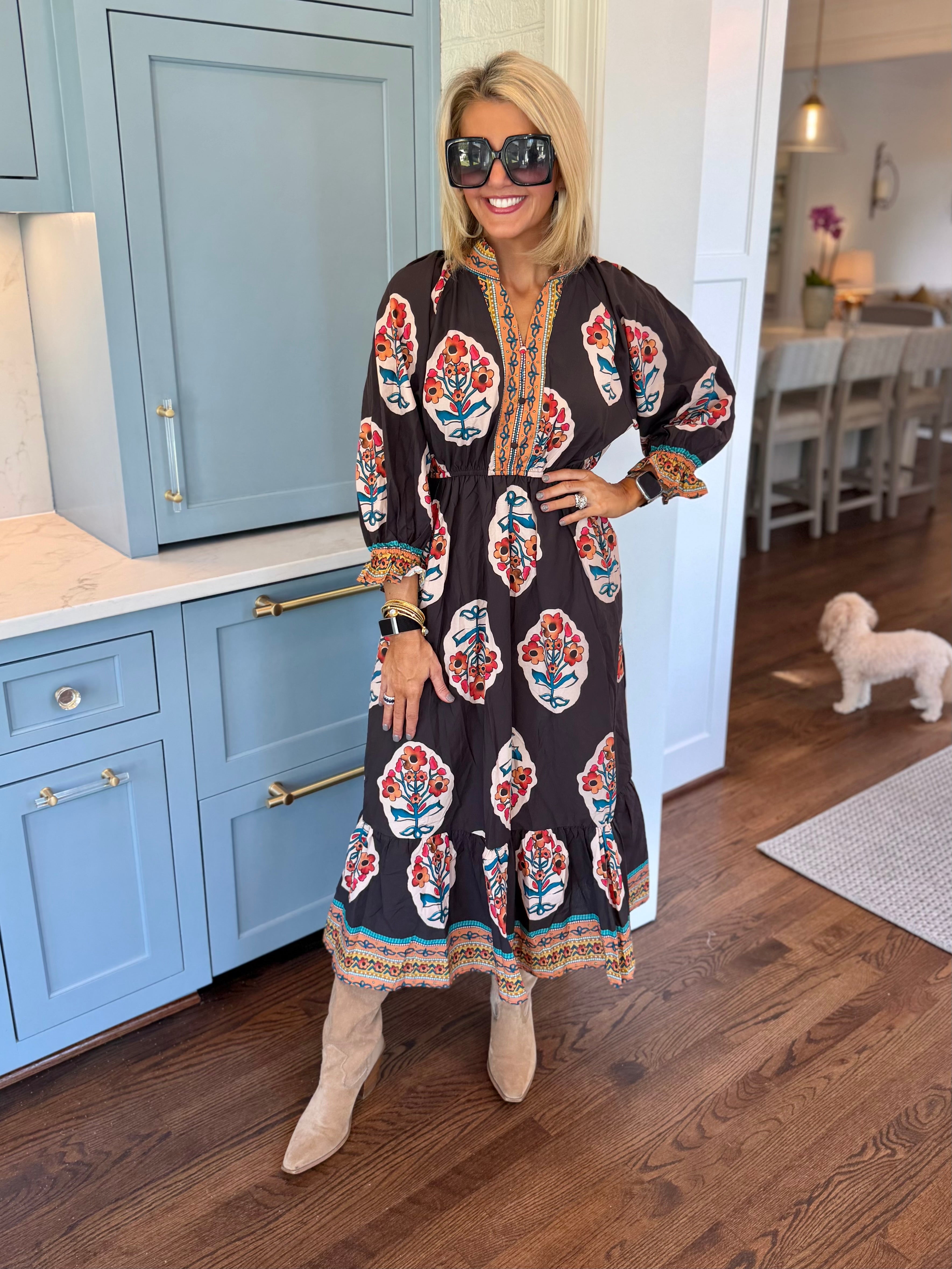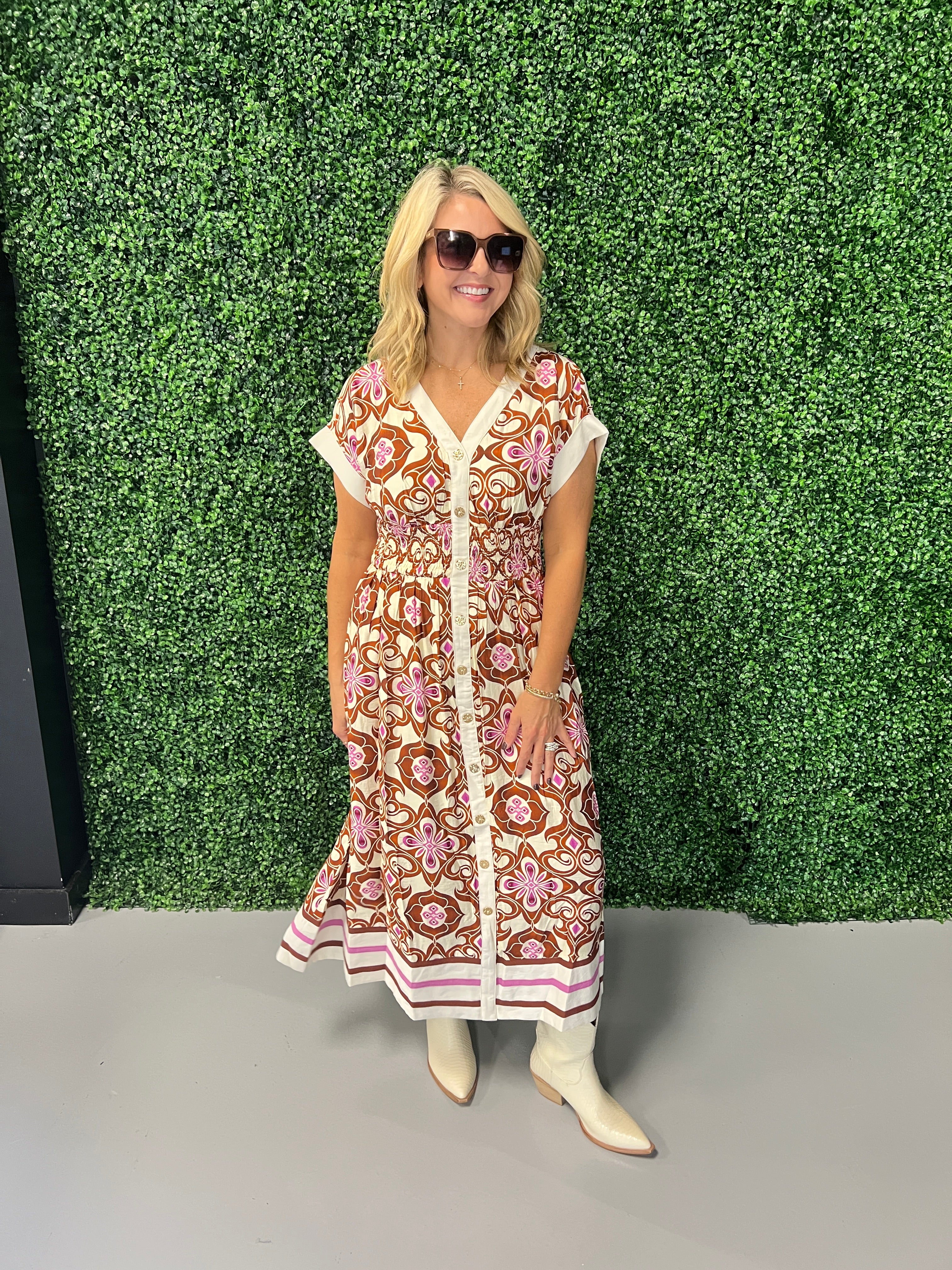 Brown Flower Patch Border Print V-Neck Midi Dress