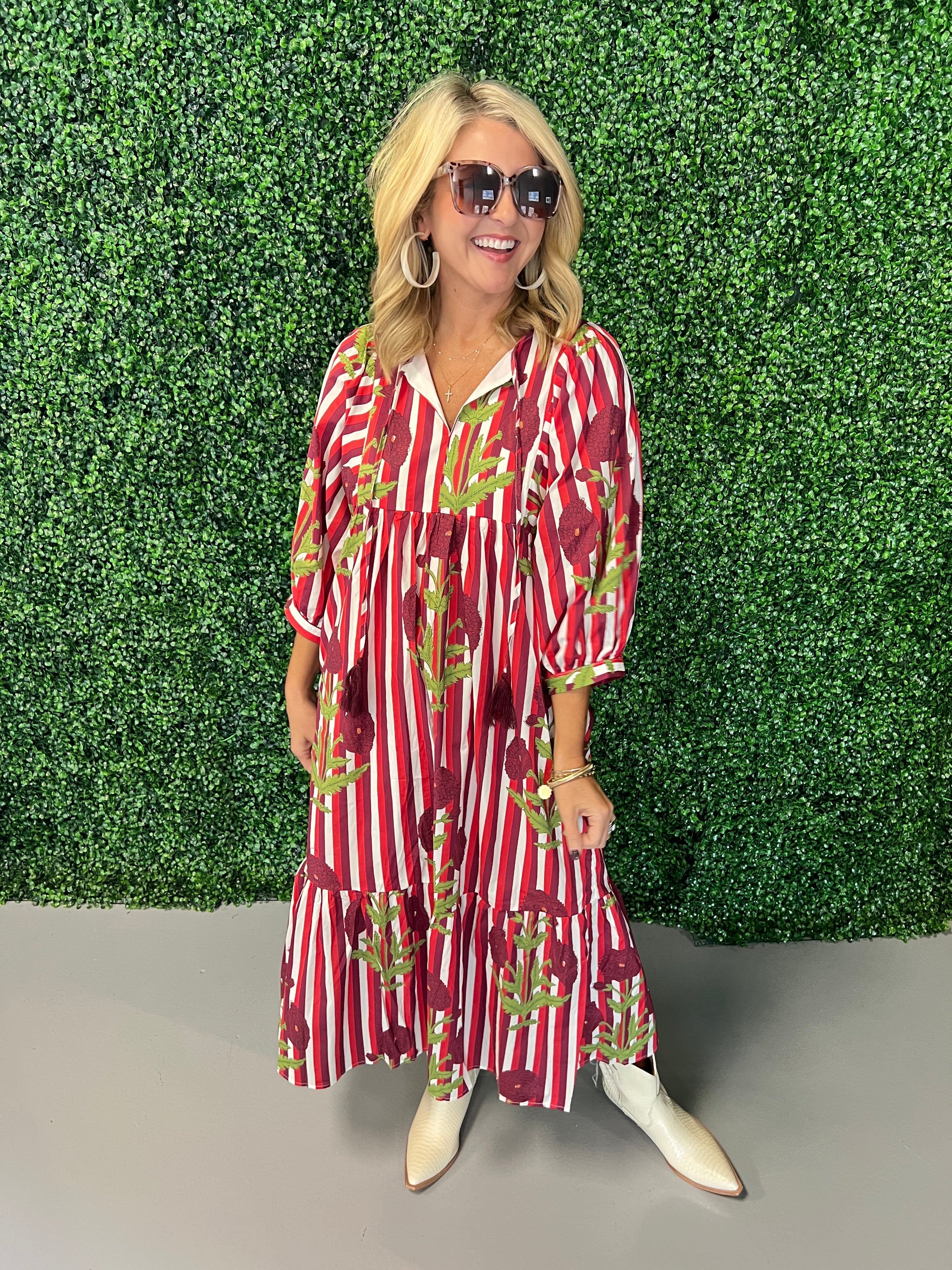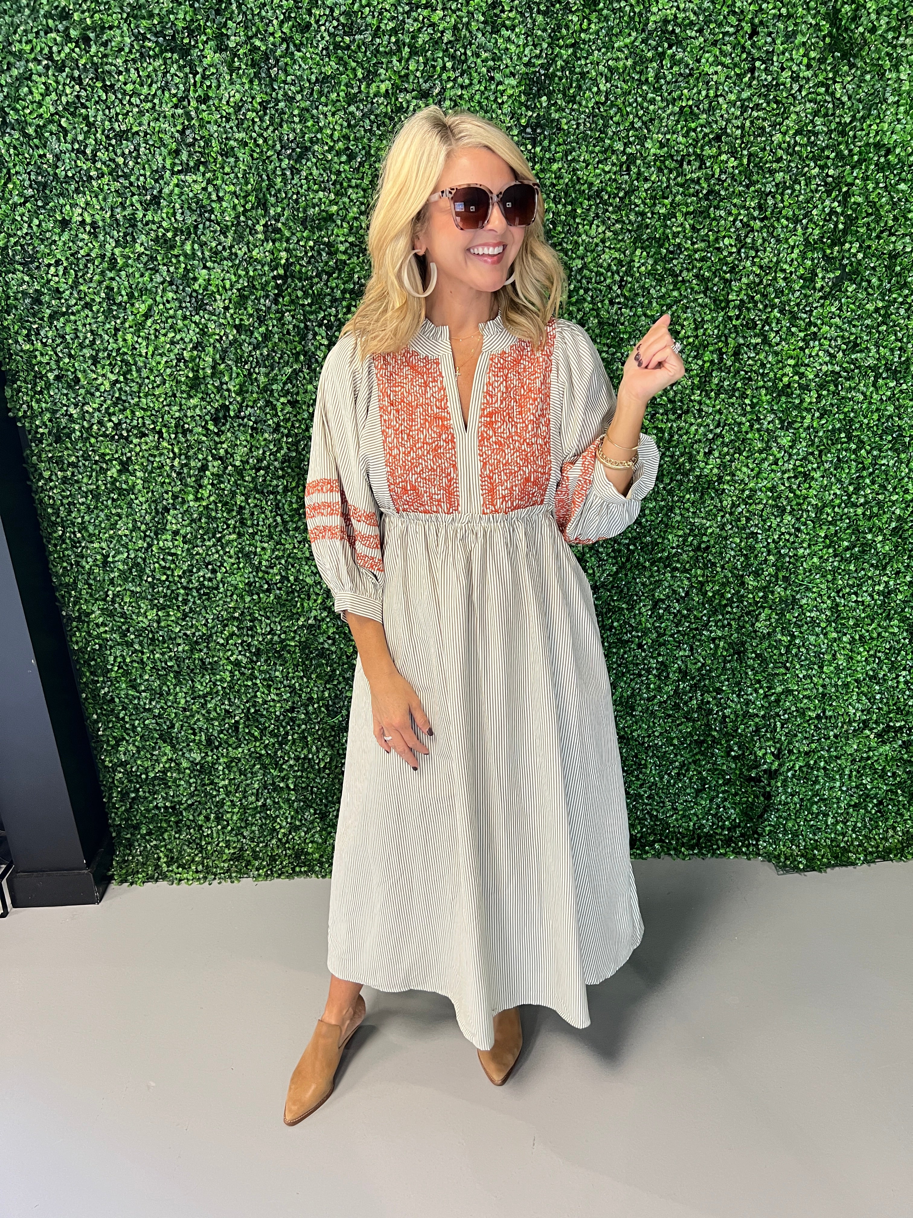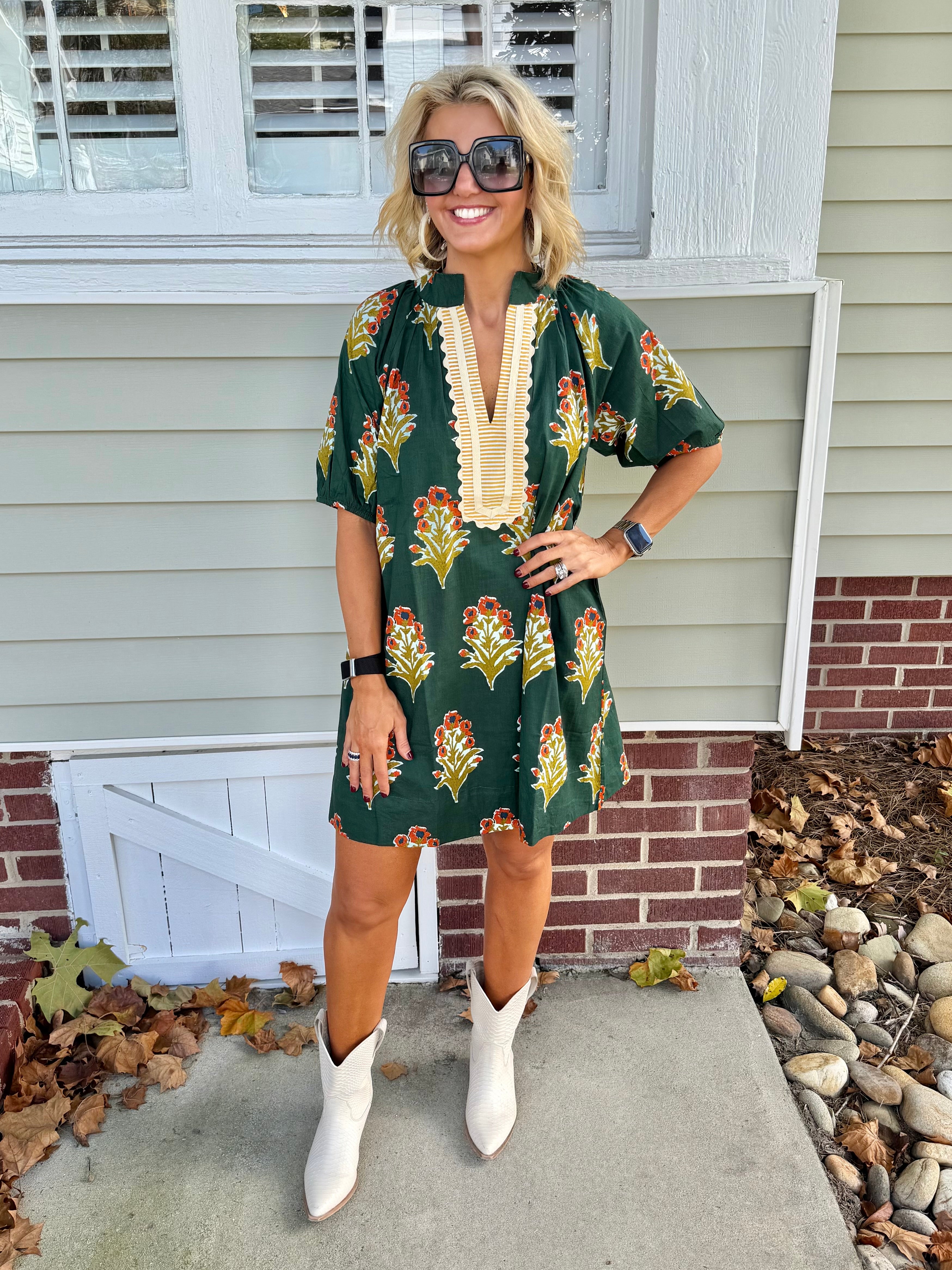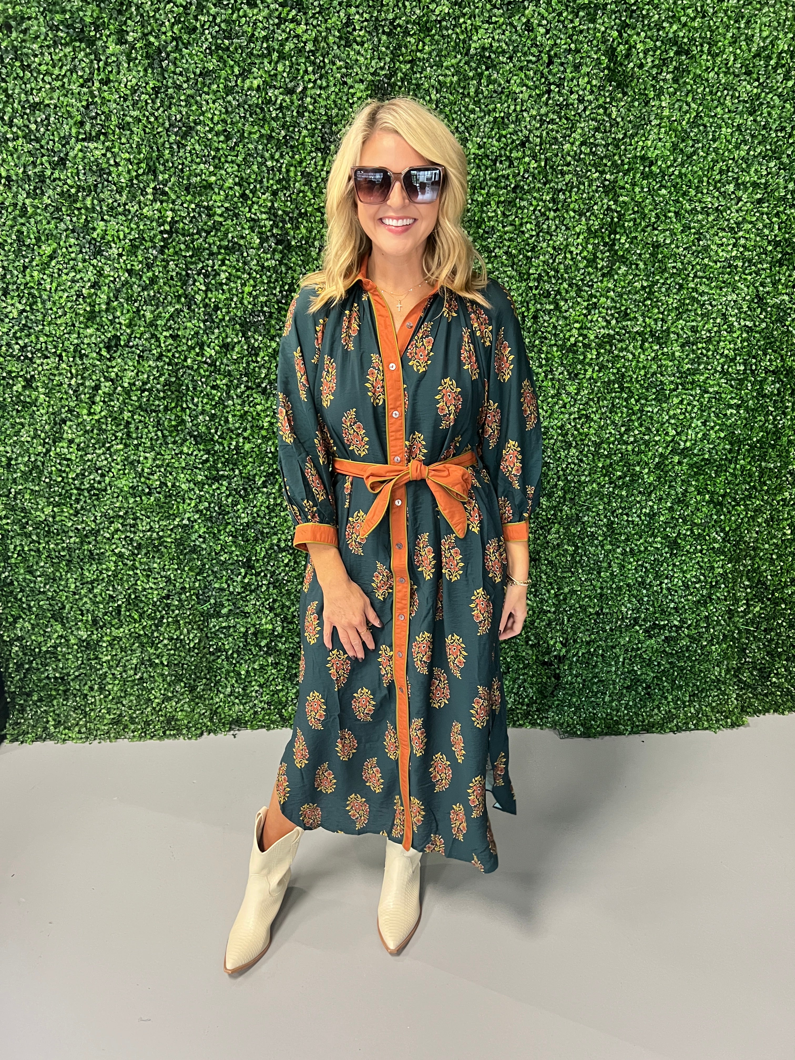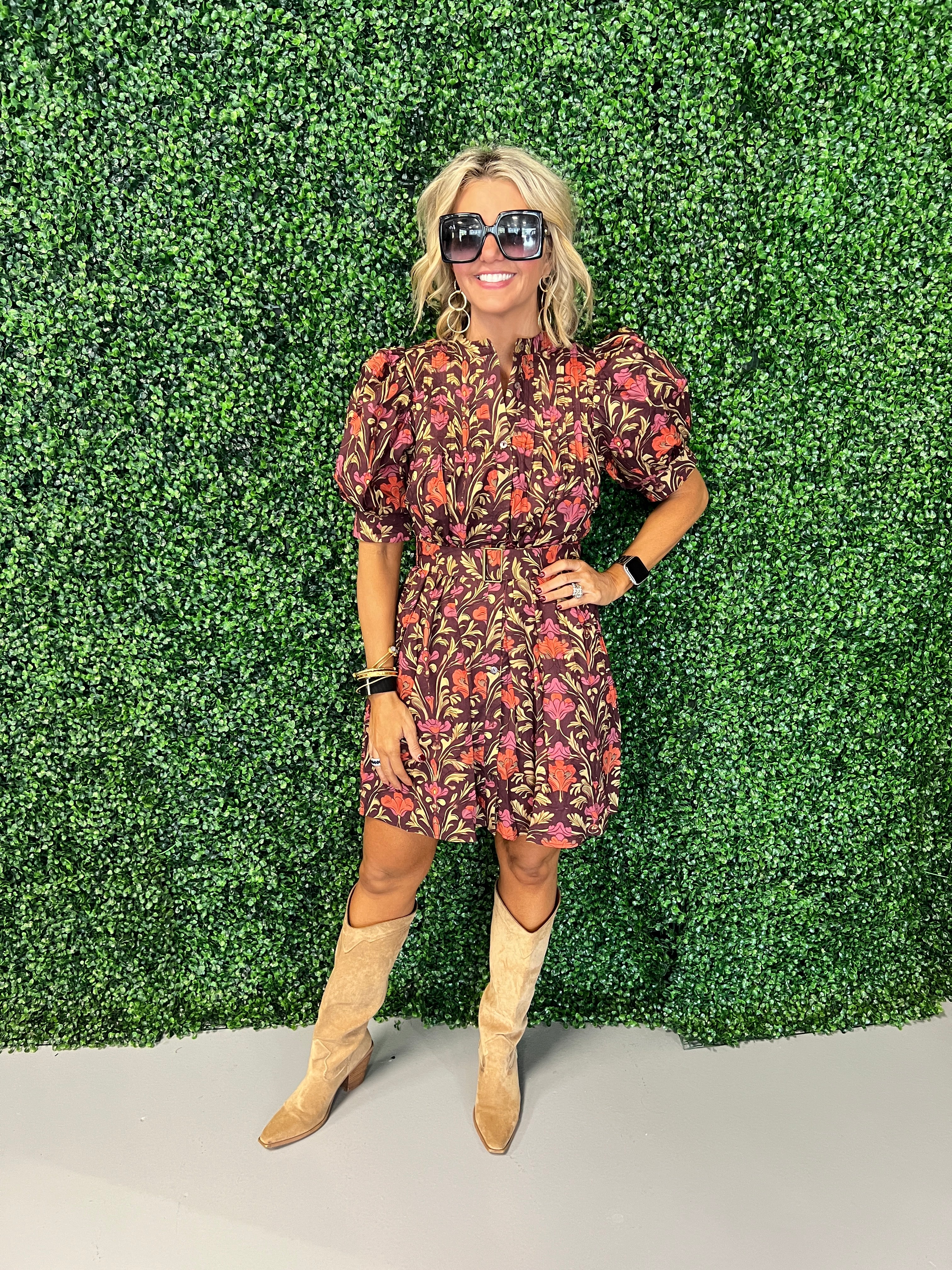 Brown Flower Patch Border Print V-Neck Midi Dress