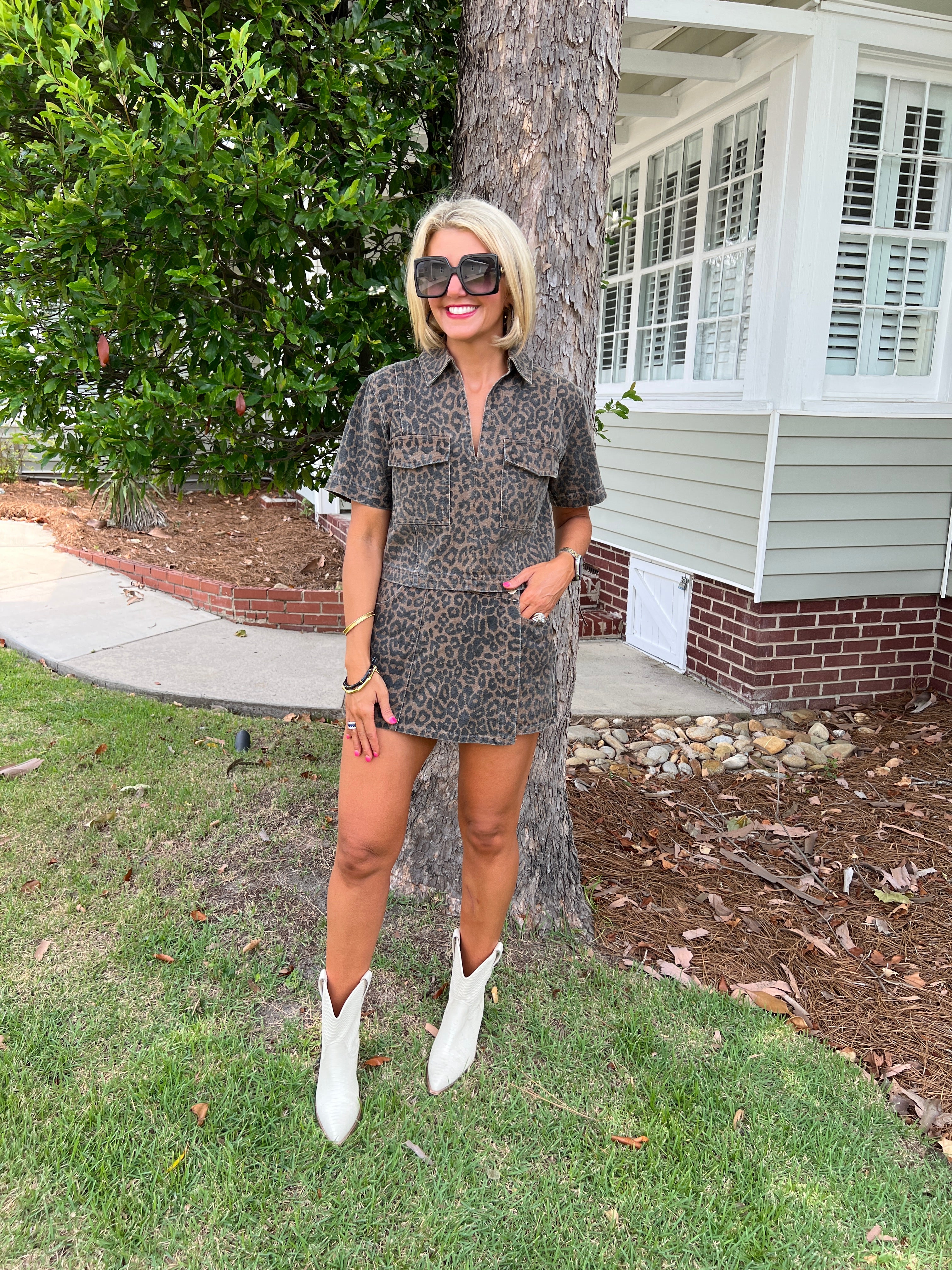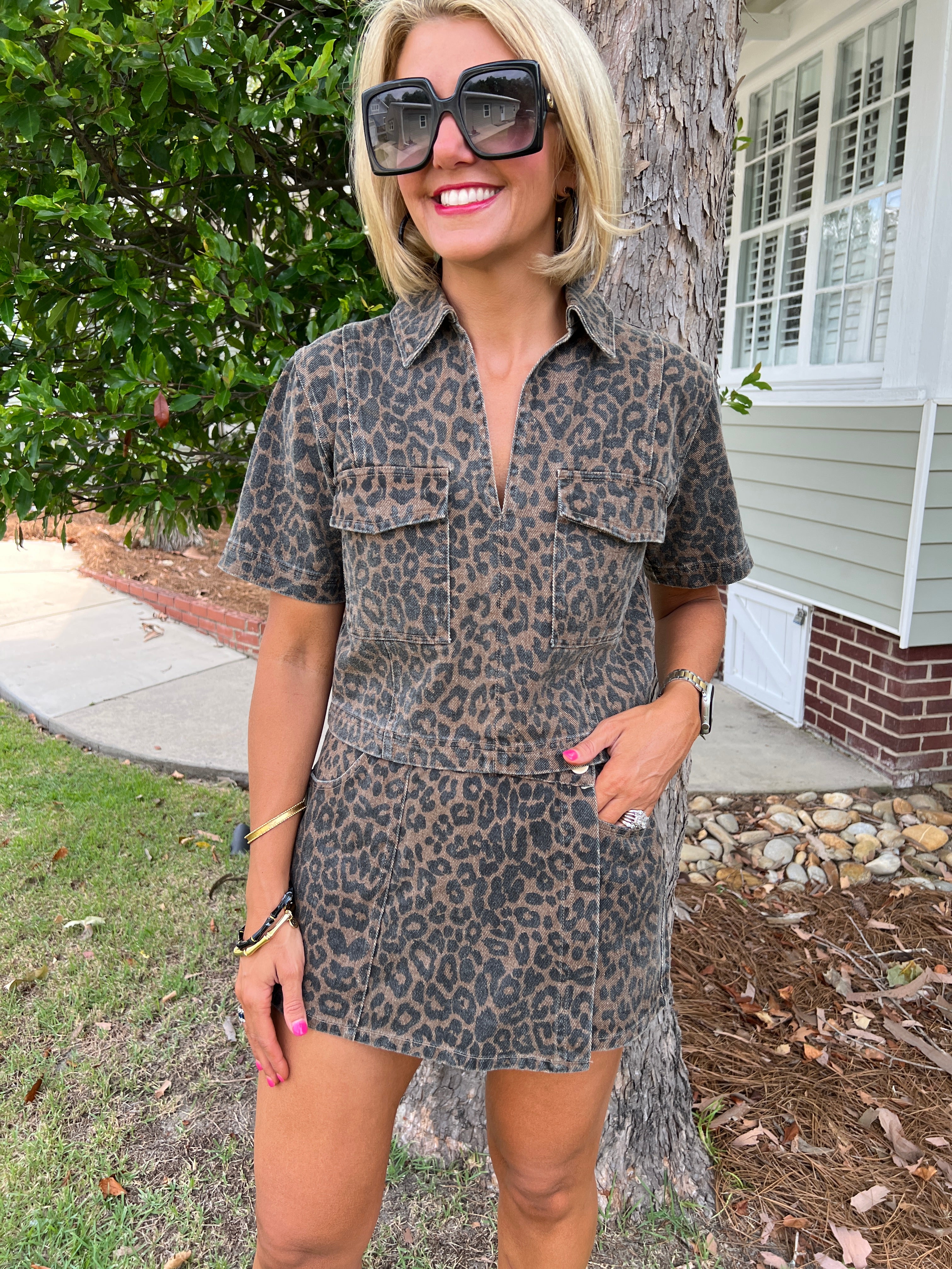 Make a bold statement with the Animal Print Skort Set, combining a flattering V-neckline top with a classic collar and handy chest patch pockets. The coordinating skort features a trendy front wrap asymmetrical overlay, stylish button accents, belt loops, and practical pockets. Sold together, this set delivers effortless, eye-catching style perfect for turning heads wherever you go.