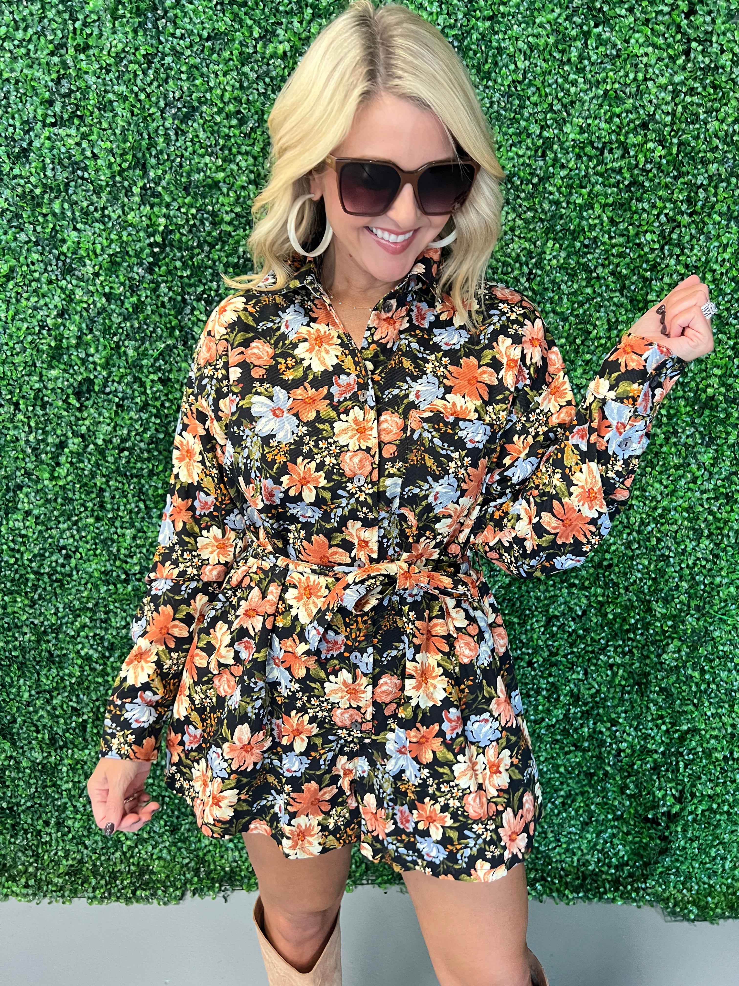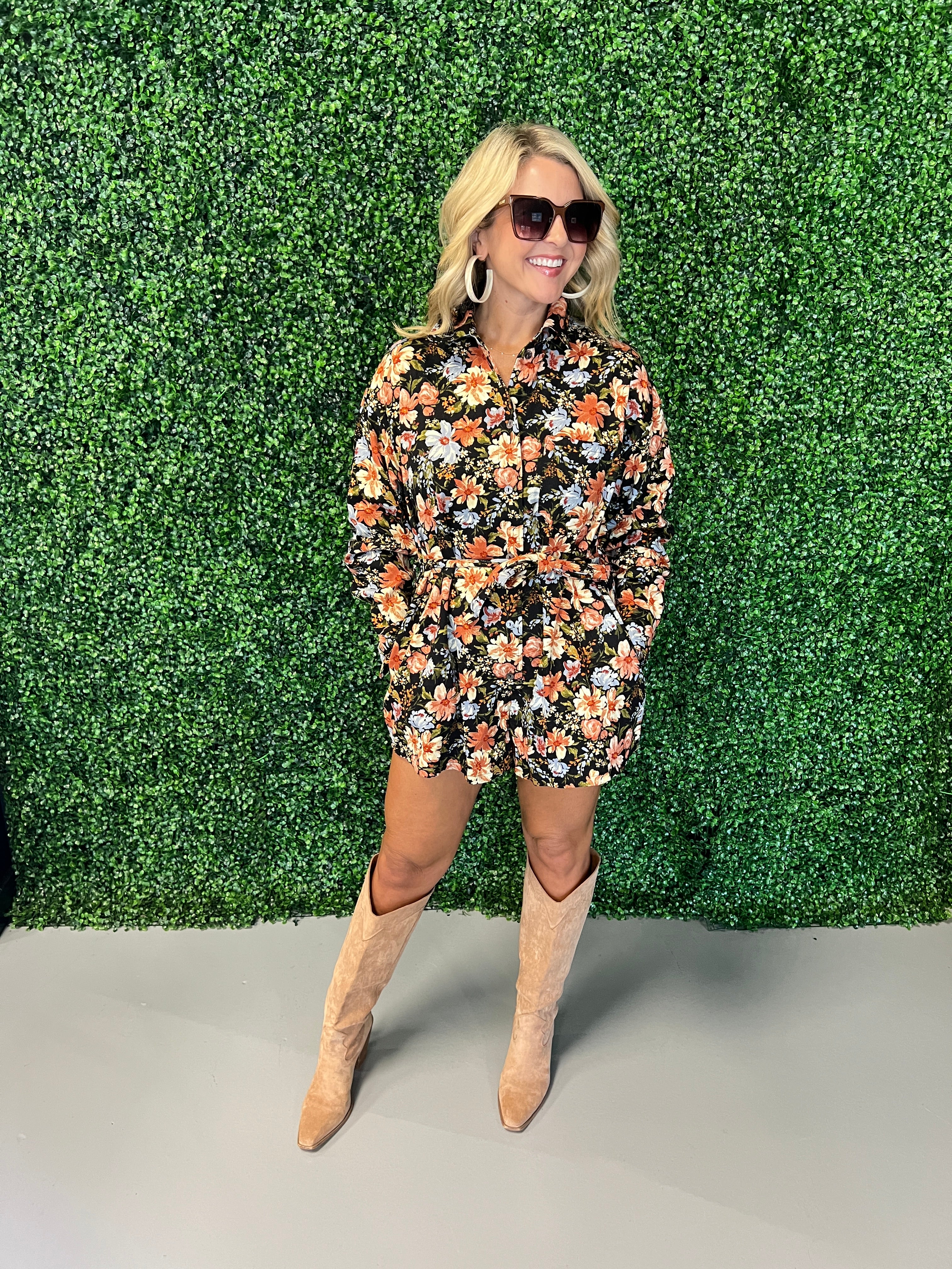 Elevate your style with the Black Floral Romper, featuring a sleek black base adorned with delicate floral patterns. Its lightweight fabric ensures all-day comfort, while the flattering cut accentuates your silhouette effortlessly. Perfect for casual outings or dressy occasions, this romper combines elegance with ease, making it a versatile must-have in your wardrobe.