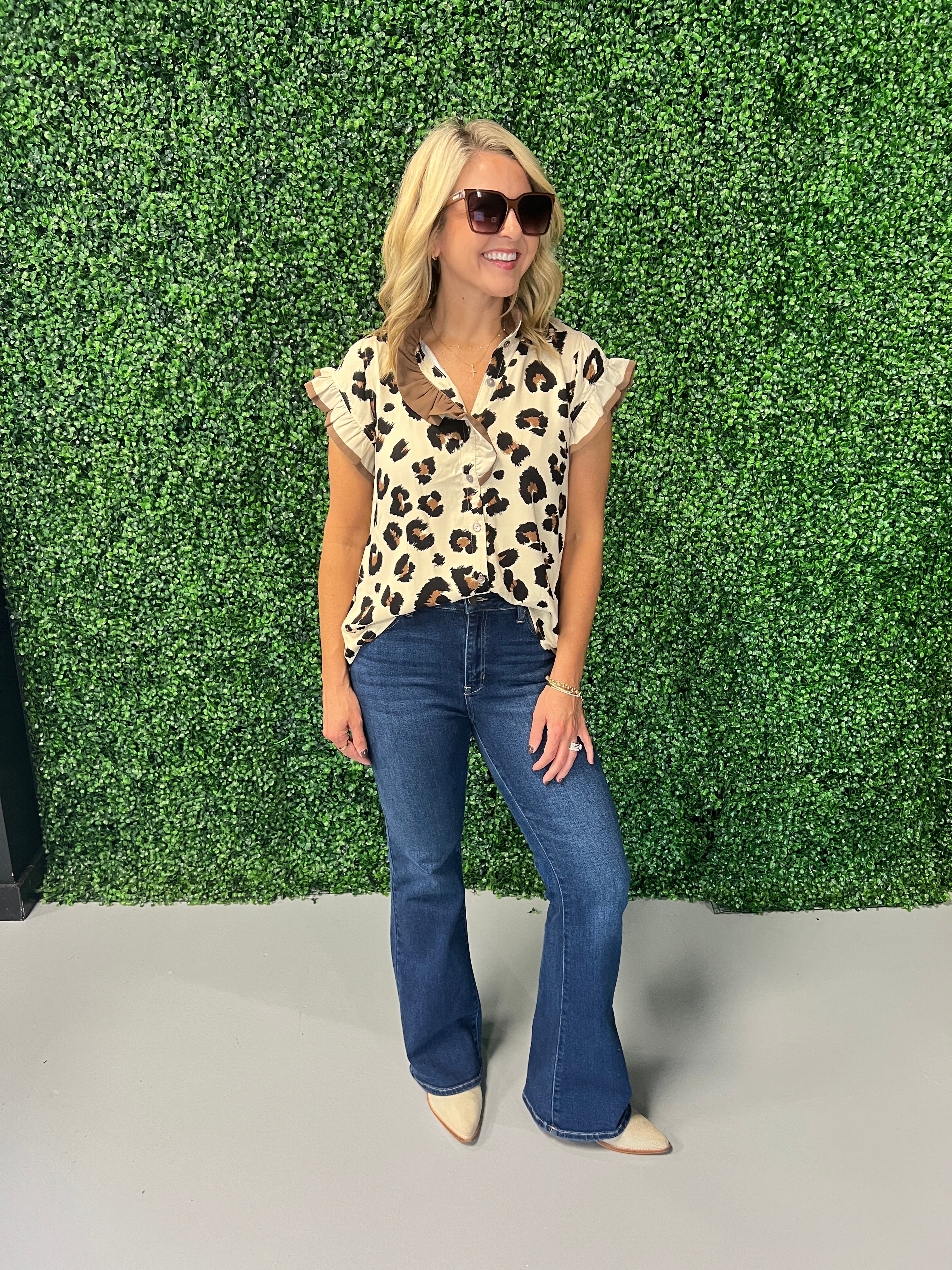 Elevate your wardrobe with this Leopard Pattern Top featuring delicate ruffles. Its bold print adds a fierce touch, while the ruffled details bring a feminine flair, making it perfect for both casual outings and stylish evenings. Comfortable and eye-catching, this top promises to keep you confident and chic all day long.