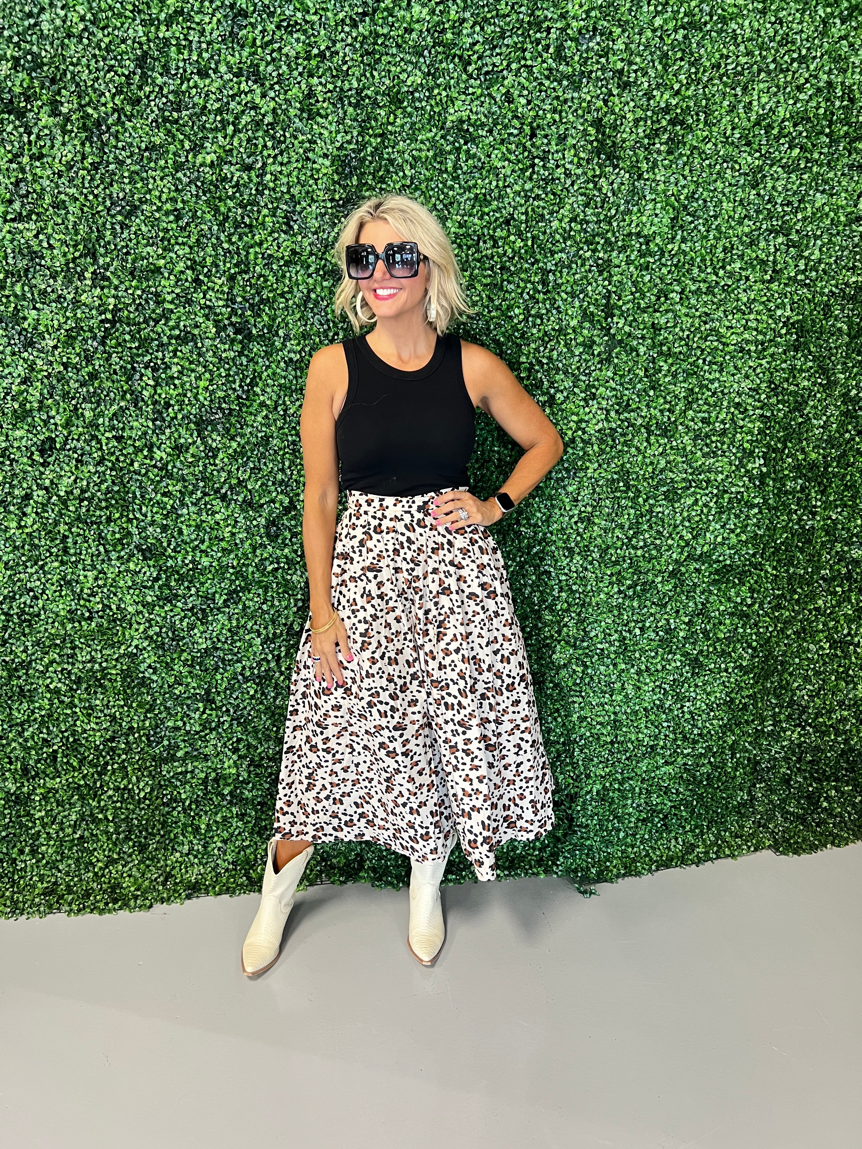 Elevate your wardrobe with this leopard print pleated midi skirt. Featuring a flattering pleated design and a bold animal print, it effortlessly blends sophistication with a touch of wild style. Ideal for both casual days and chic evenings, this skirt offers comfort and flair, making it a must-have piece to express your confident, fashion-forward personality.
