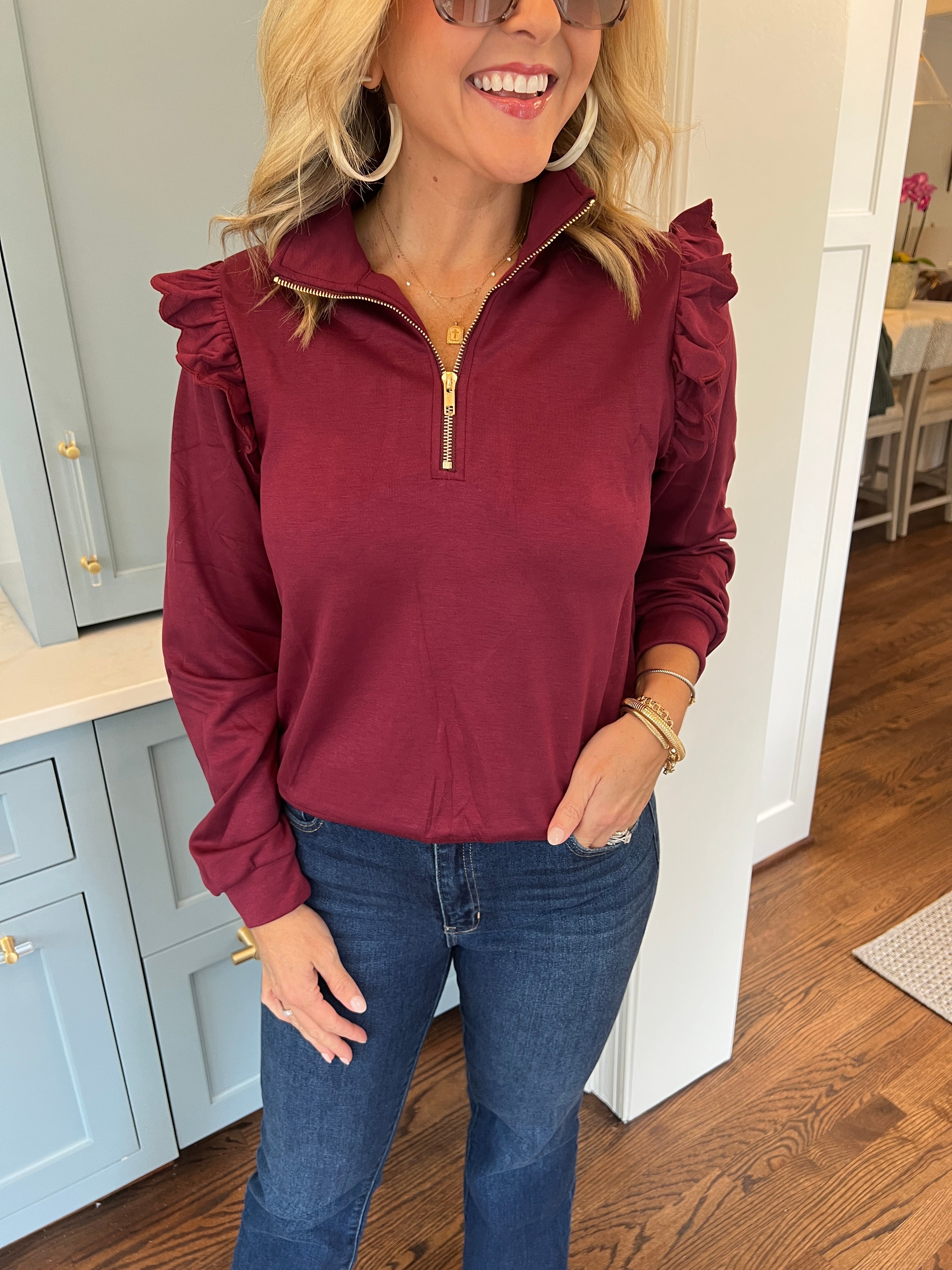 Luxeknit Ruffle Shoulder Quarter-Zip Pullover