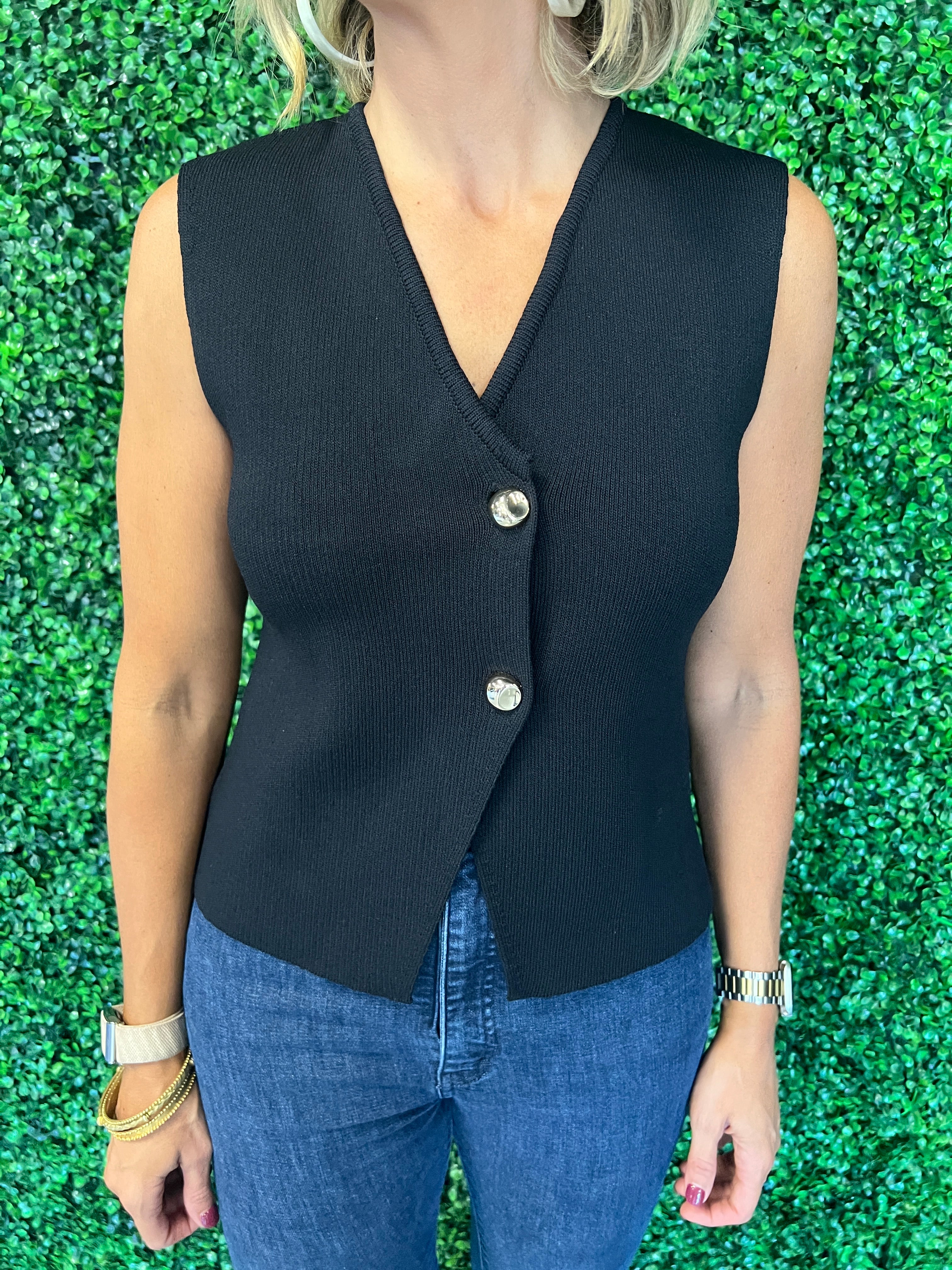 Elevate your wardrobe with this Sleeveless Gold Button Knit Sweater Vest, combining timeless knit comfort with chic gold button accents. Perfect for layering or wearing alone, it adds a polished touch to any outfit while keeping you effortlessly stylish and comfortable throughout the day.