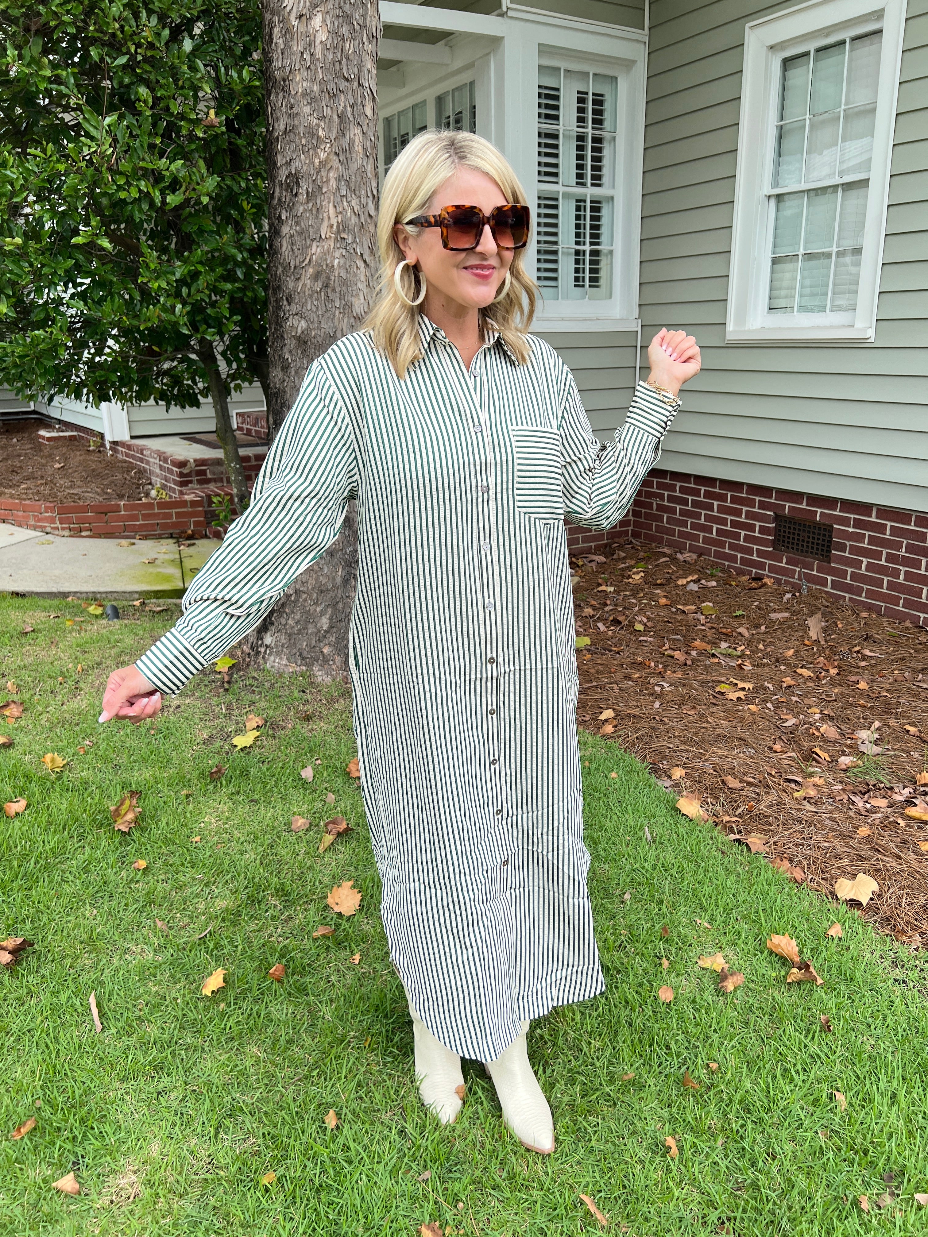 Elevate your wardrobe with the Textured Stripe Midi Shirt Dress, designed for effortless style and comfort. Its subtle textured stripes add depth and sophistication, while the midi length offers a flattering silhouette perfect for any occasion. Crafted for easy wear, this dress balances classic shirt details with modern flair, making it an ideal choice for day-to-night looks. Embrace confidence and timeless elegance with this versatile dress that moves seamlessly from office meetings to weekend outings.