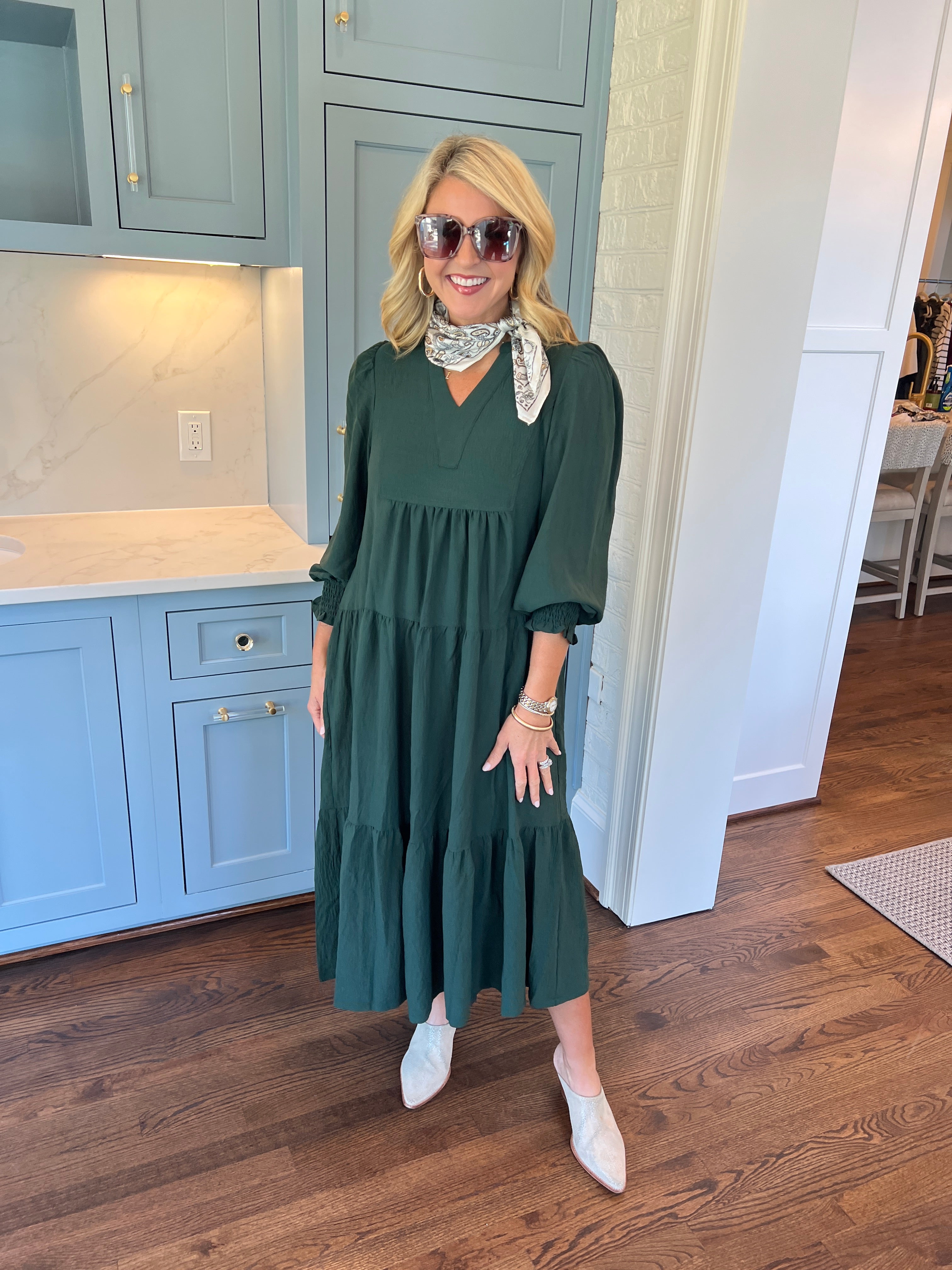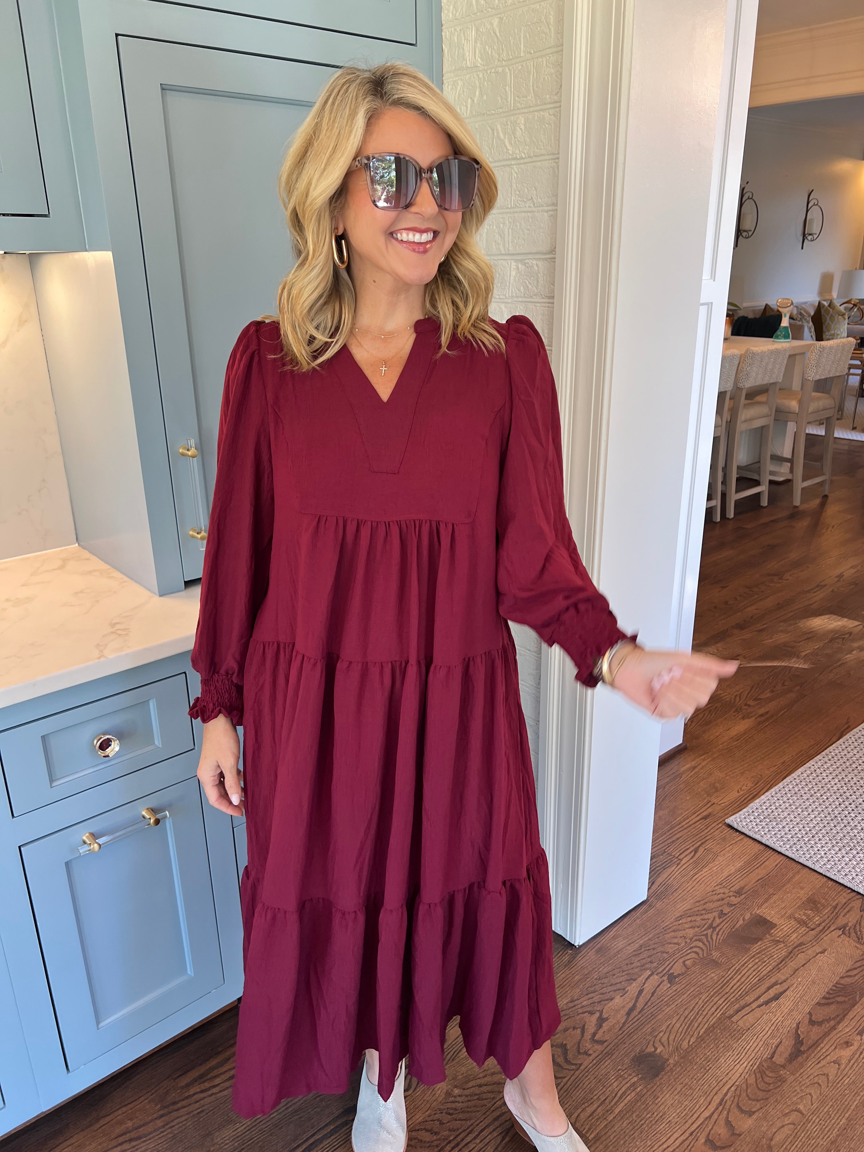 Elevate your style effortlessly with this Tiered Midi Dress featuring delicate smocked cuffs. The flowing tiers create a flattering silhouette that moves gracefully, while the smocked cuffs add a touch of refined detail and a comfortable fit. Perfect for daytime events or evening outings, this dress combines comfort with chic elegance for a wardrobe staple you'll reach for time and again.