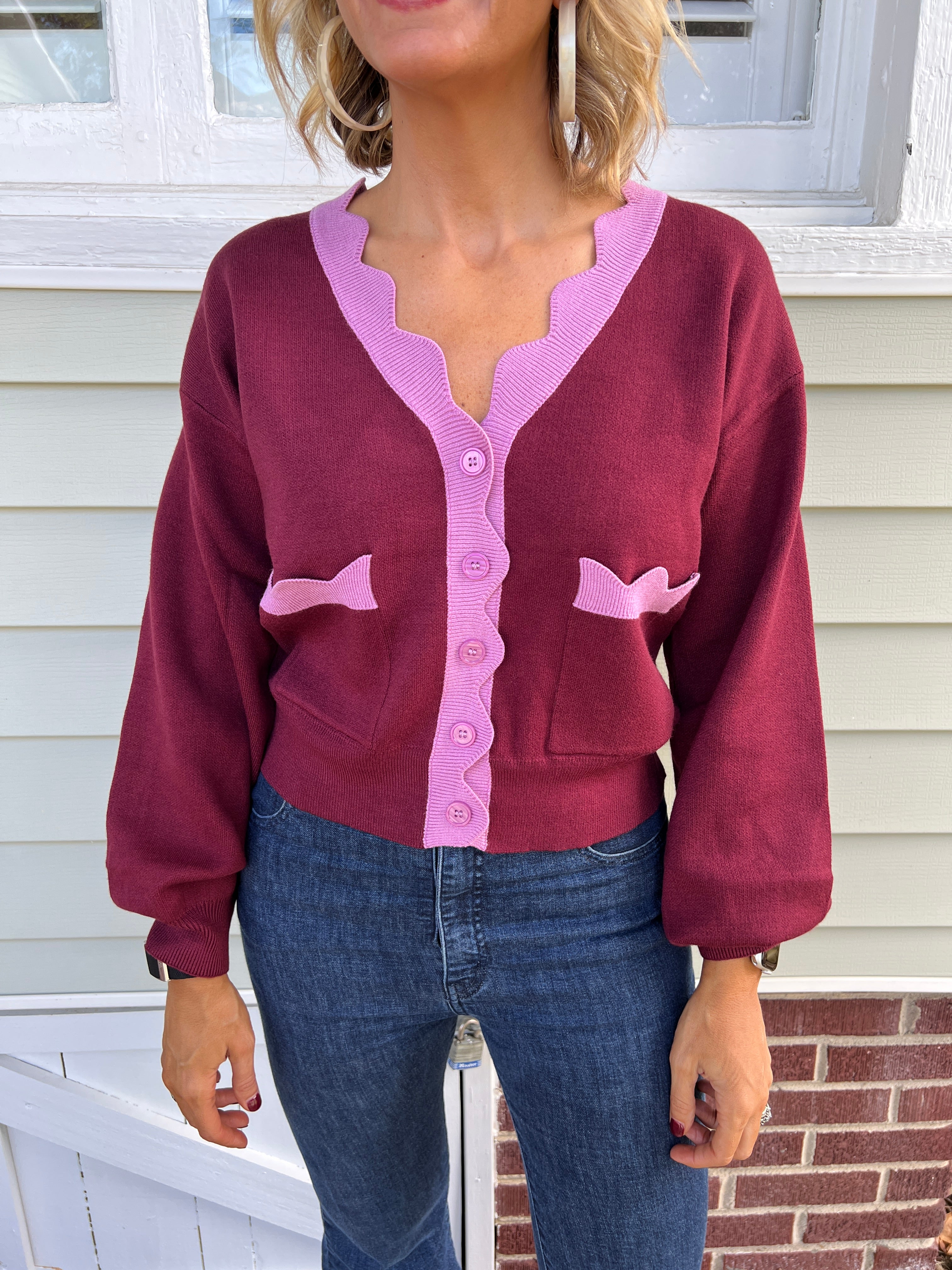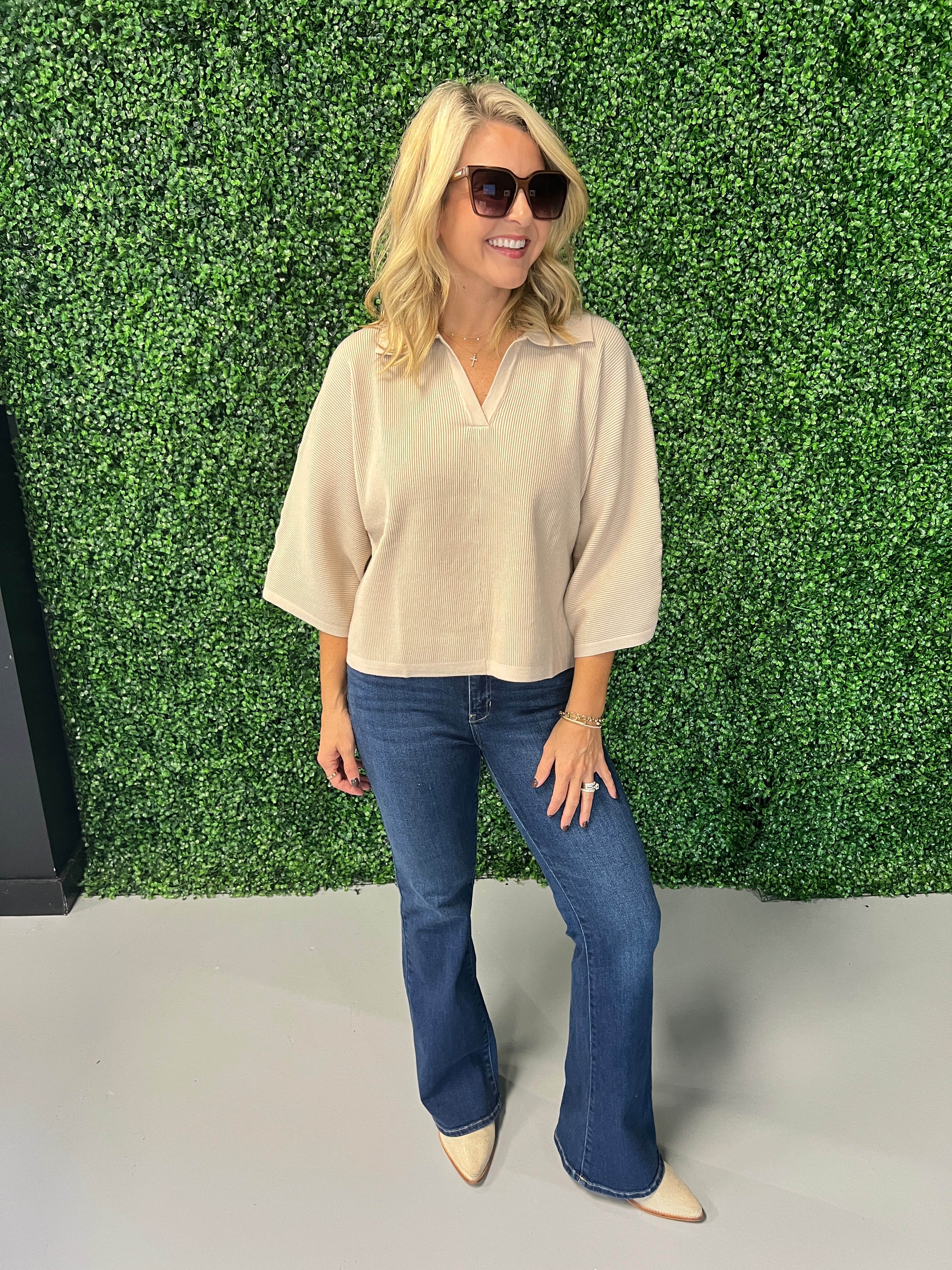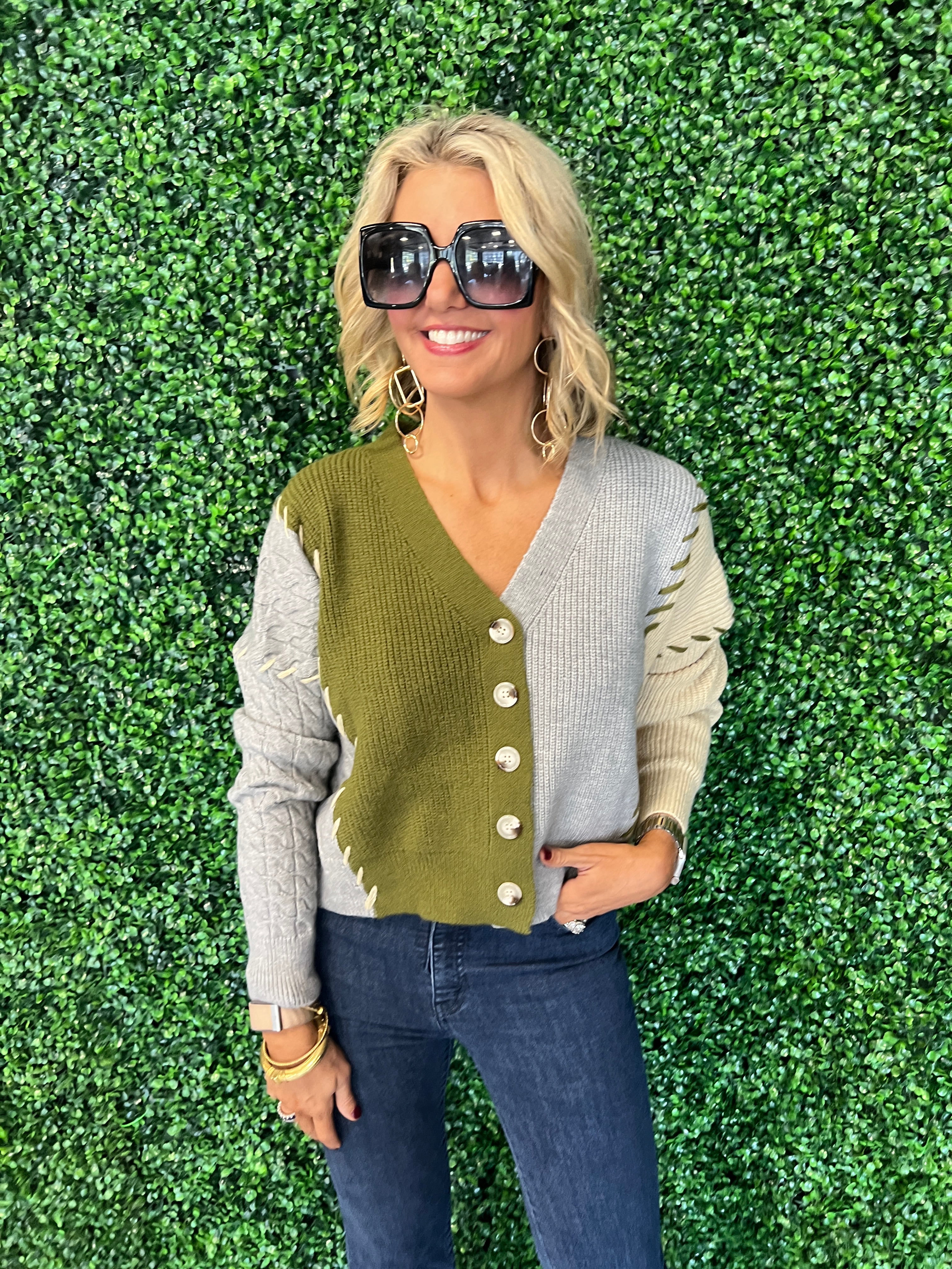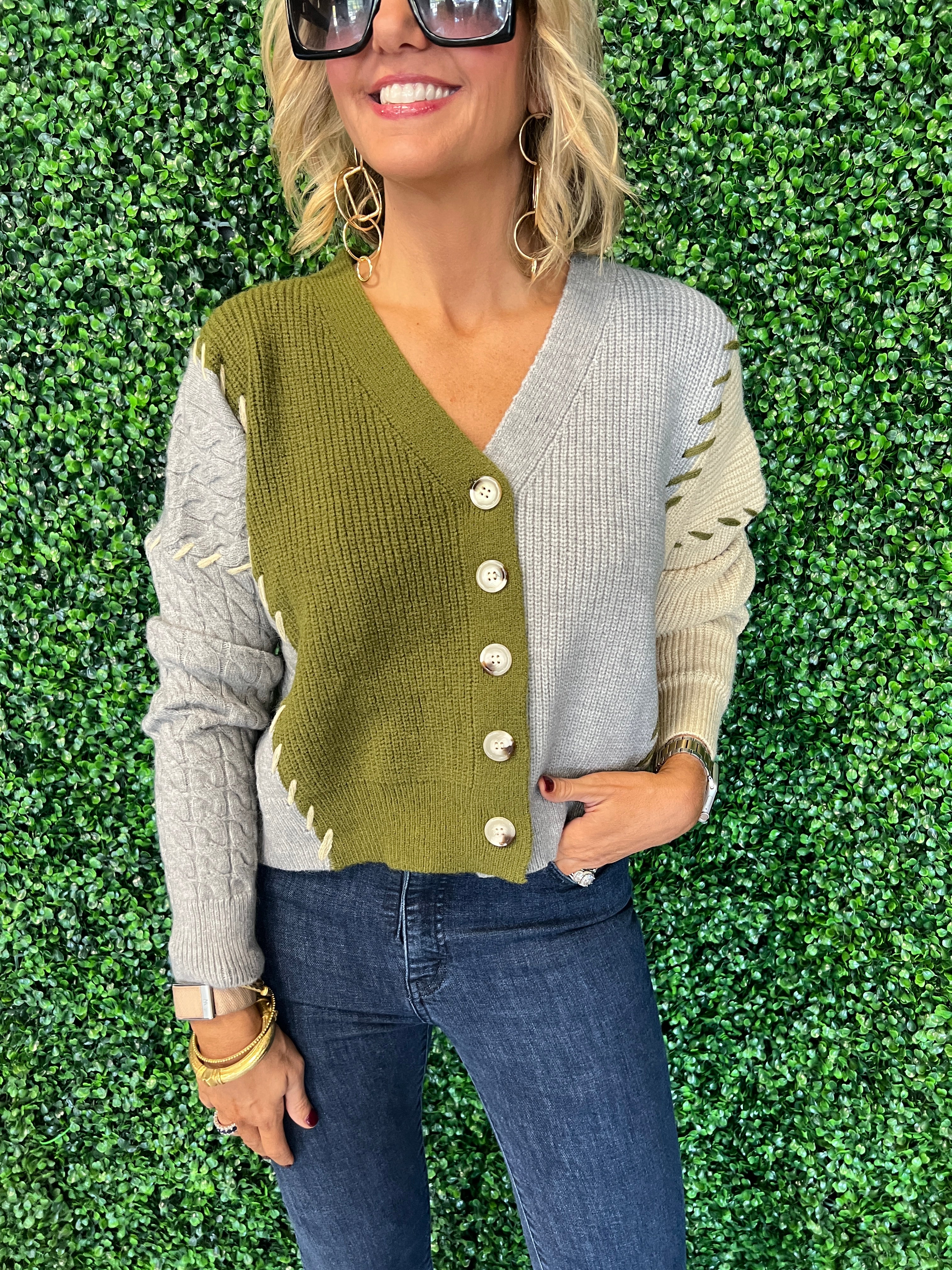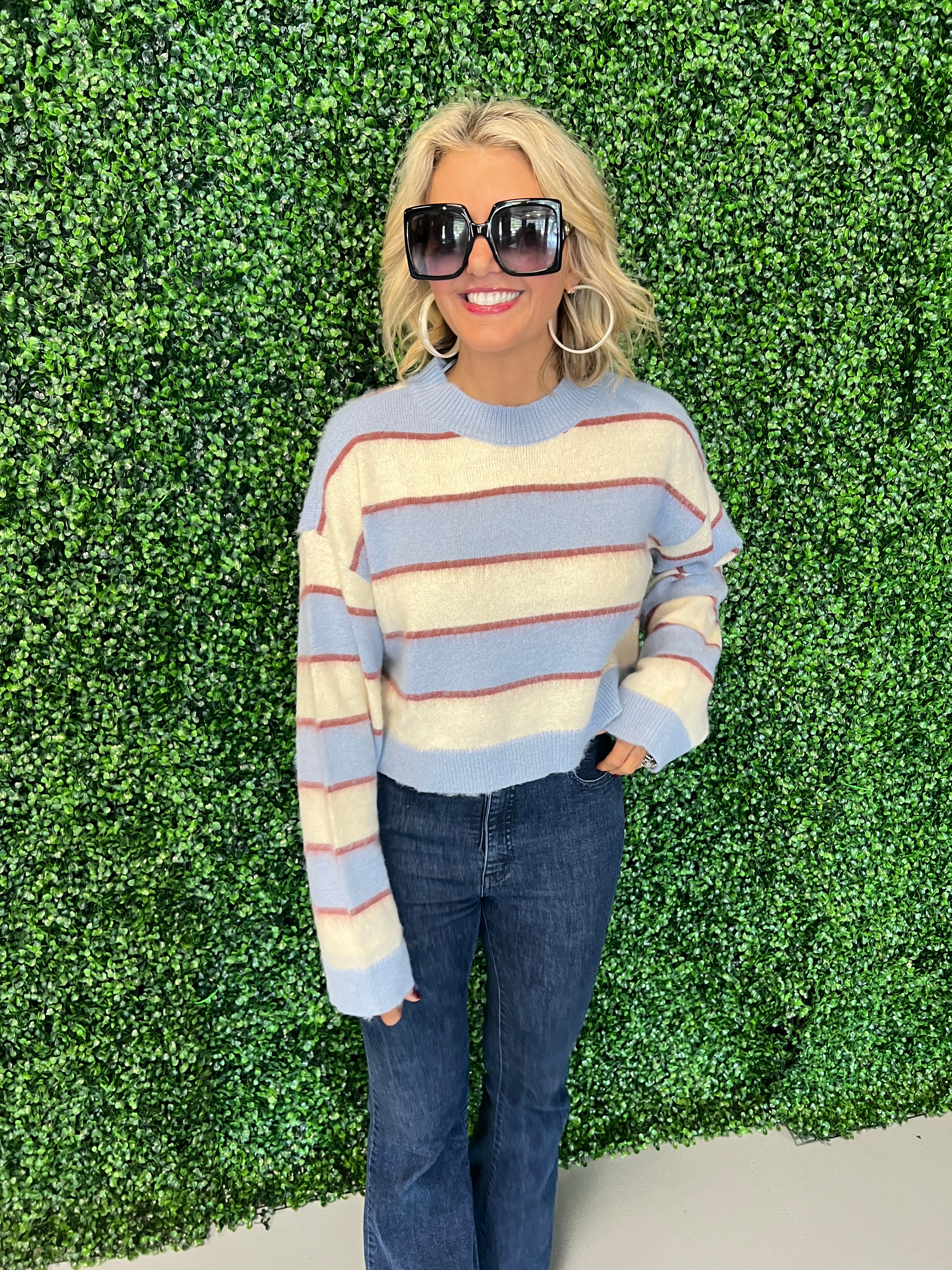 Brown & Blue Mock Neck Striped Cropped Sweater