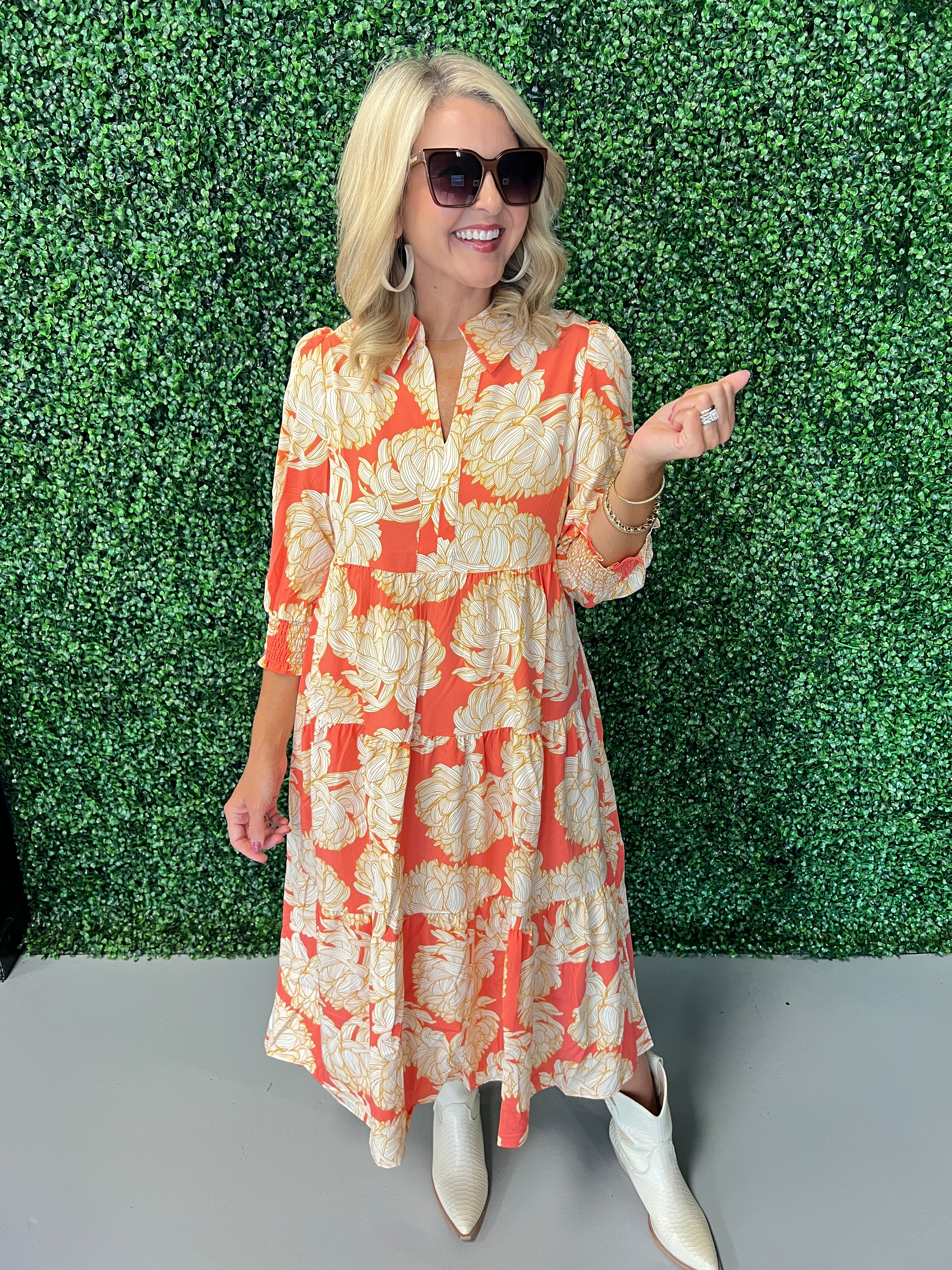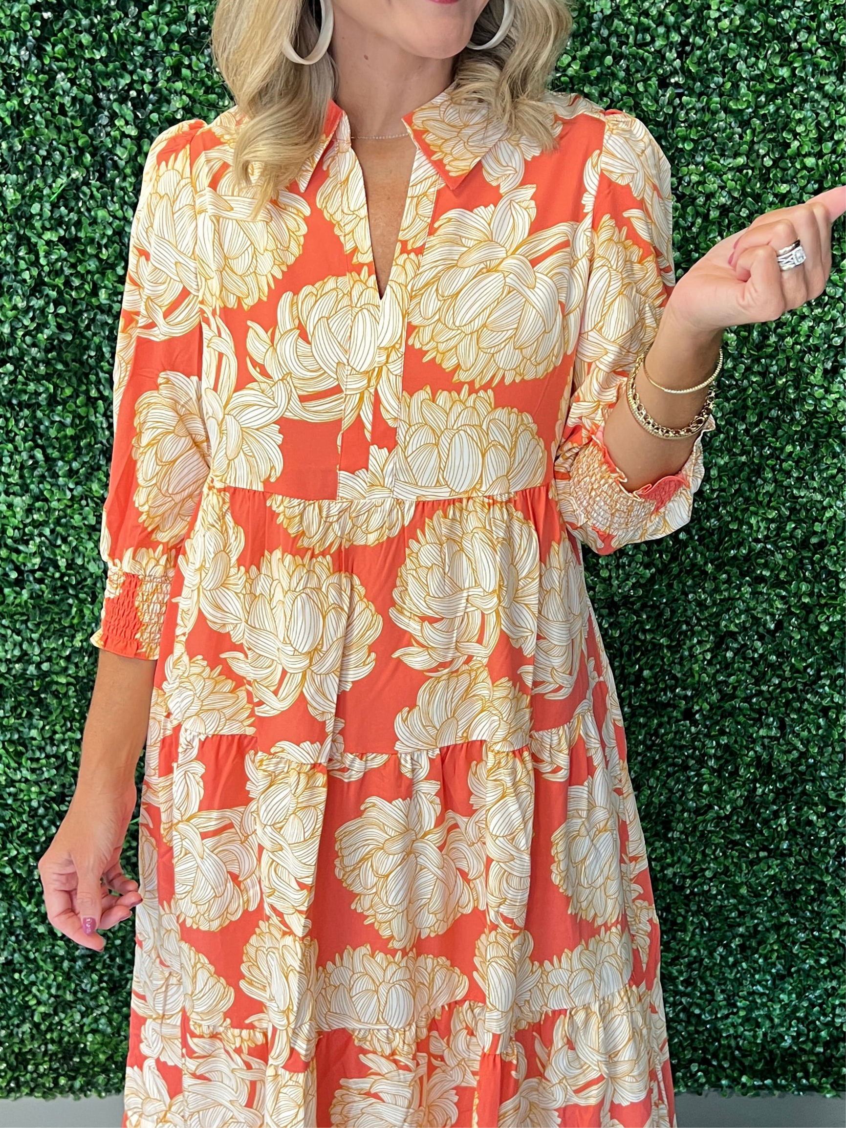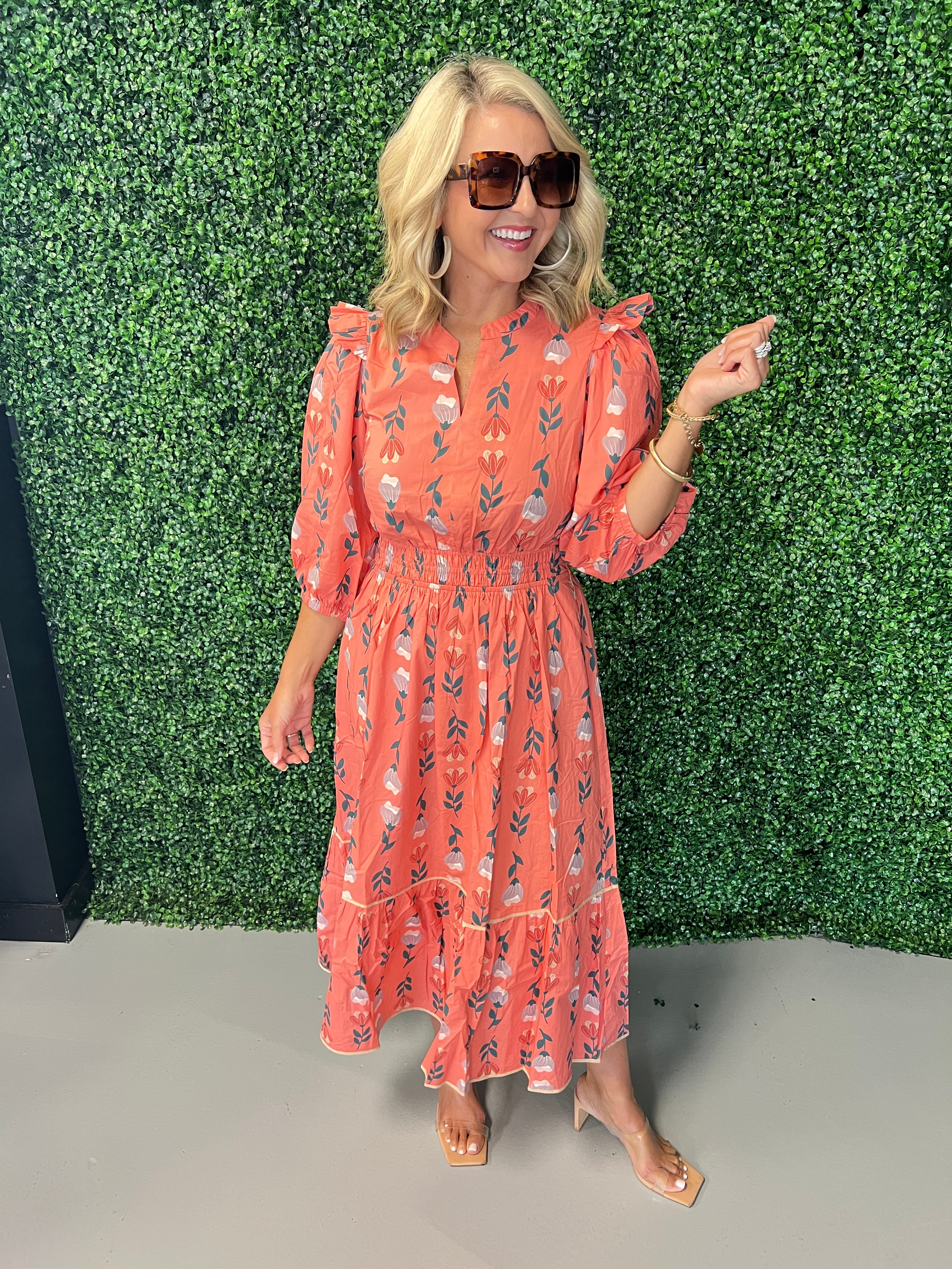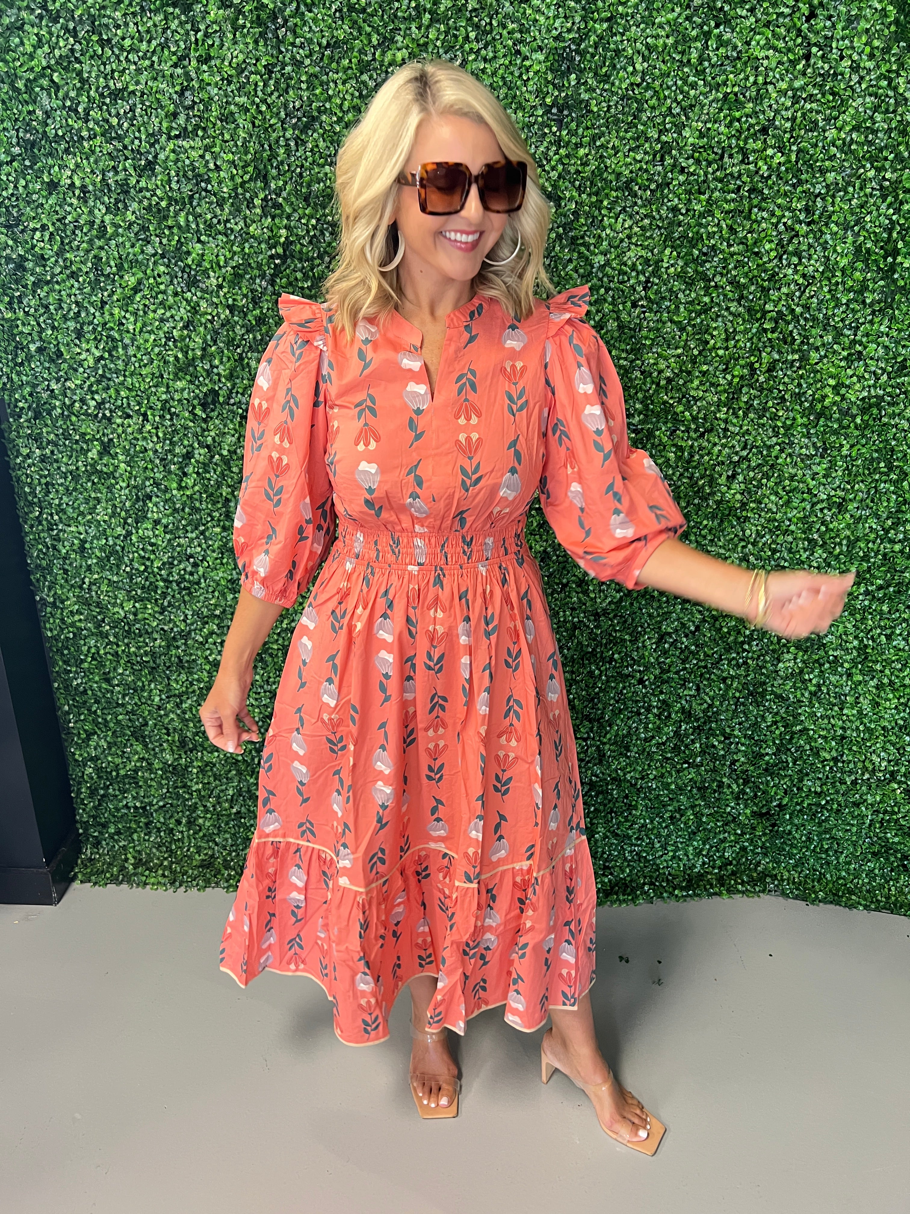 Coral Puff Sleeve Smocked Floral Midi Dress