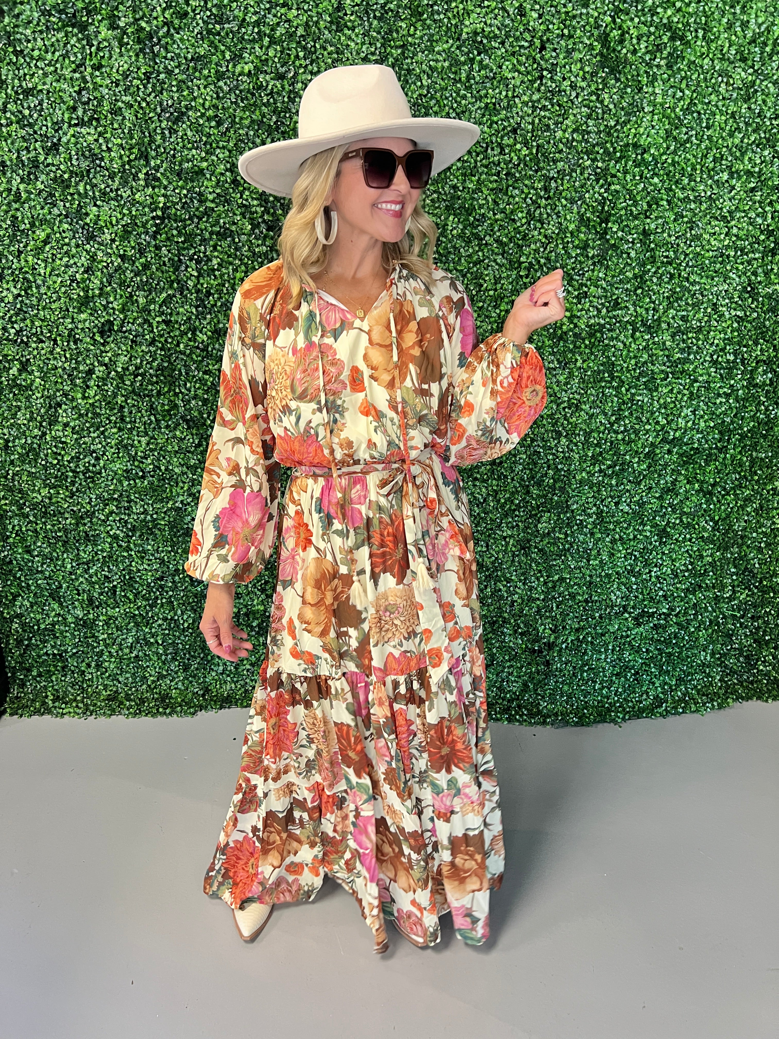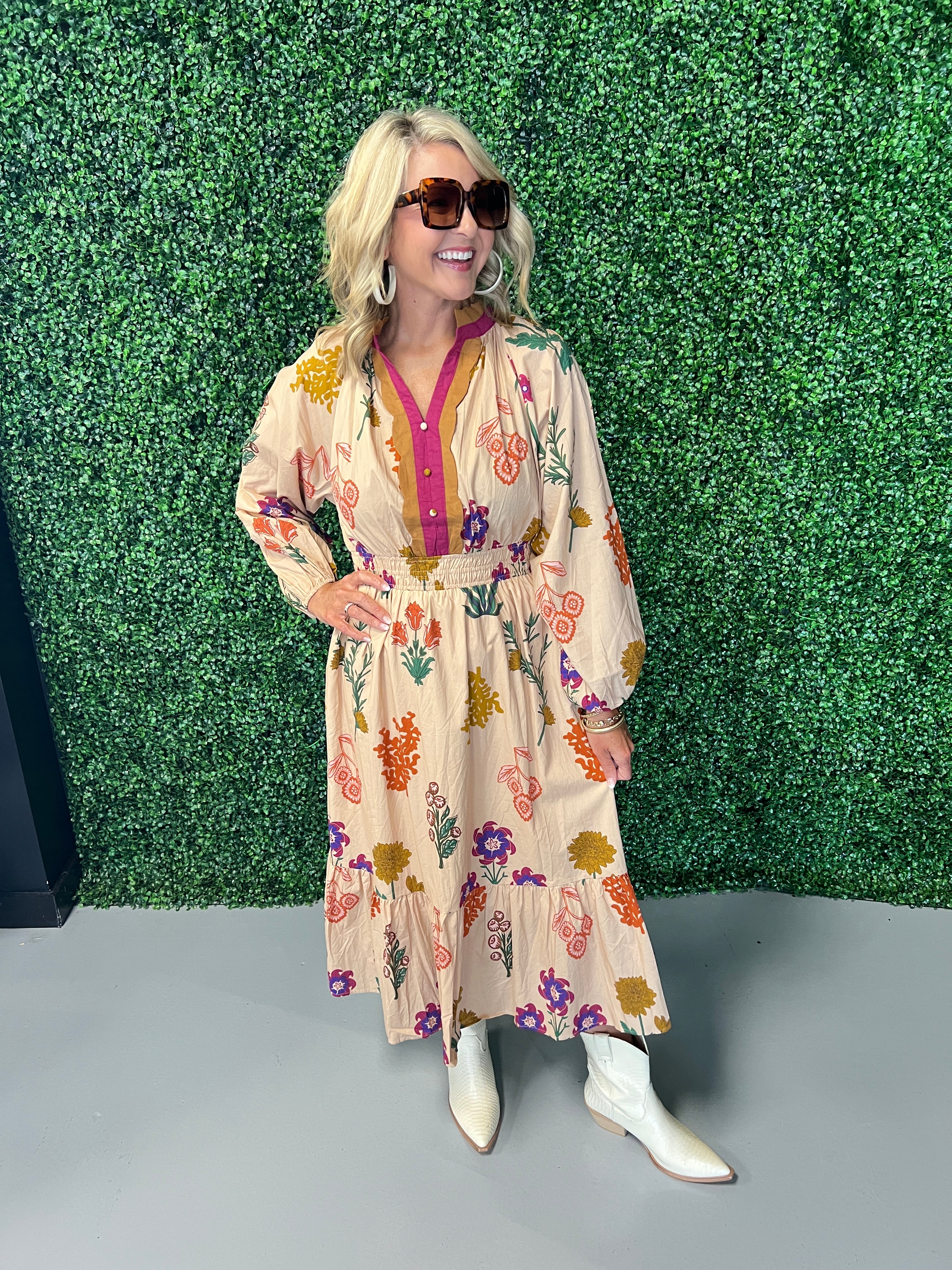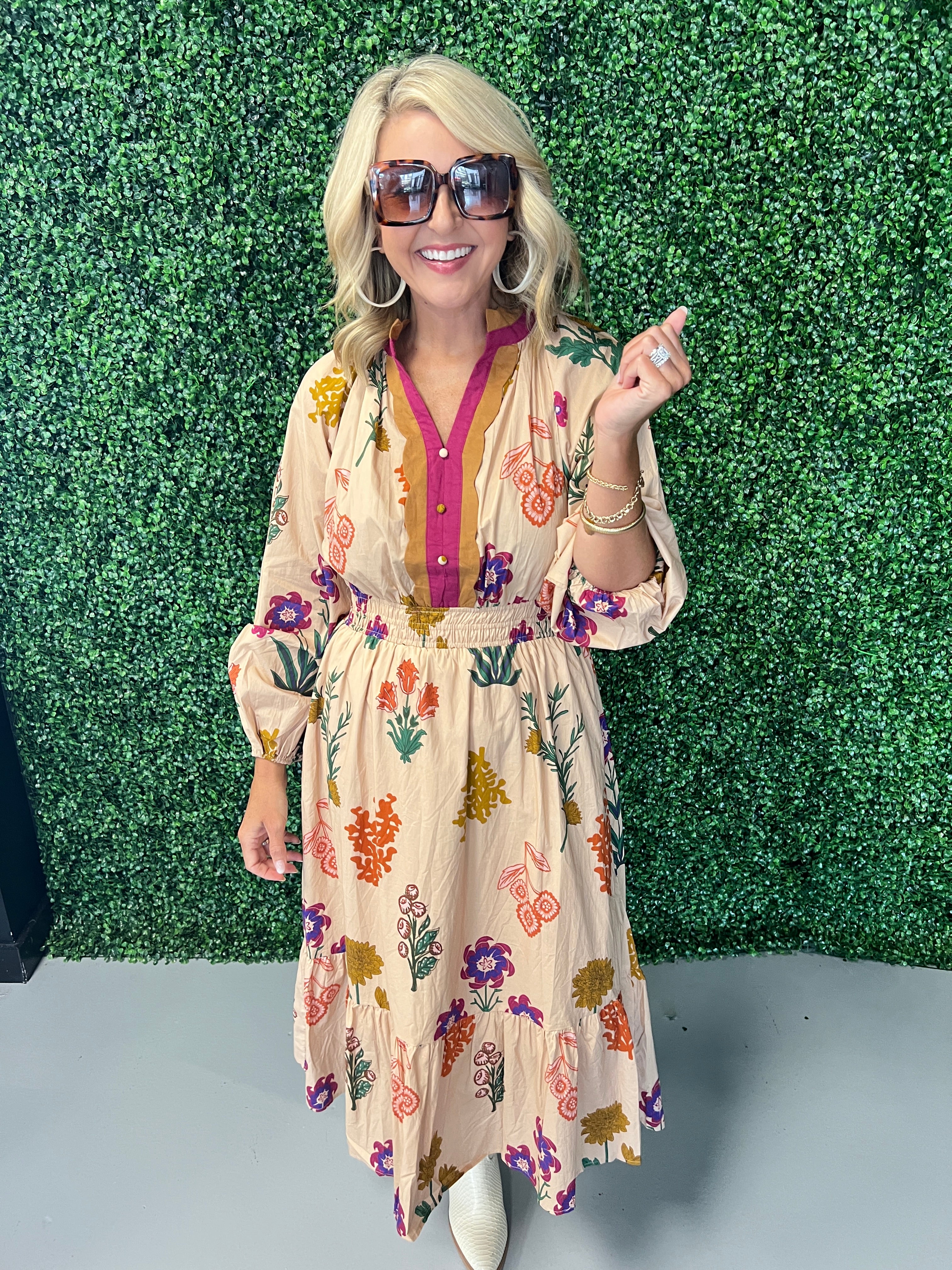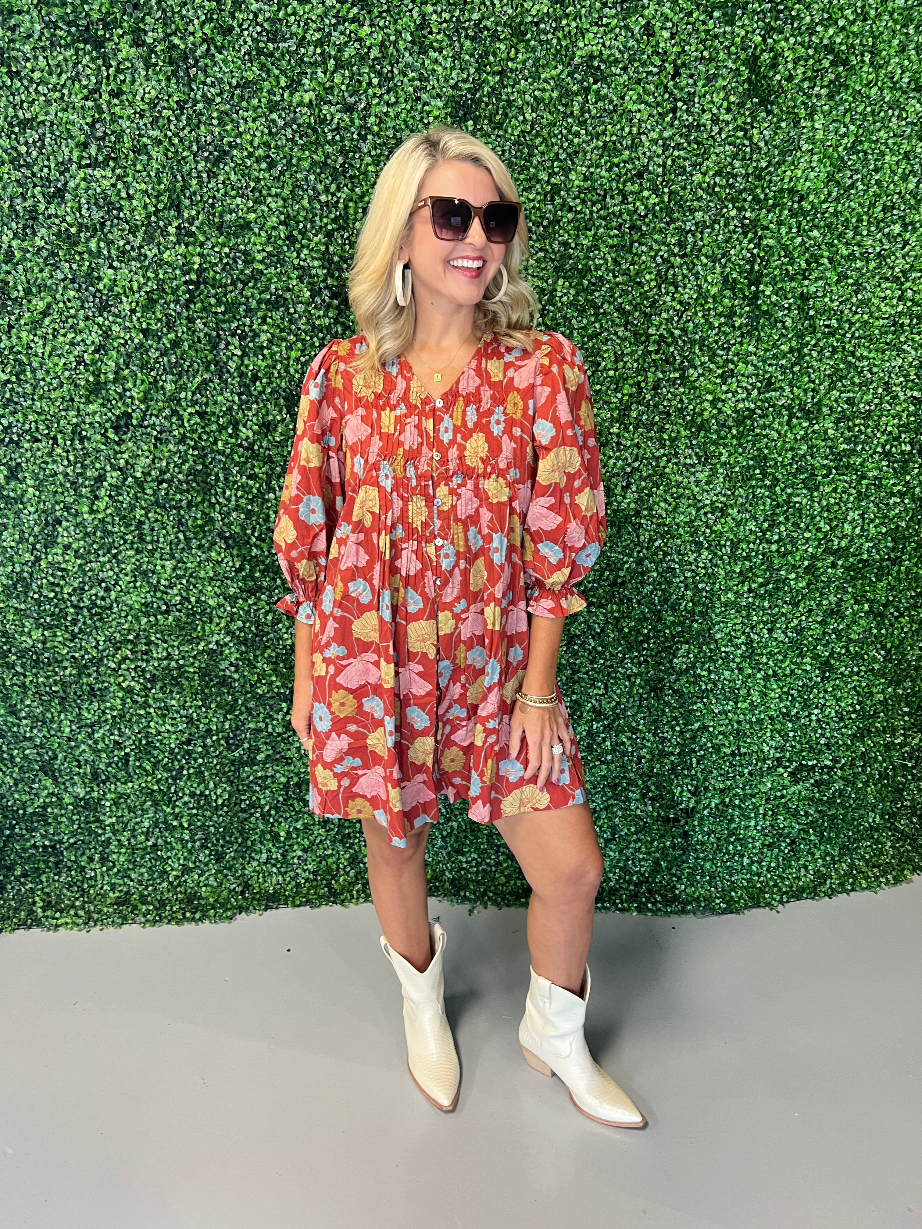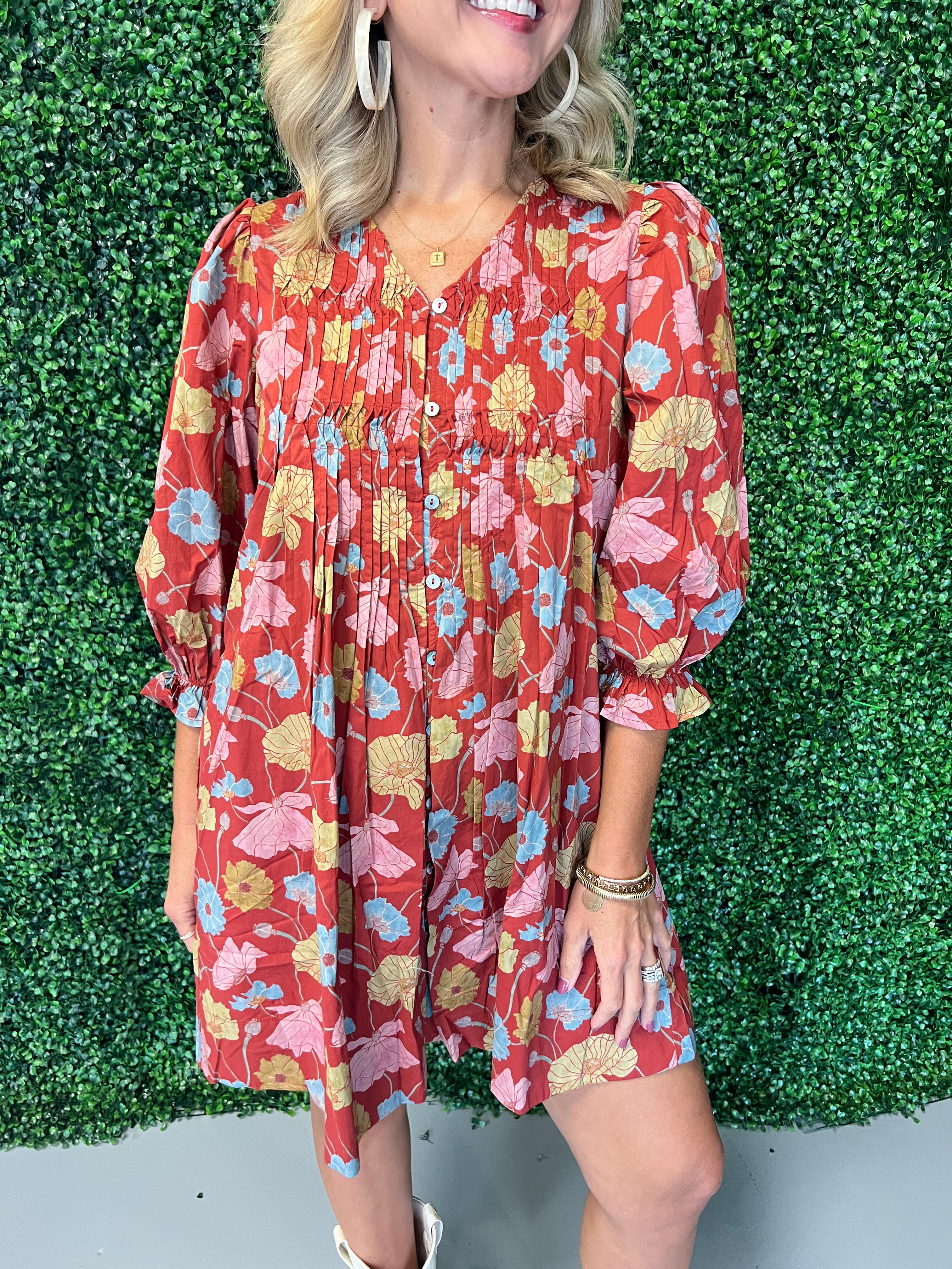 Coral Puff Sleeve Smocked Floral Midi Dress