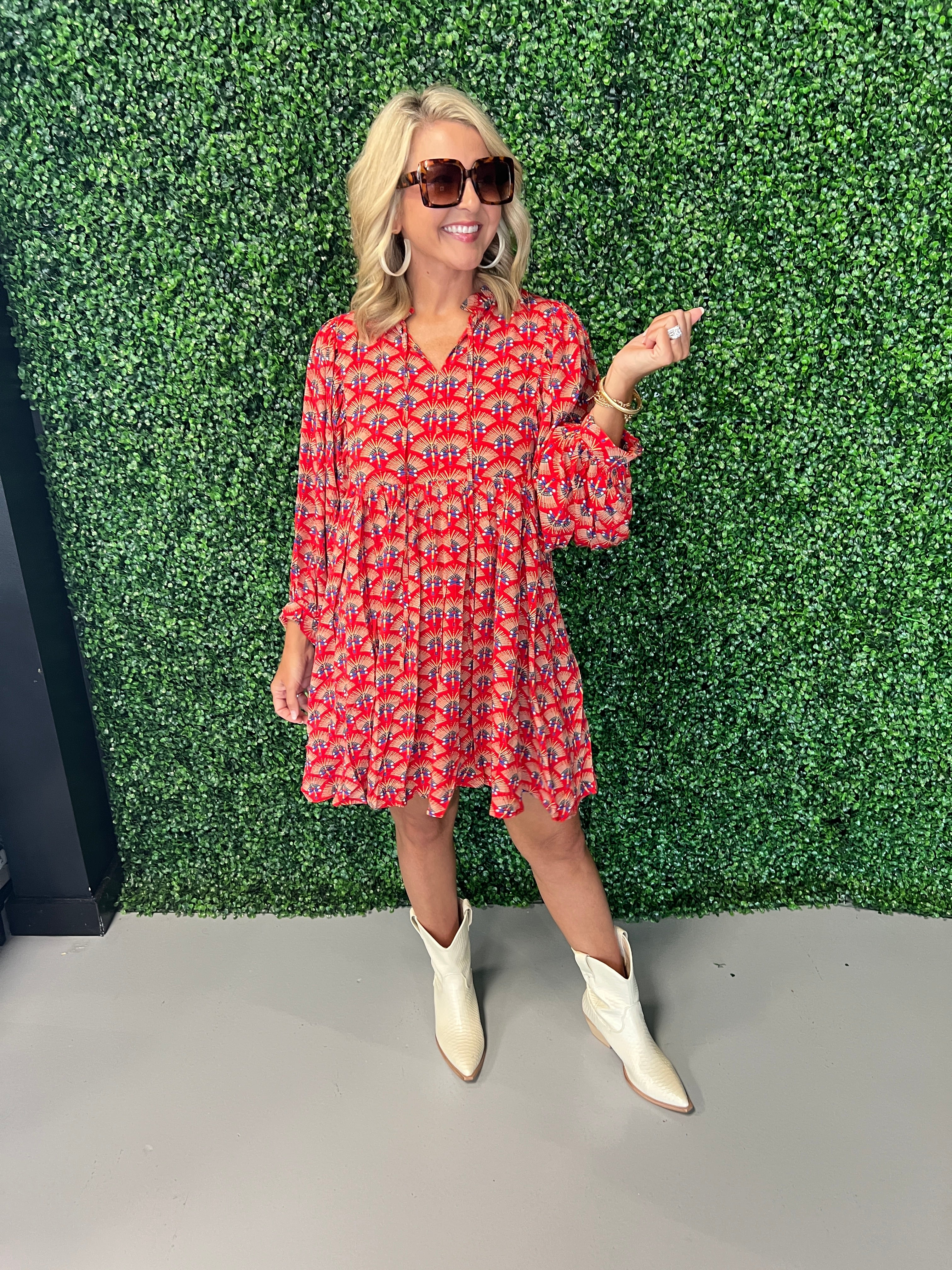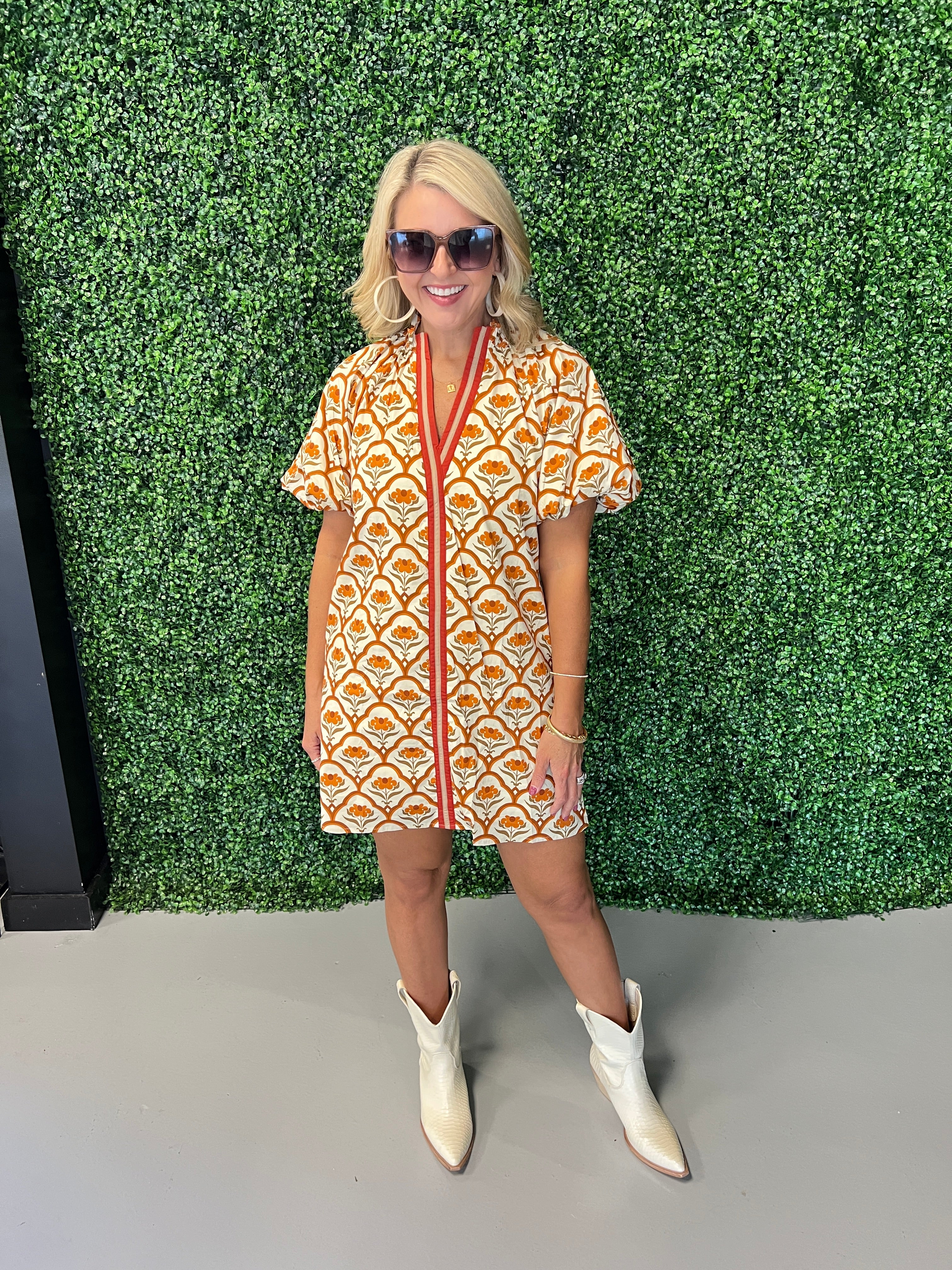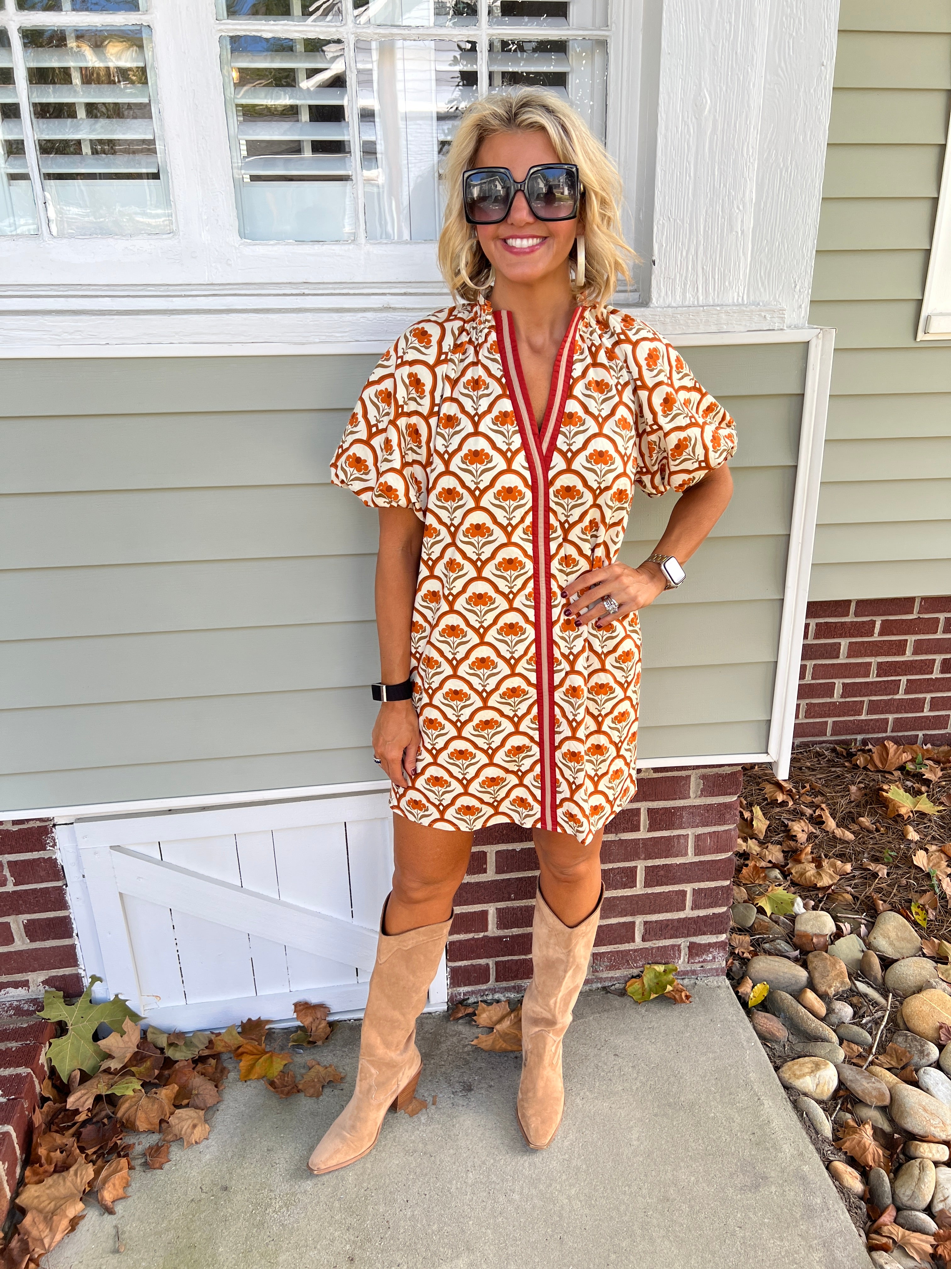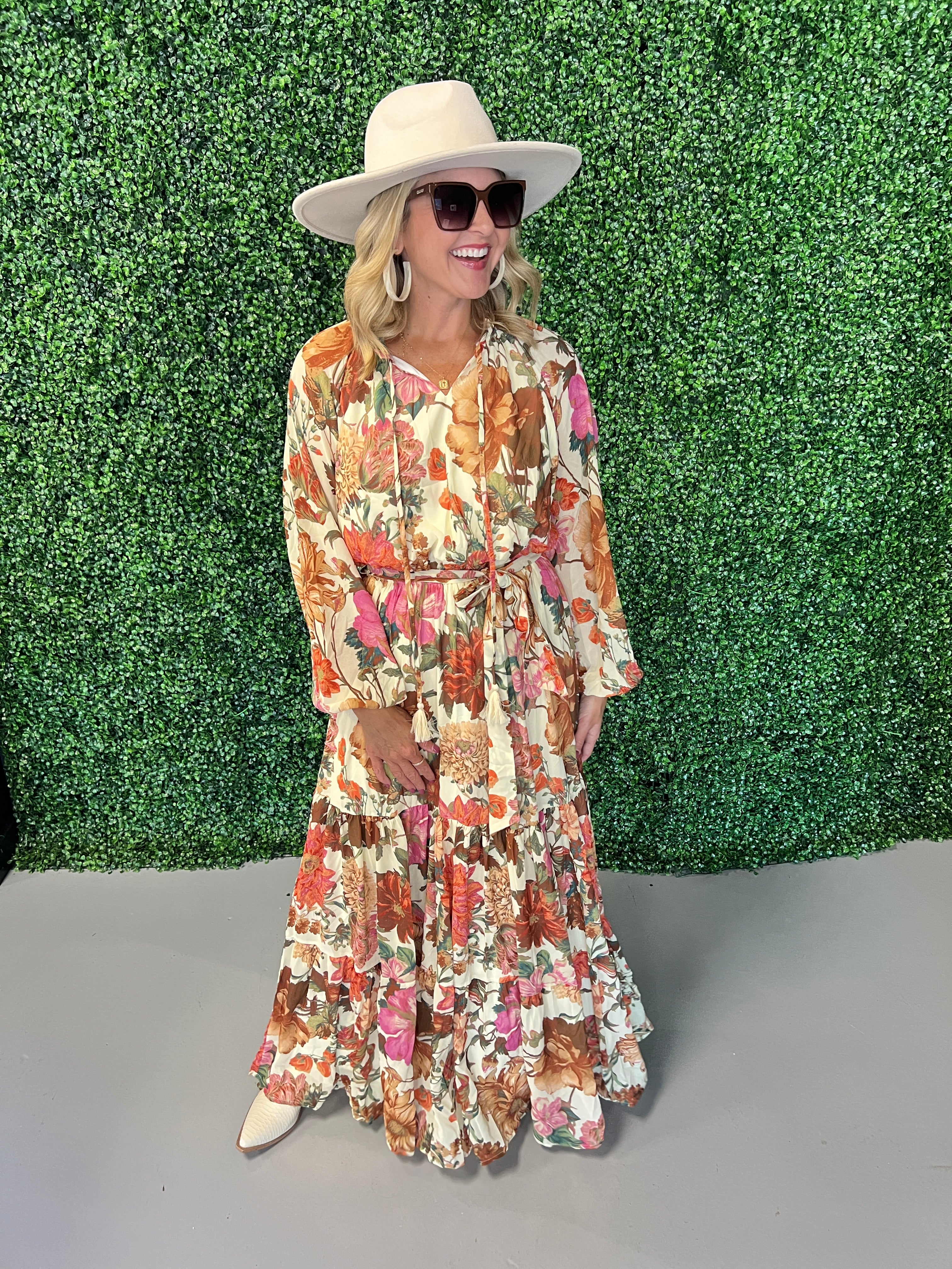 Coral Puff Sleeve Smocked Floral Midi Dress