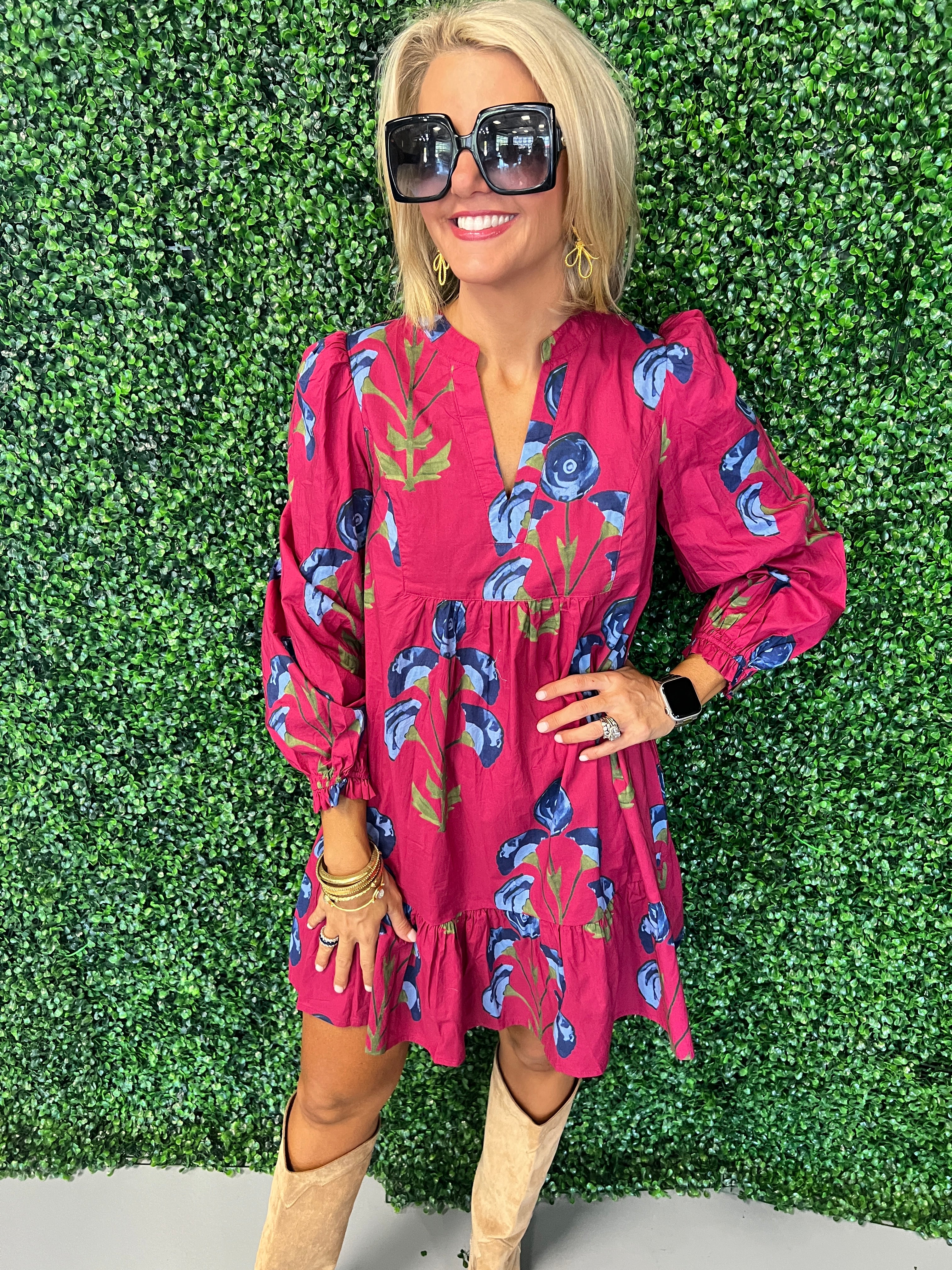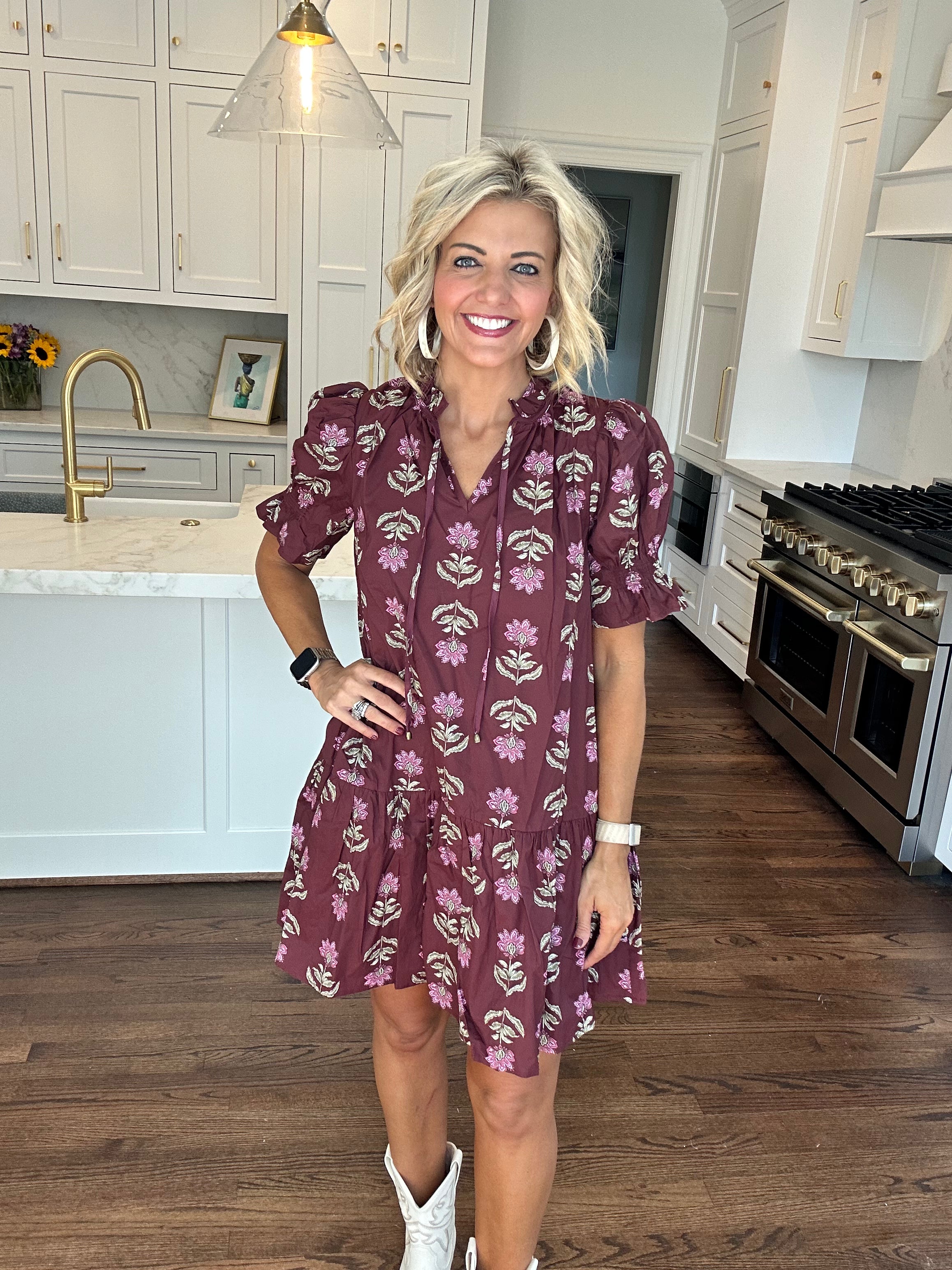 Burgundy Floral Print Smocked Finish Puff Sleeve Dress