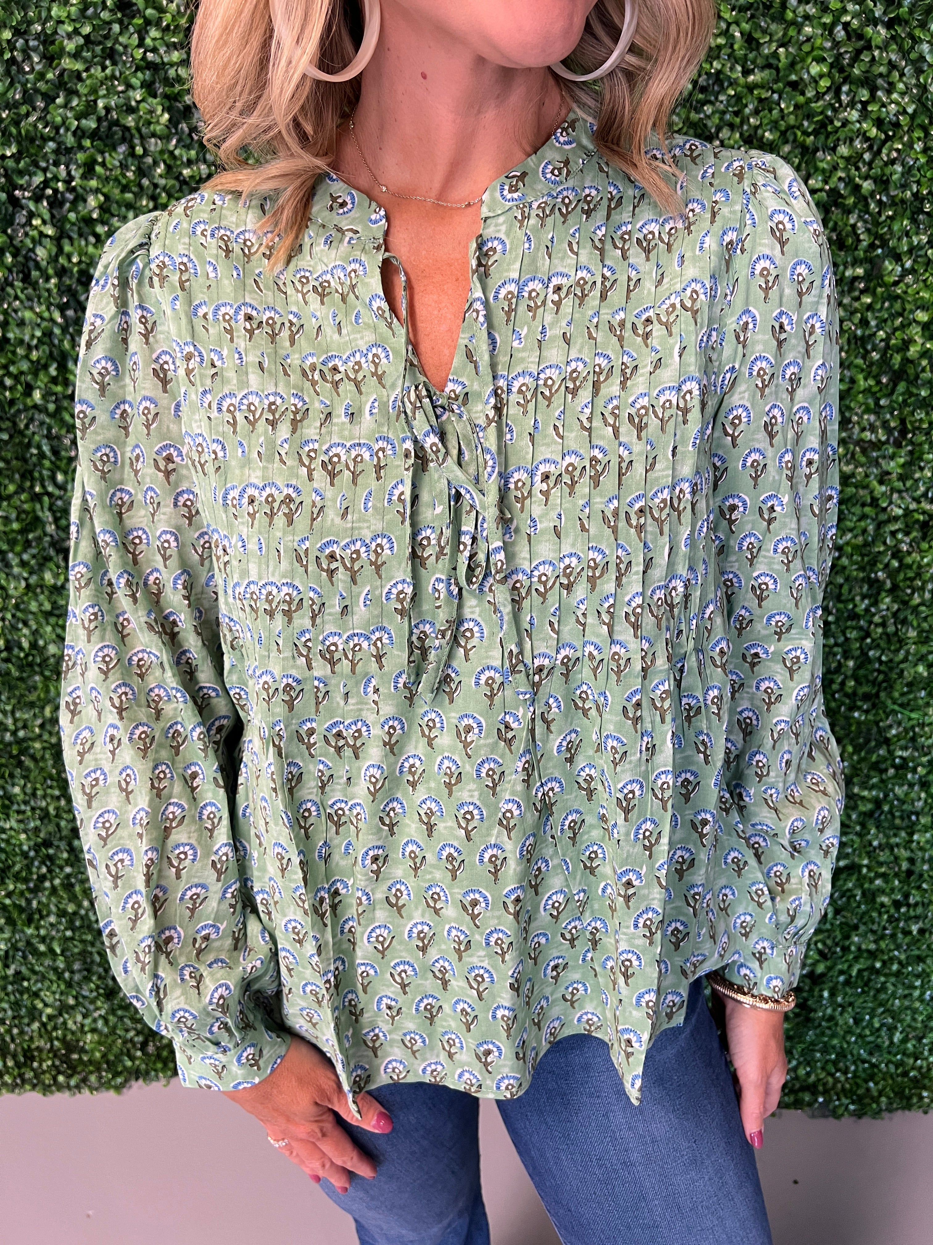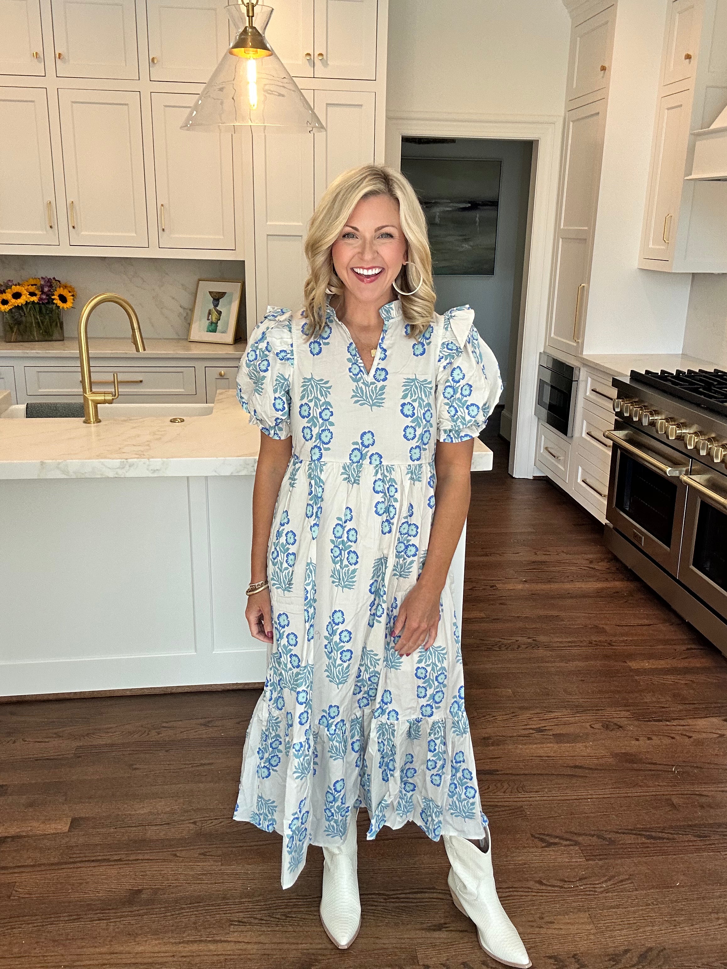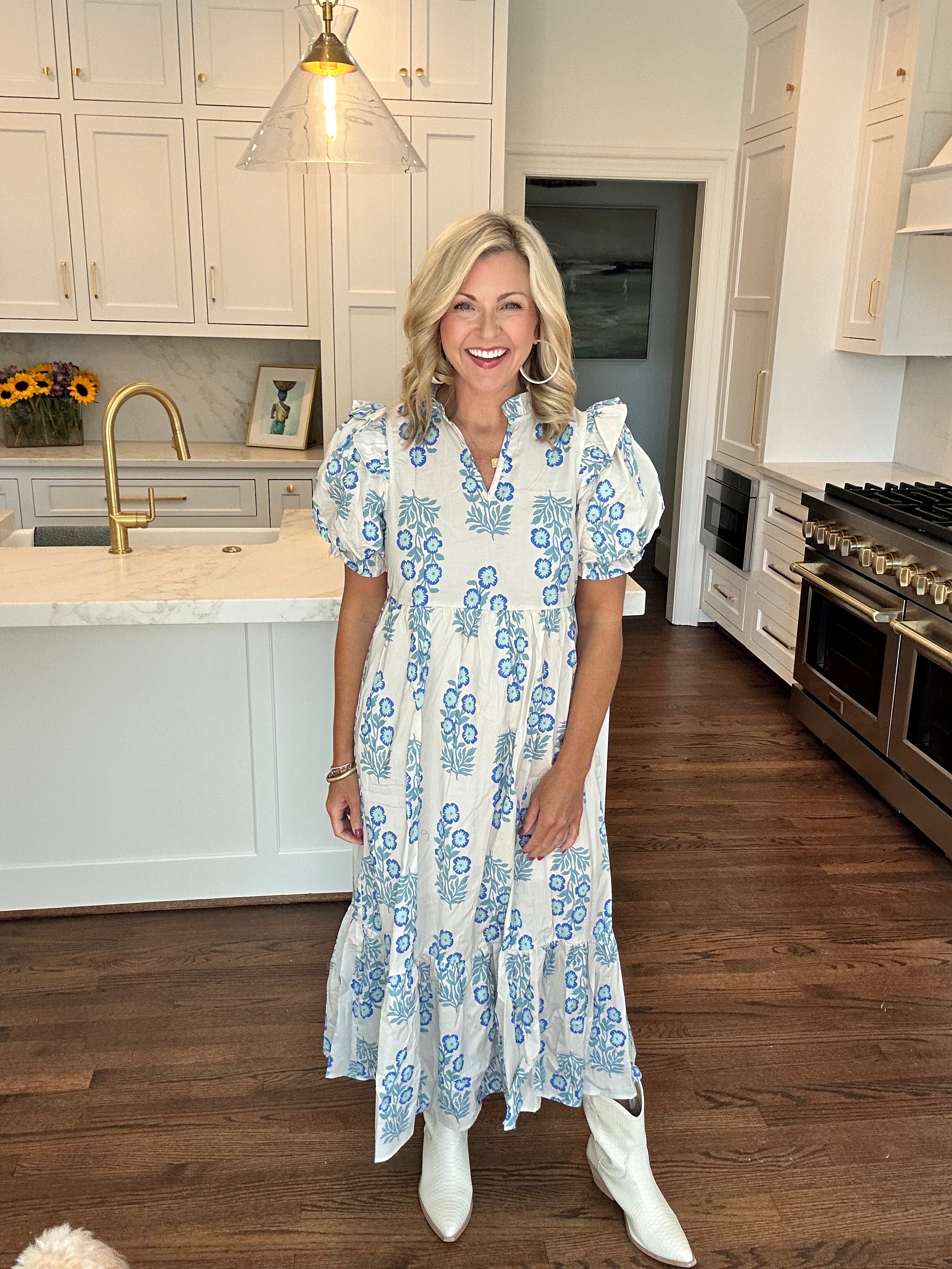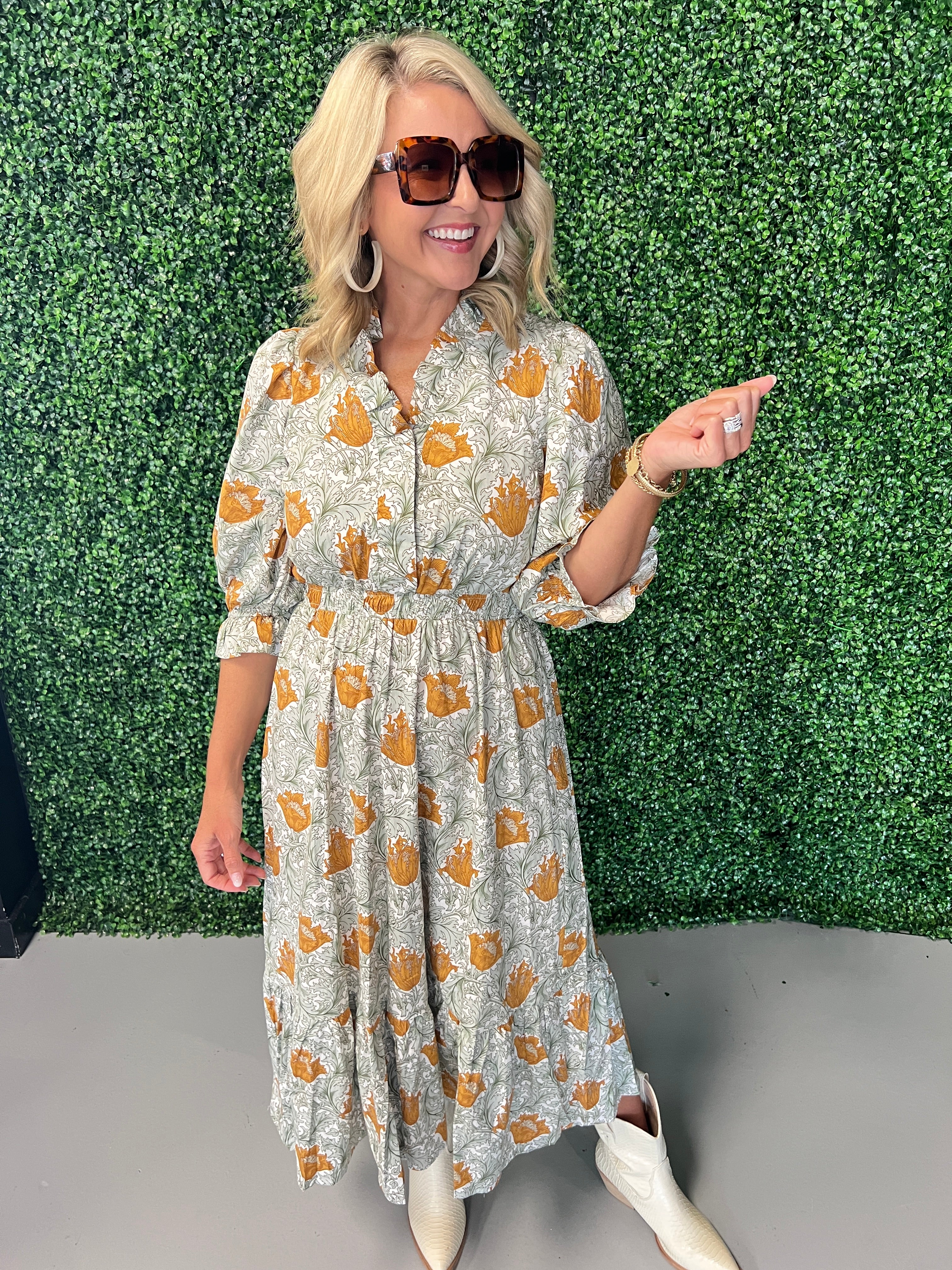 Sage Puff Sleeve Smocked Floral Midi Dress