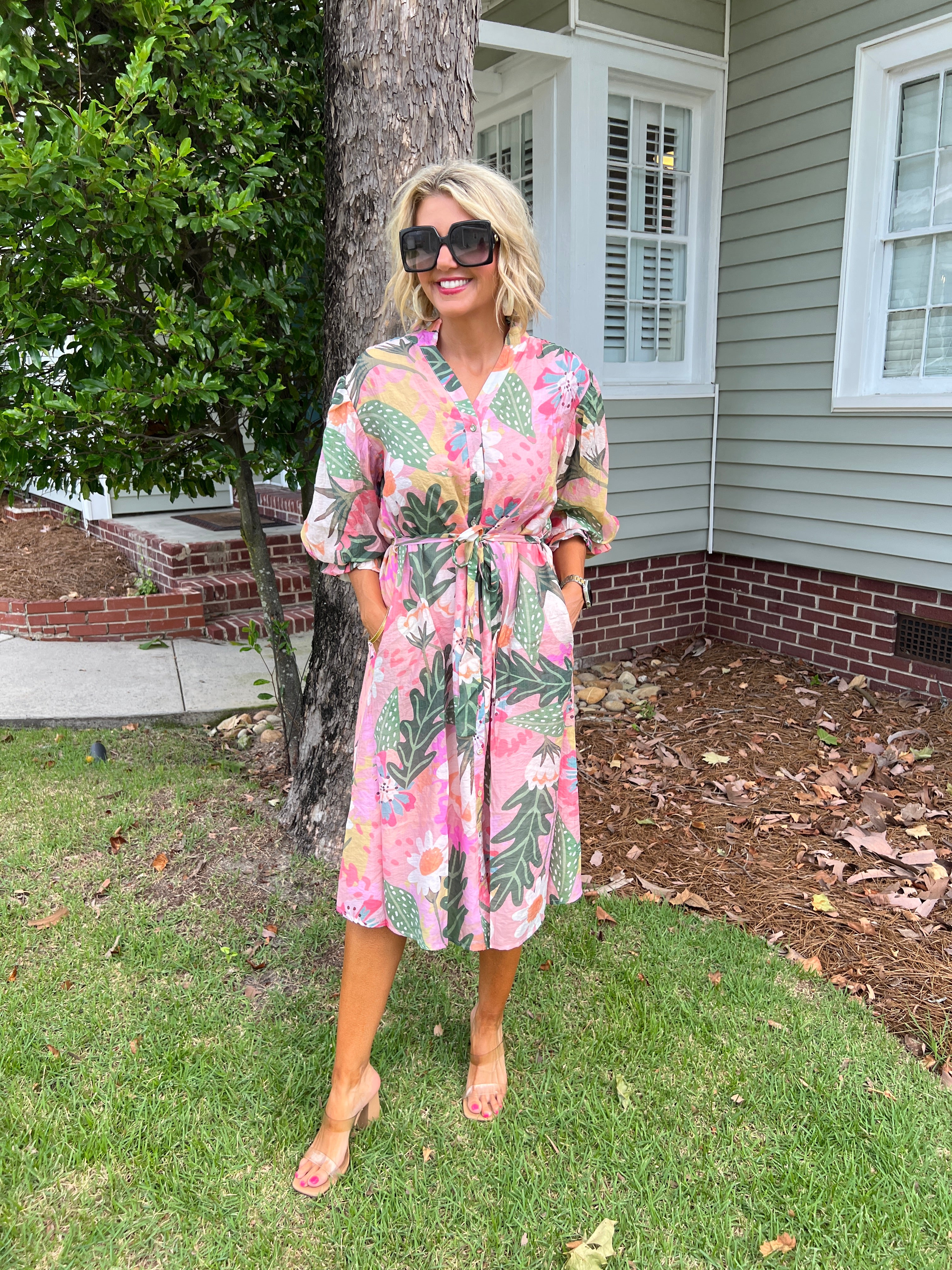 Pink Floral Mix Midi Shirt Dress