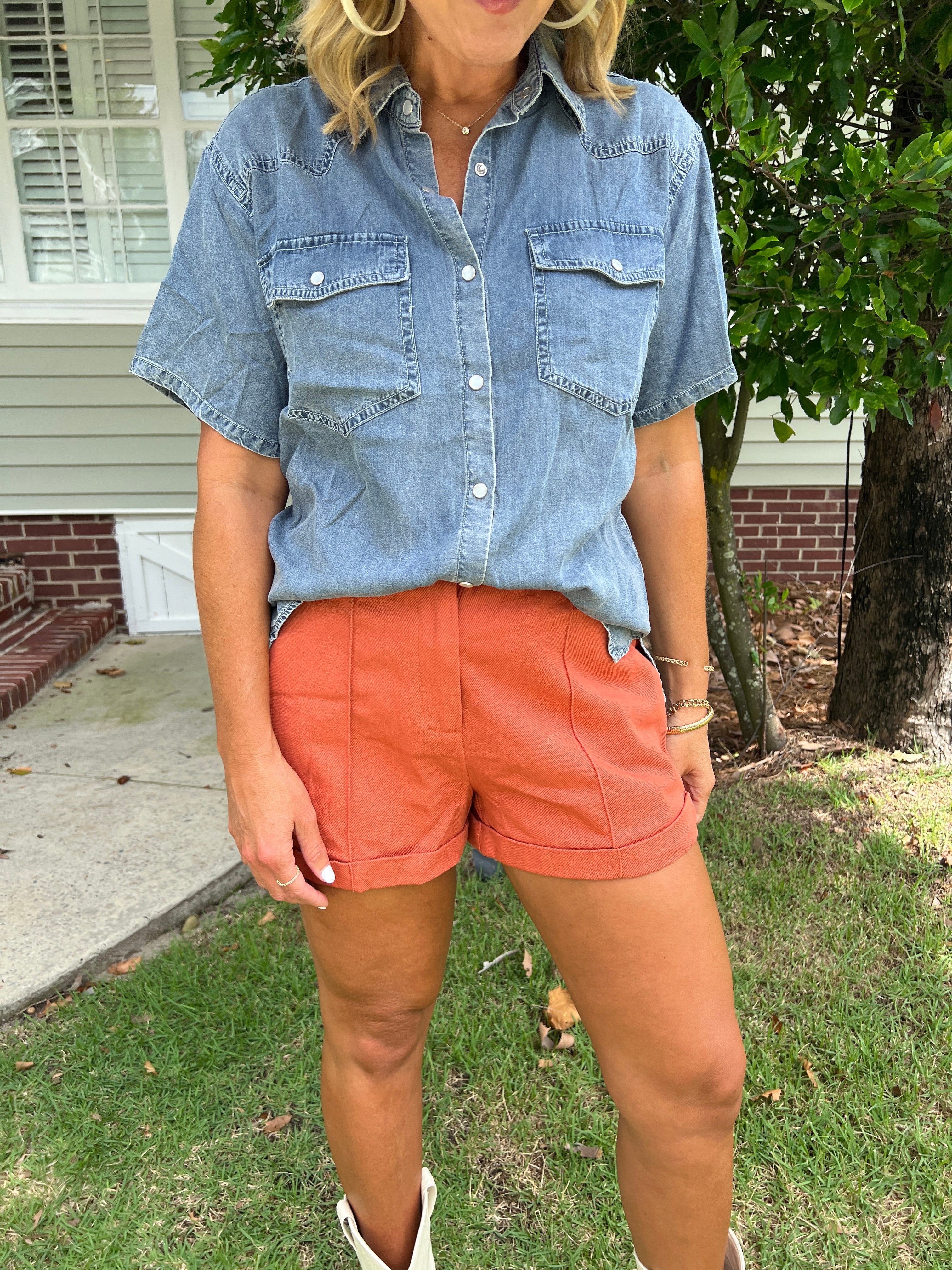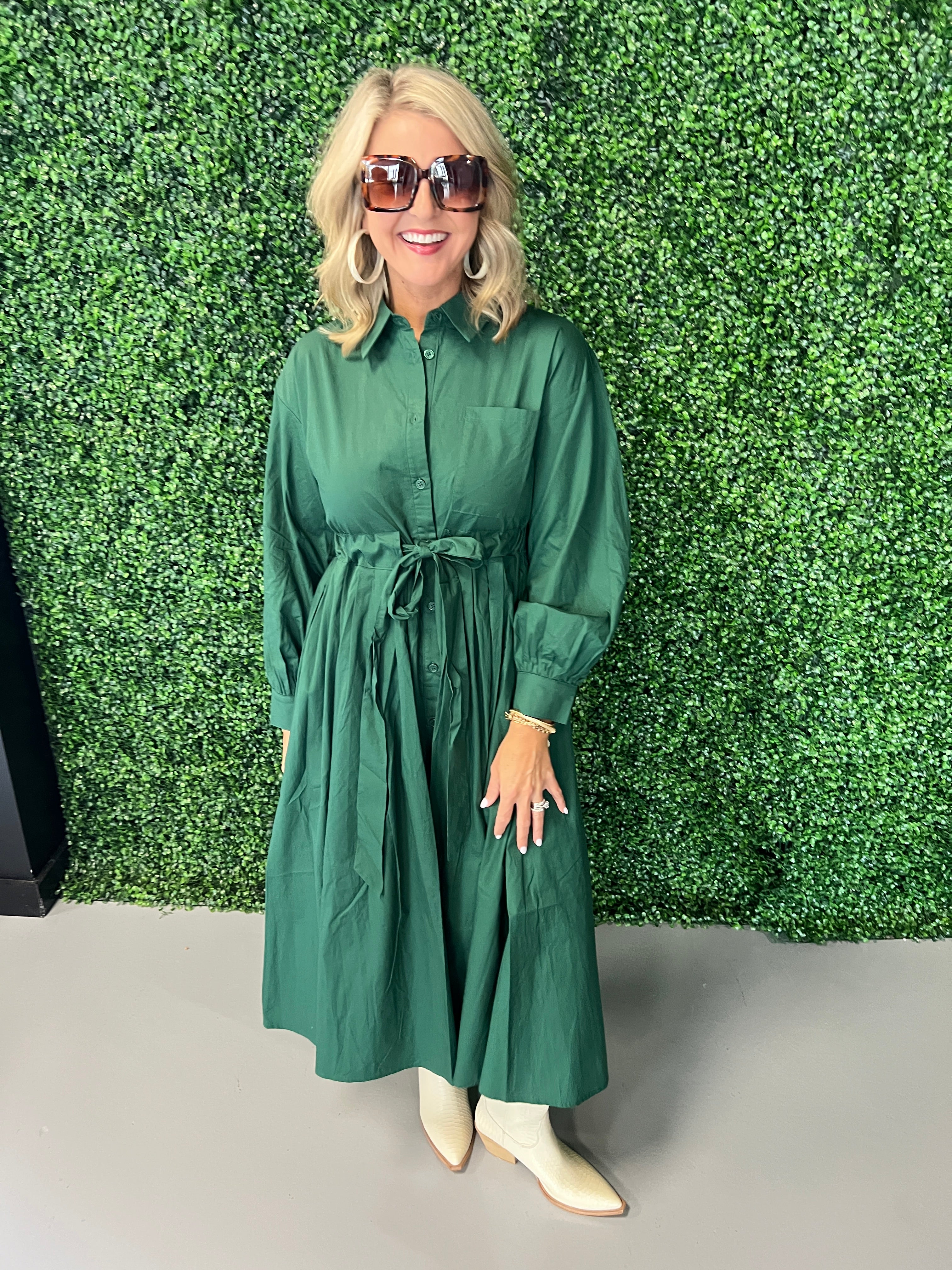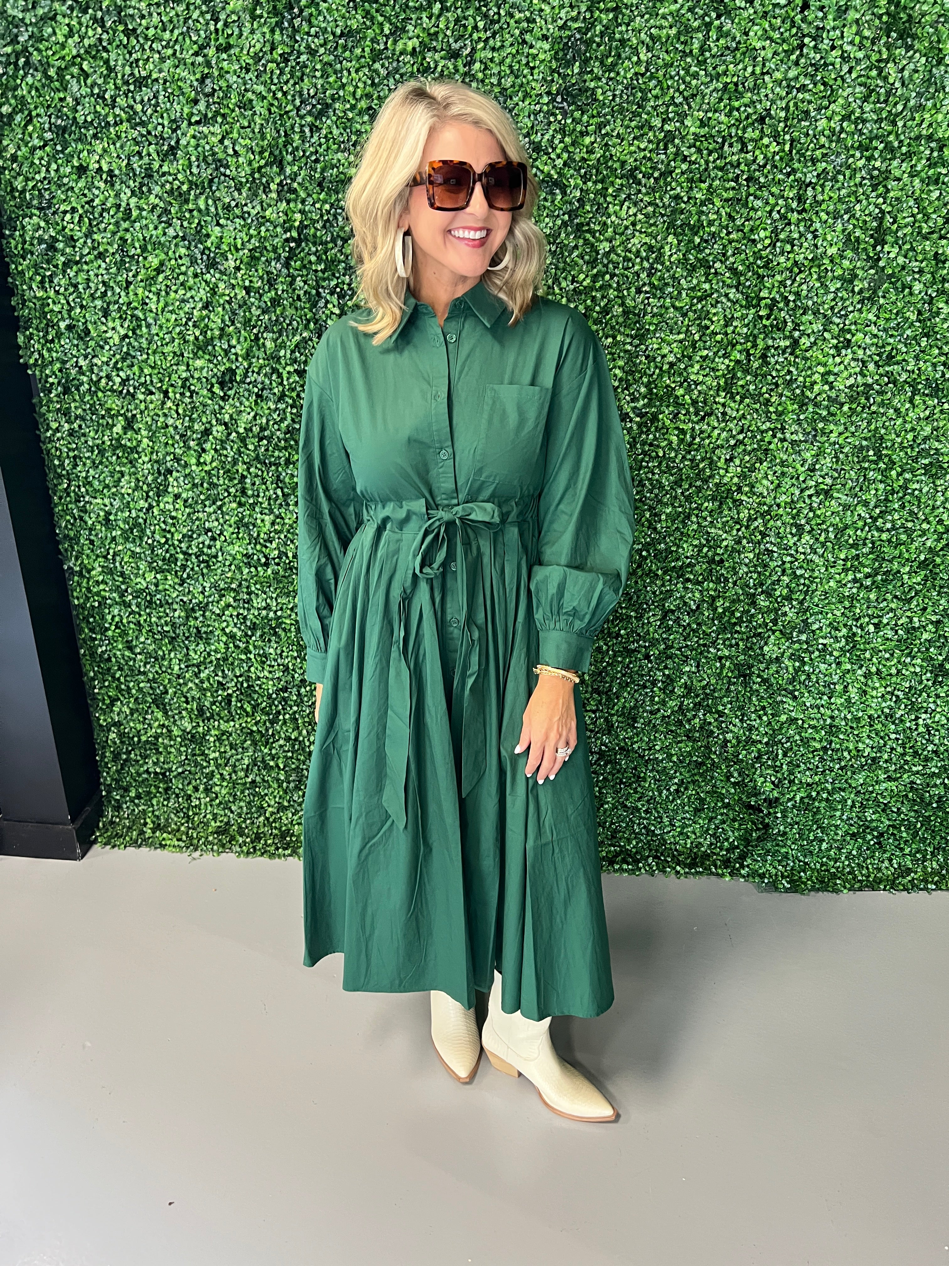 Front Pleat Accent Button Down Midi Dress