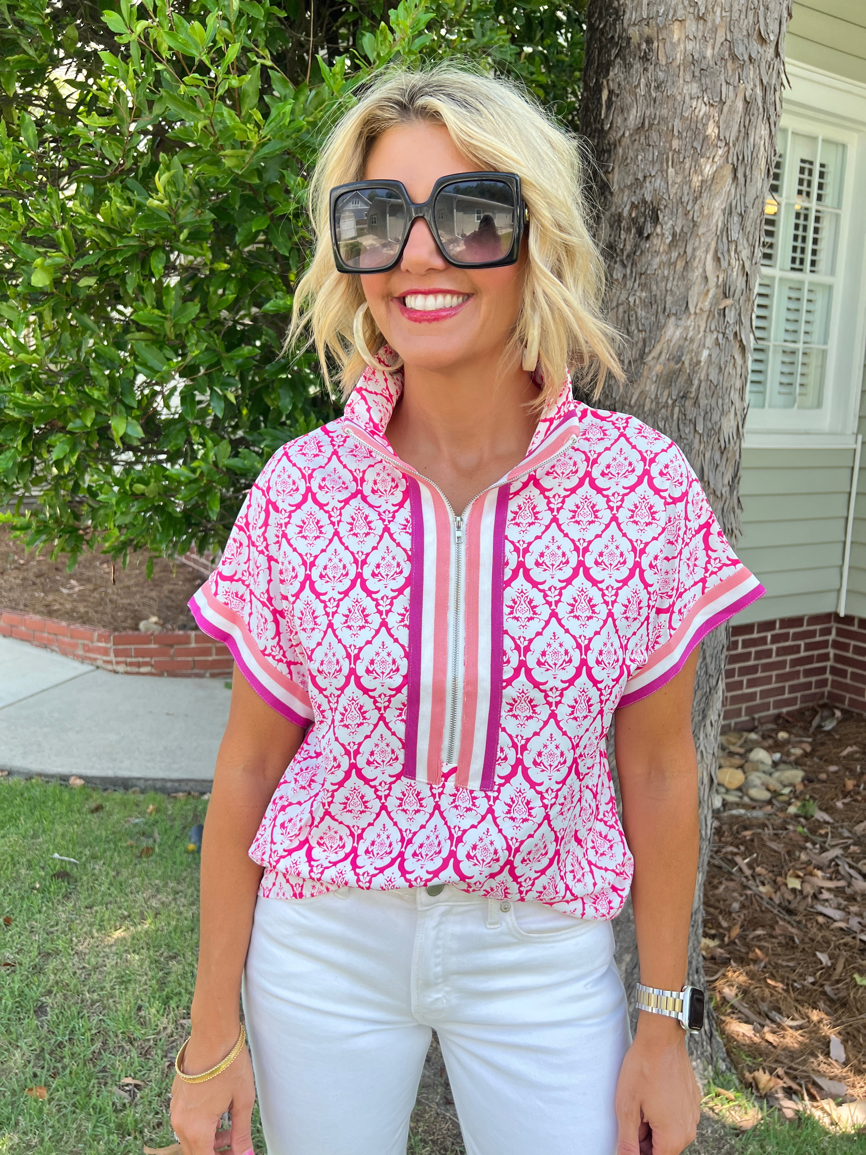 Abstract Zip Neck Short Sleeve Blouse