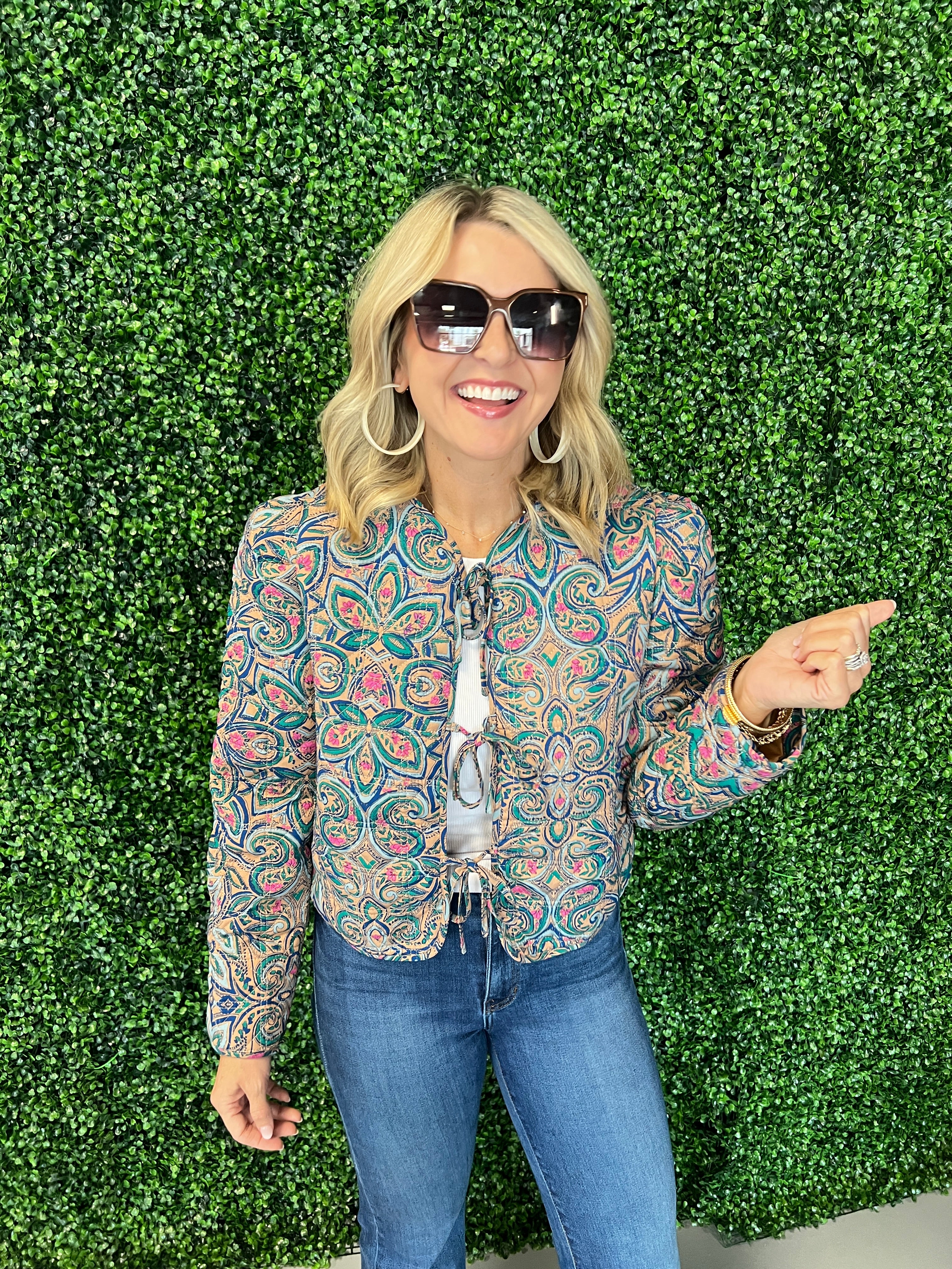 Quilted Print Jacket w/ Bow Tie Front