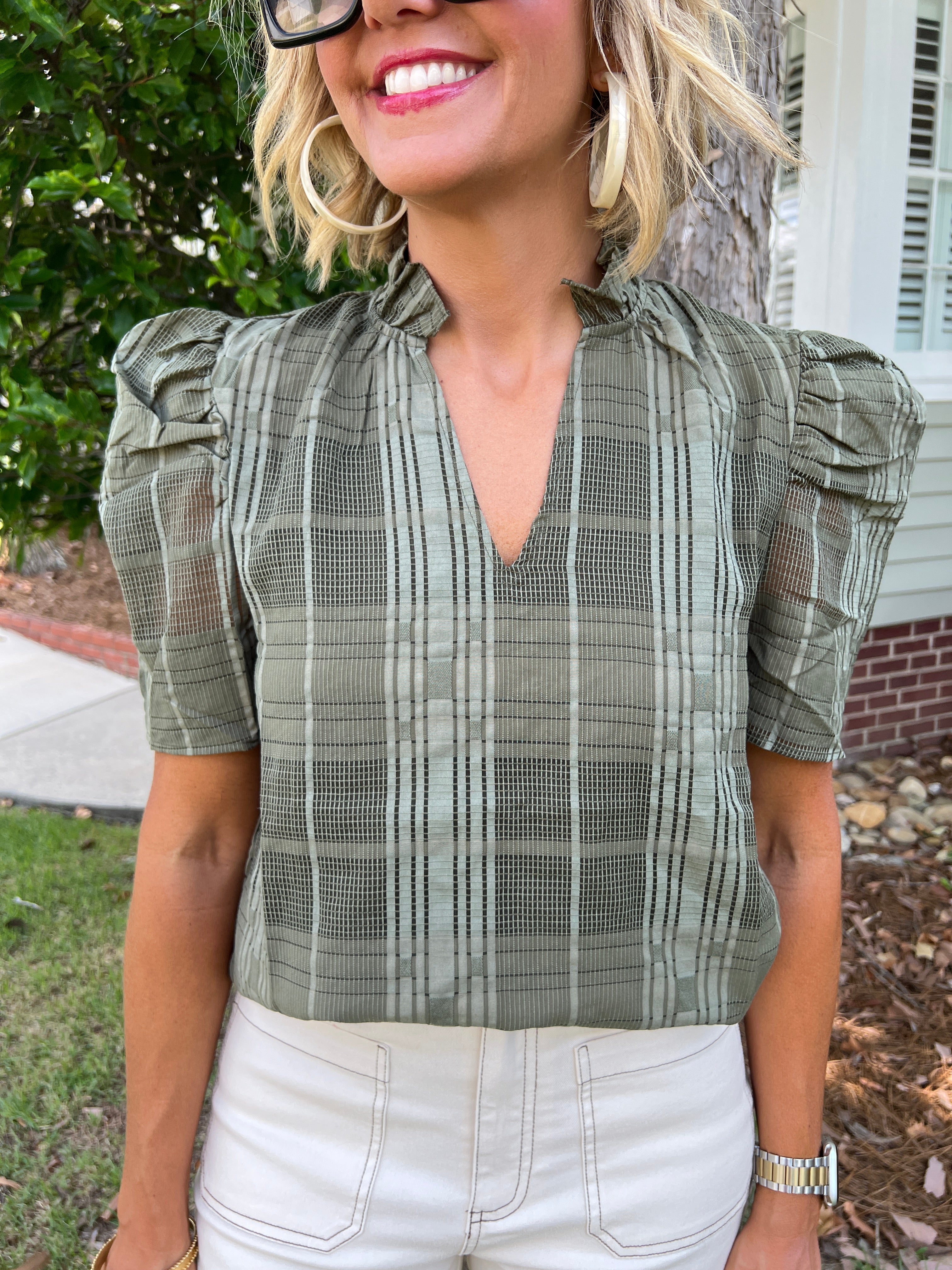 Puff Sleeve Gingham Textured V-Neck Top