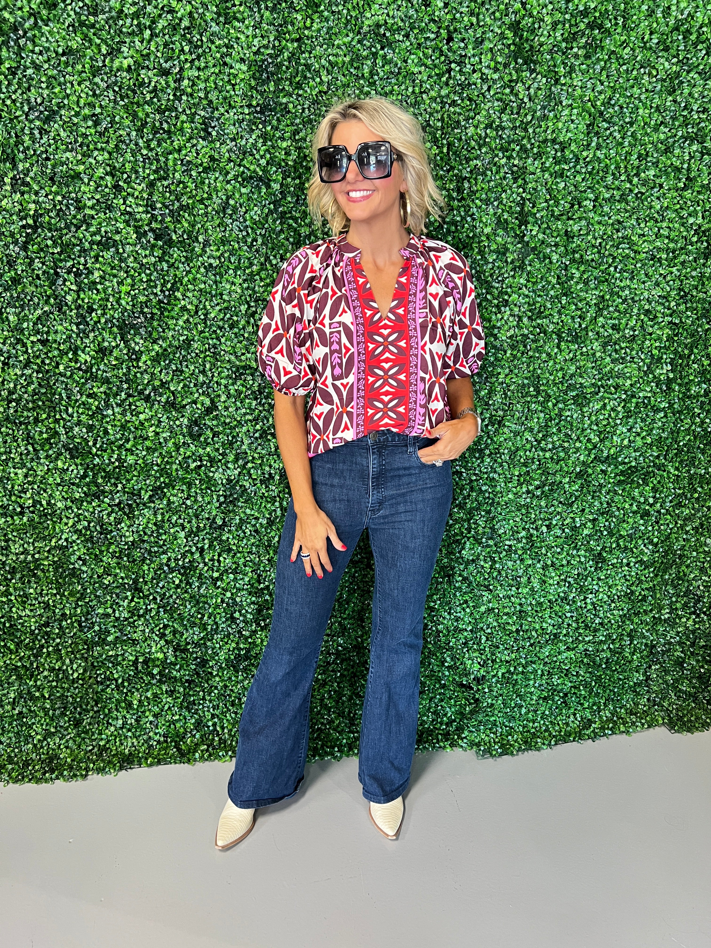 Elevate your fall wardrobe with this Abstract Magenta Blouse, featuring a striking blend of magenta, maroon, and red in bold autumn hues. Its flattering V-neck design adds a touch of elegance, making it perfect for both casual outings and stylish office looks. Embrace the season��s vibrant colors while enjoying a comfortable, eye-catching top that effortlessly enhances your style.
