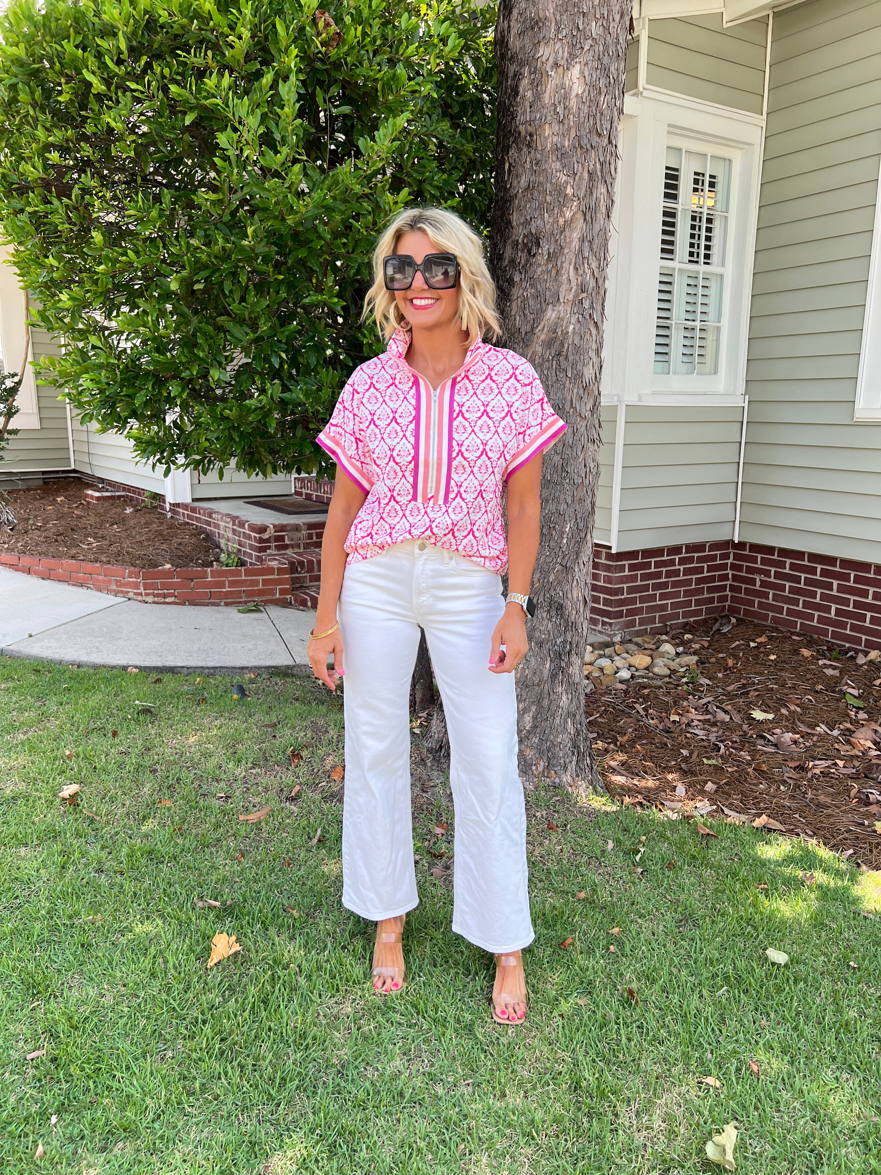 Elevate your wardrobe with the Abstract Zip Neck Short Sleeve Blouse, designed for effortless style and comfort. Its sleek zip neckline adds a modern edge, while the short sleeves keep you cool and versatile for any occasion. Perfect for pairing with both casual and professional looks, this blouse combines contemporary design with everyday ease. Make a statement with a piece that��s as dynamic as you are.
