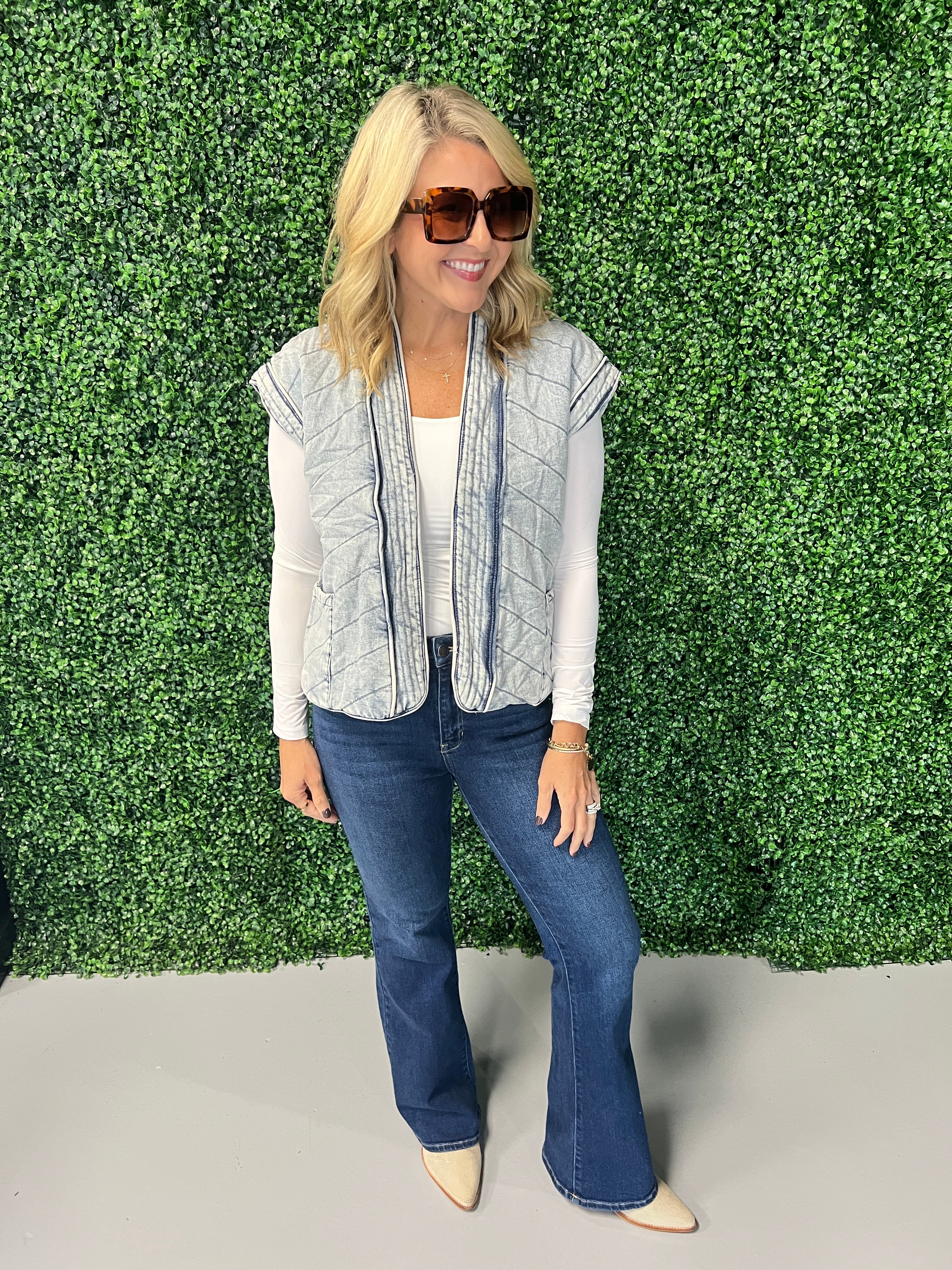 Elevate your casual wardrobe with this Kimono Style Open Front Vintage Denim Vest. Its relaxed, open-front design offers effortless layering, while the vintage denim brings timeless appeal. Perfect for adding a touch of unique style to any outfit, this vest combines comfort and versatility, making it an essential piece for those who want to stand out with subtle edge.
