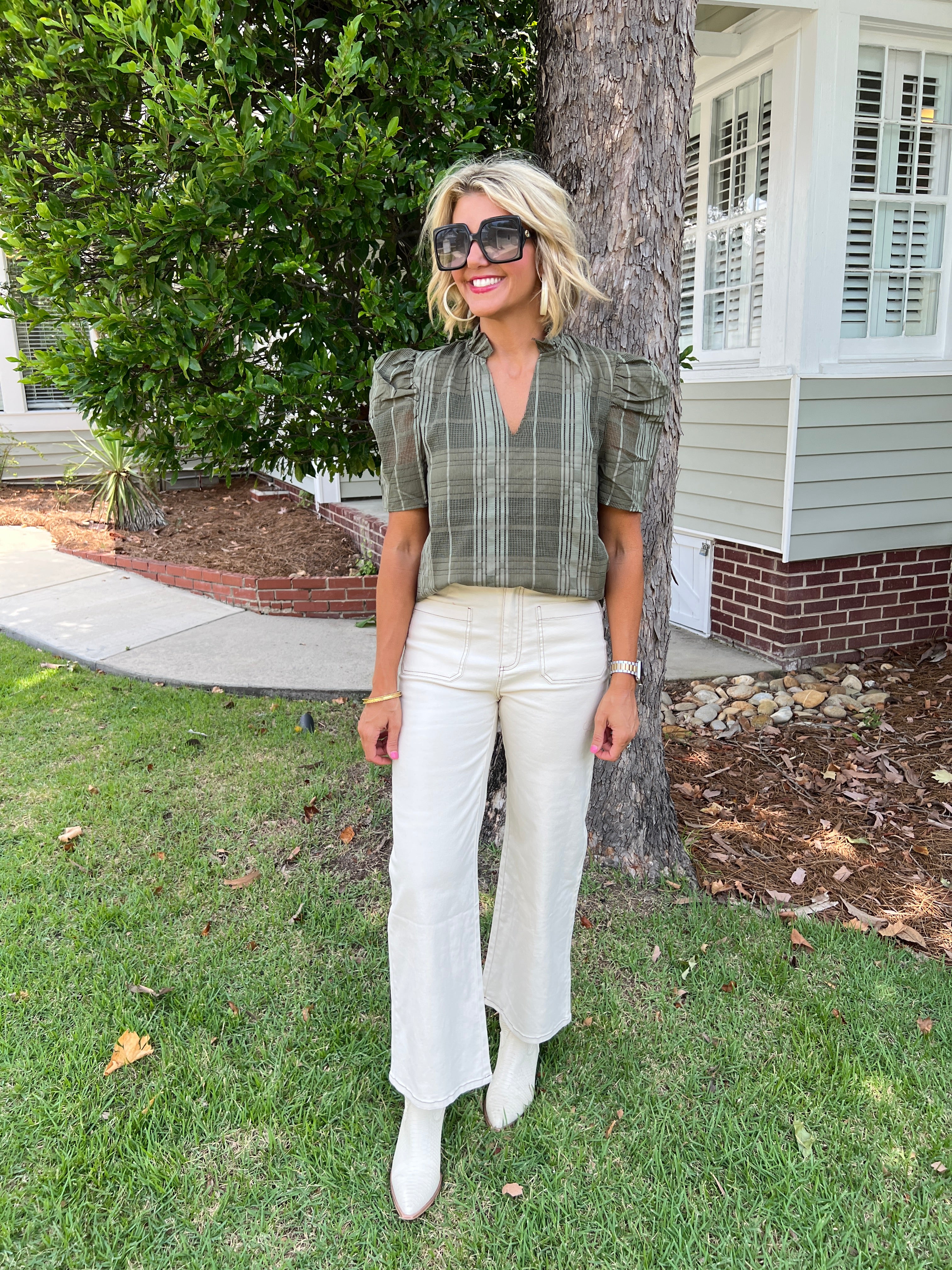 Elevate your wardrobe with the Puff Sleeve Gingham Textured V-Neck Top, designed to blend classic charm with modern style. Its delicate gingham pattern and textured fabric add visual interest, while the puff sleeves create a flattering silhouette. The V-neckline enhances your neckline, making it perfect for both casual outings and dressier occasions. Comfortable and chic, this top effortlessly brings a fresh, feminine touch to any outfit.
