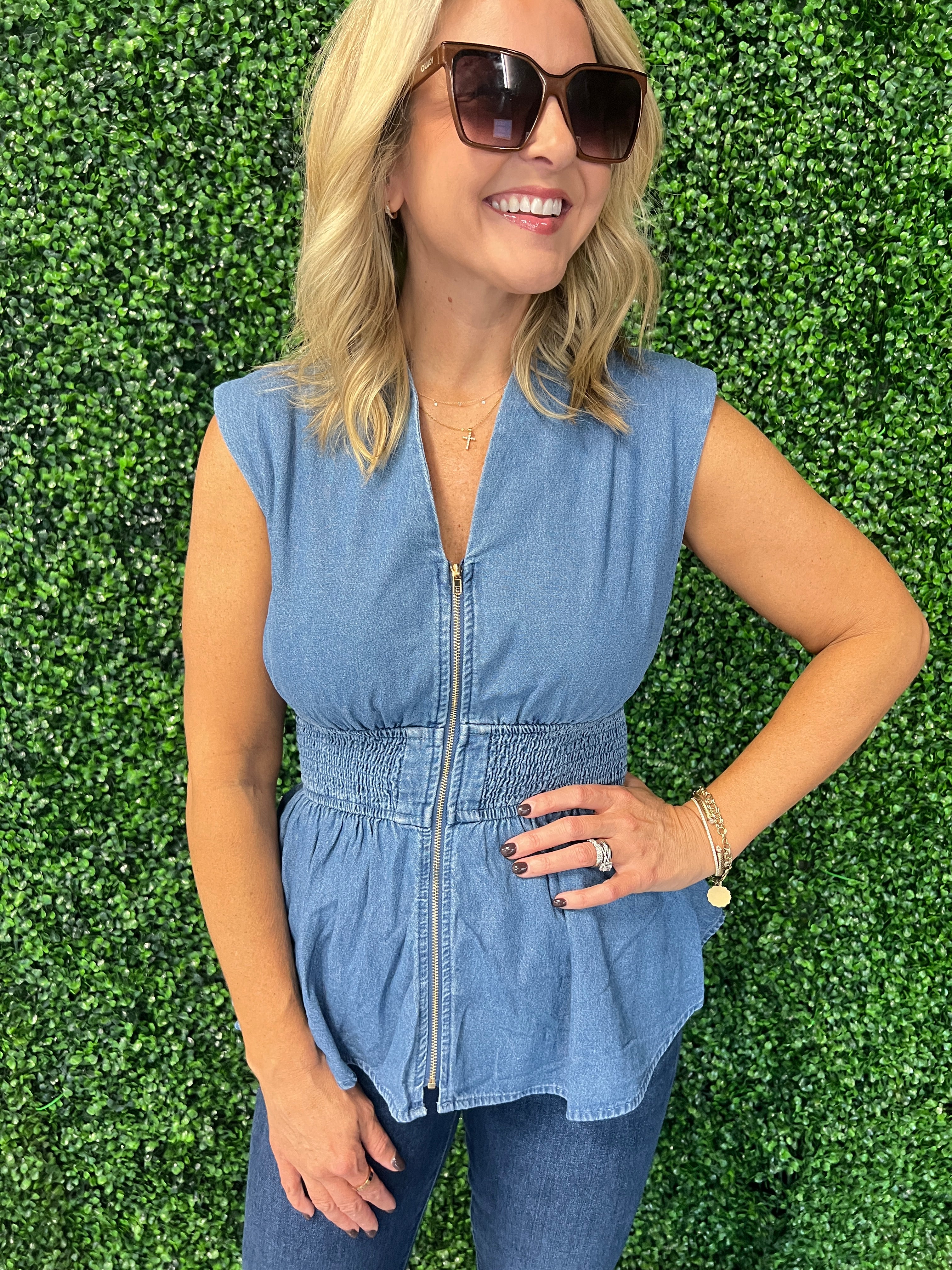 Elevate your wardrobe with this Solid Sleeveless Denim Peplum Top, designed to flatter every figure. Crafted from durable denim, its sleeveless cut keeps you cool while the peplum silhouette adds a chic, feminine flare. Perfect for day-to-night wear, this versatile top pairs effortlessly with jeans or skirts, making it a must-have staple that enhances your style with ease.