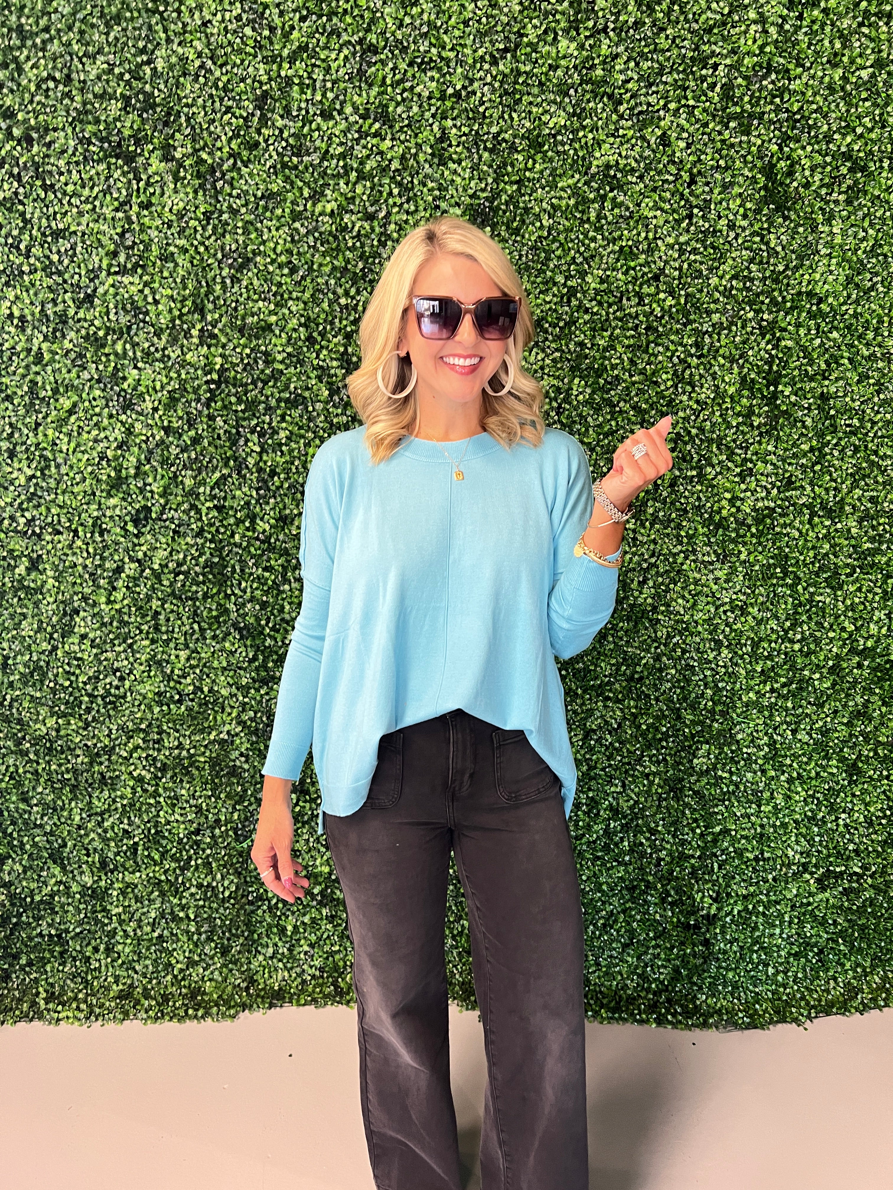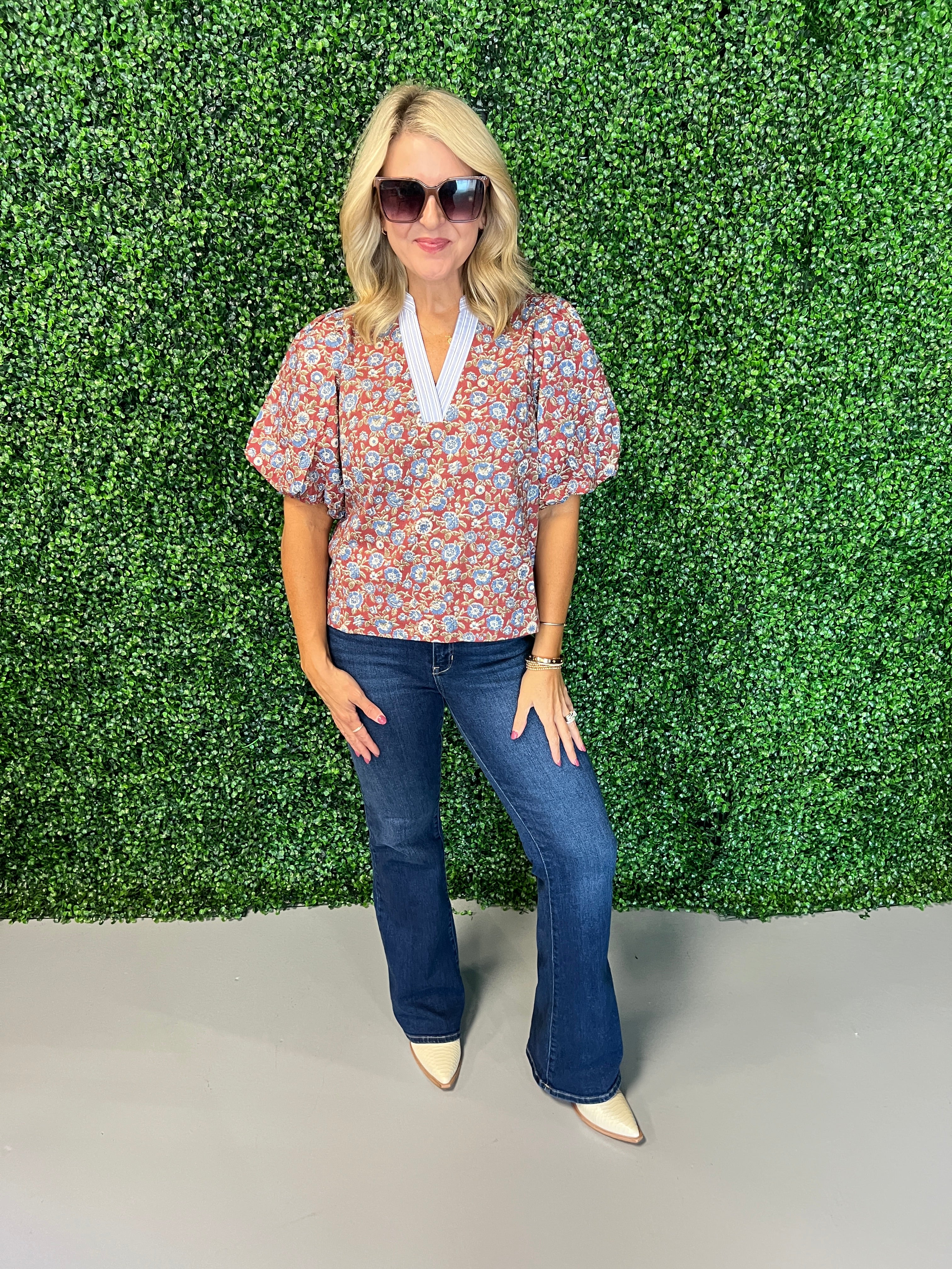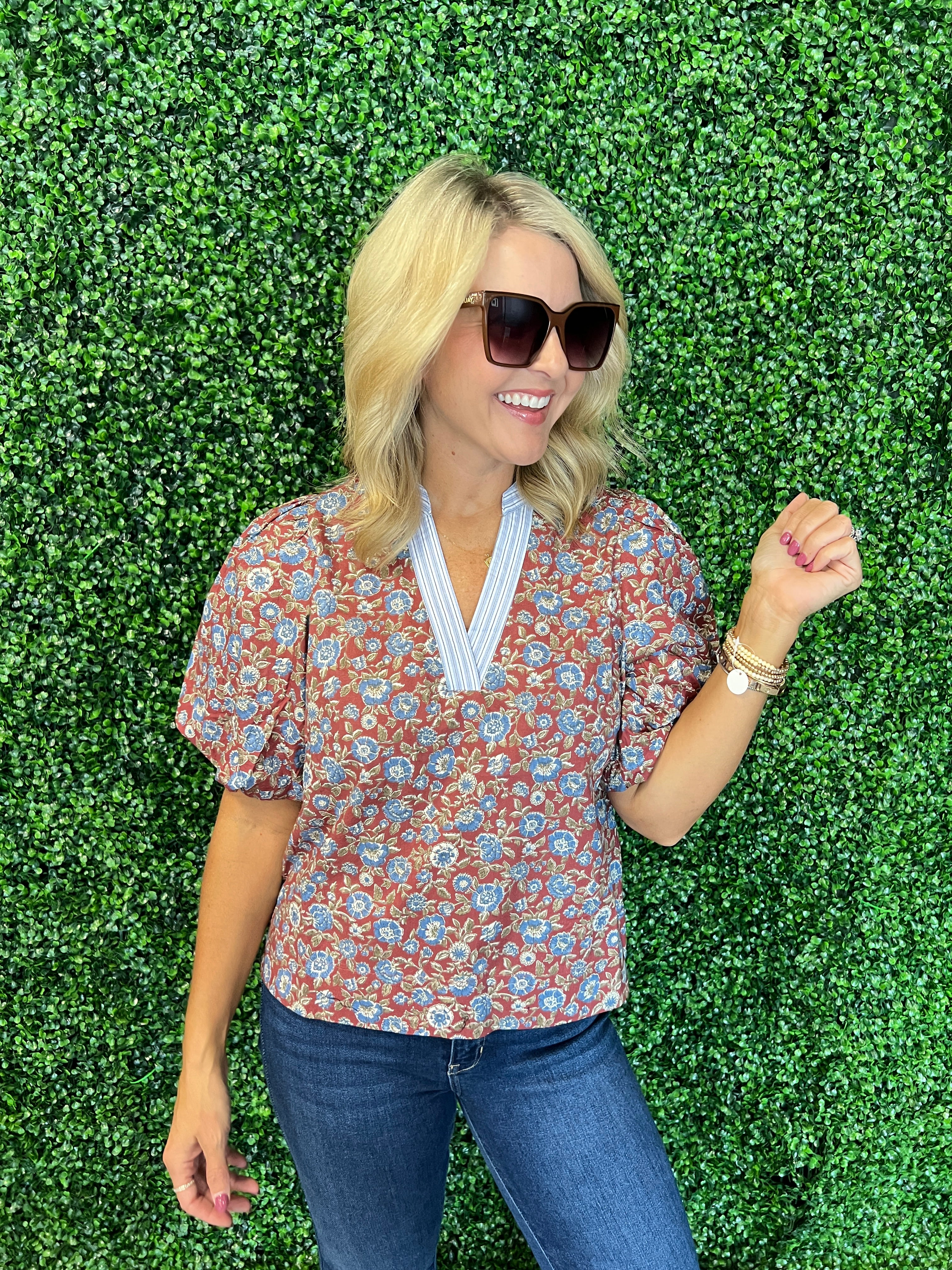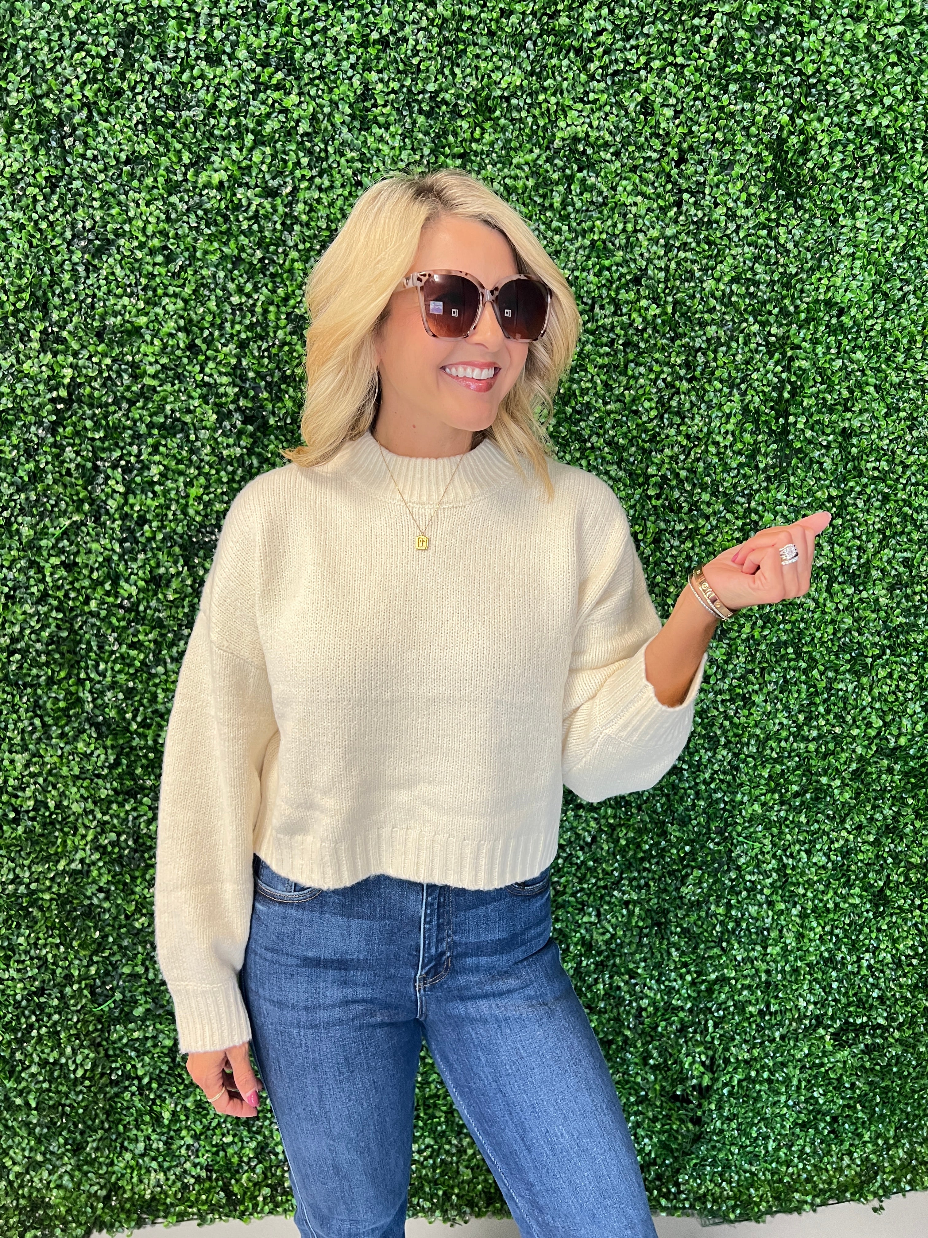 Brown & Blue Mock Neck Striped Cropped Sweater
