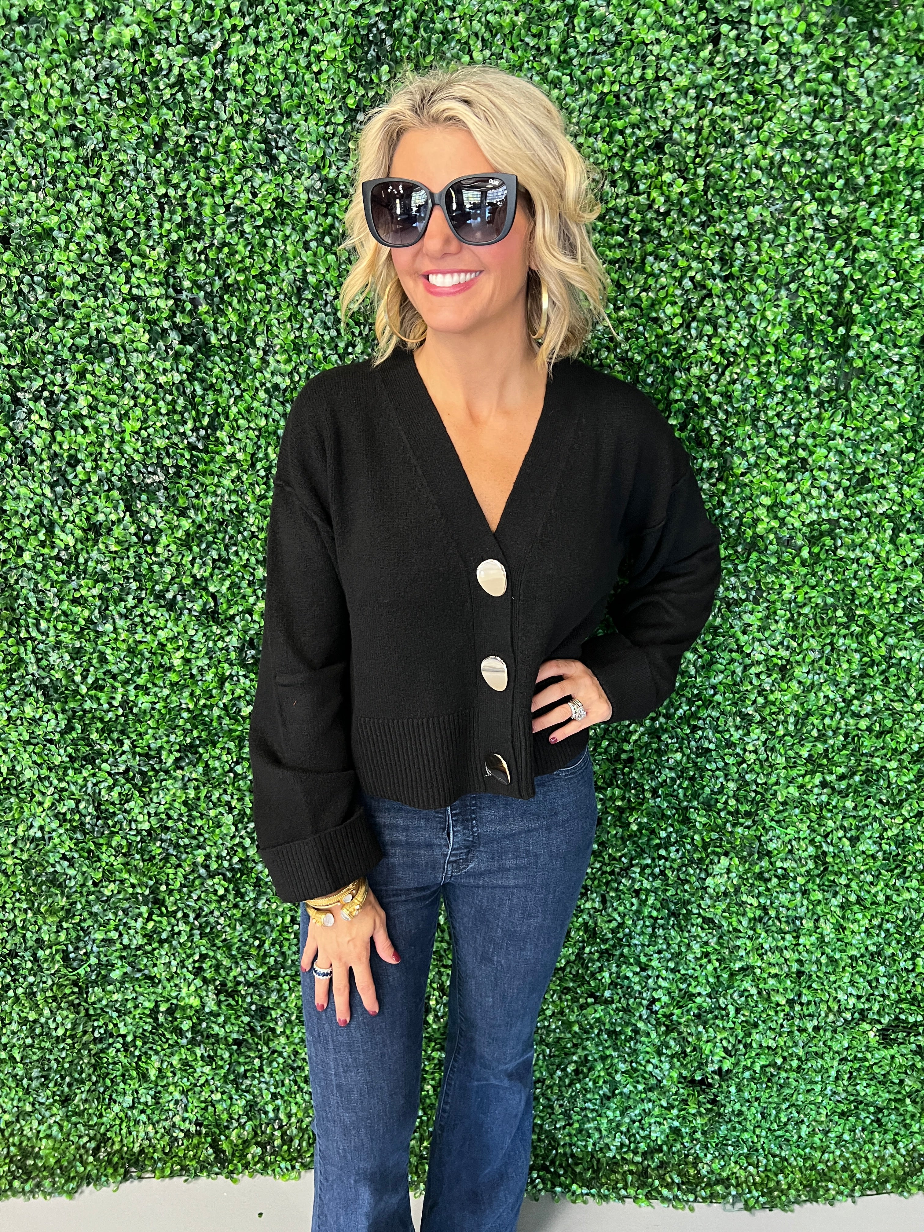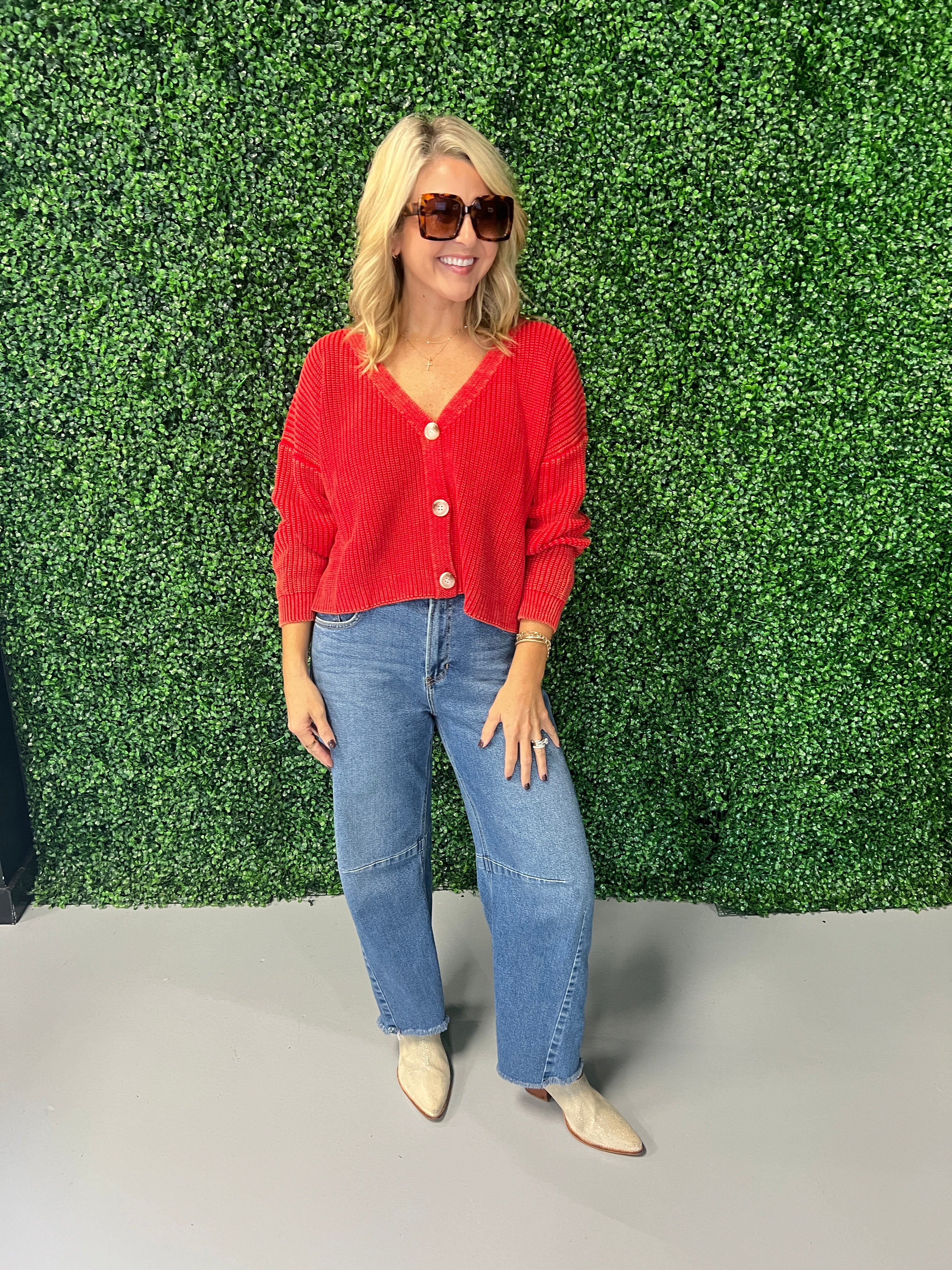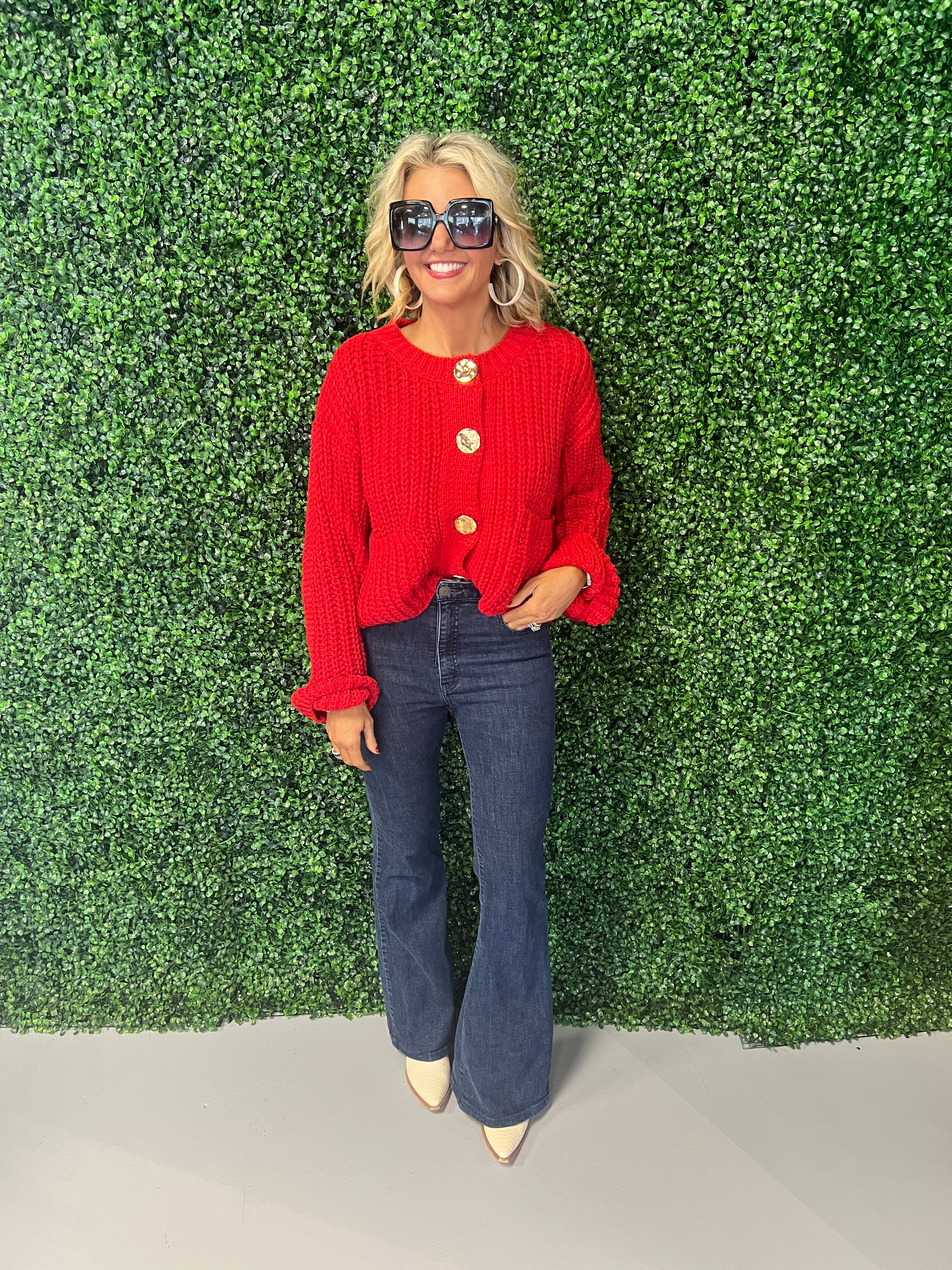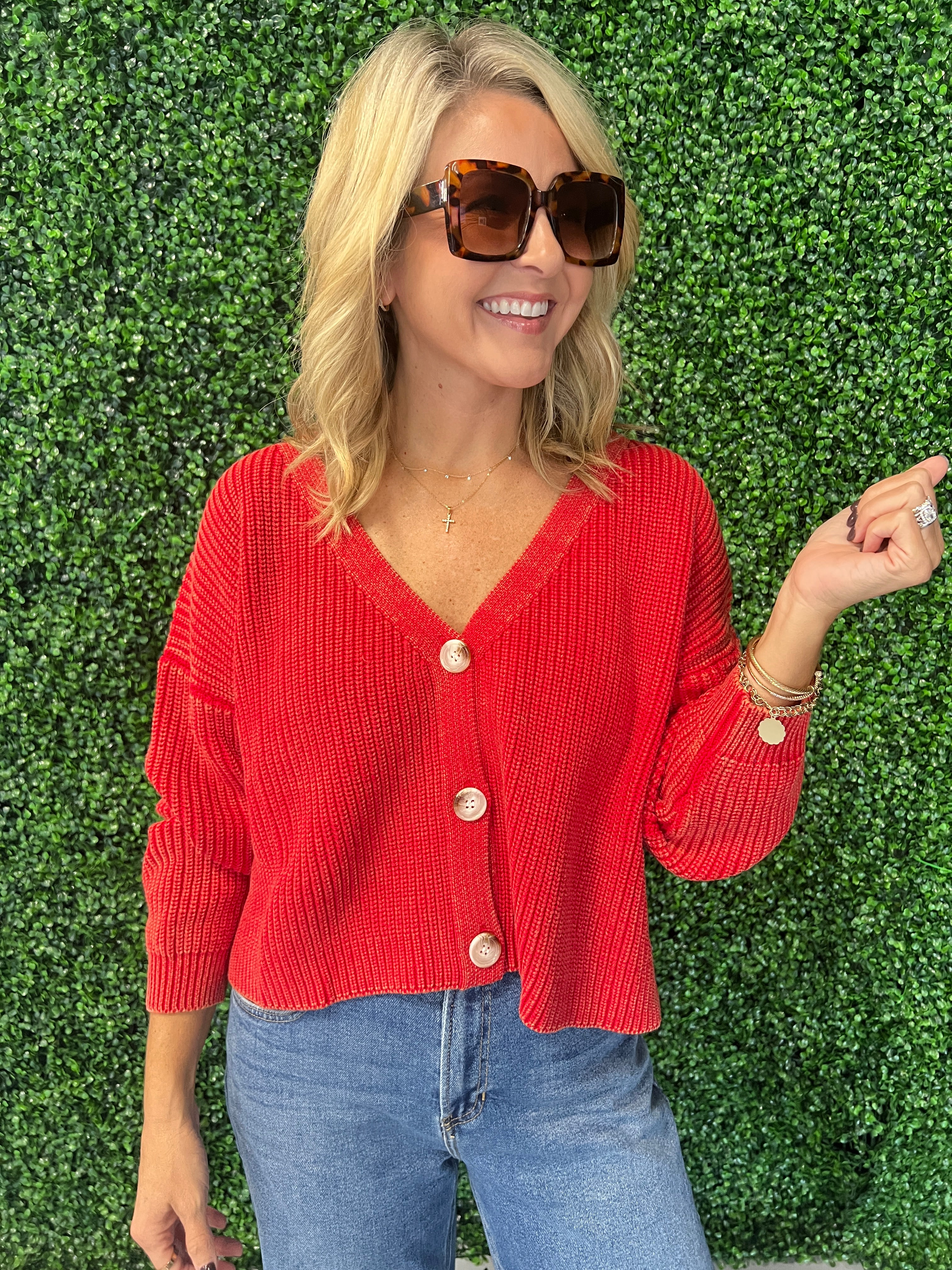 Red V-neck Buttoned Ribbed Long Sleeve Cardigan